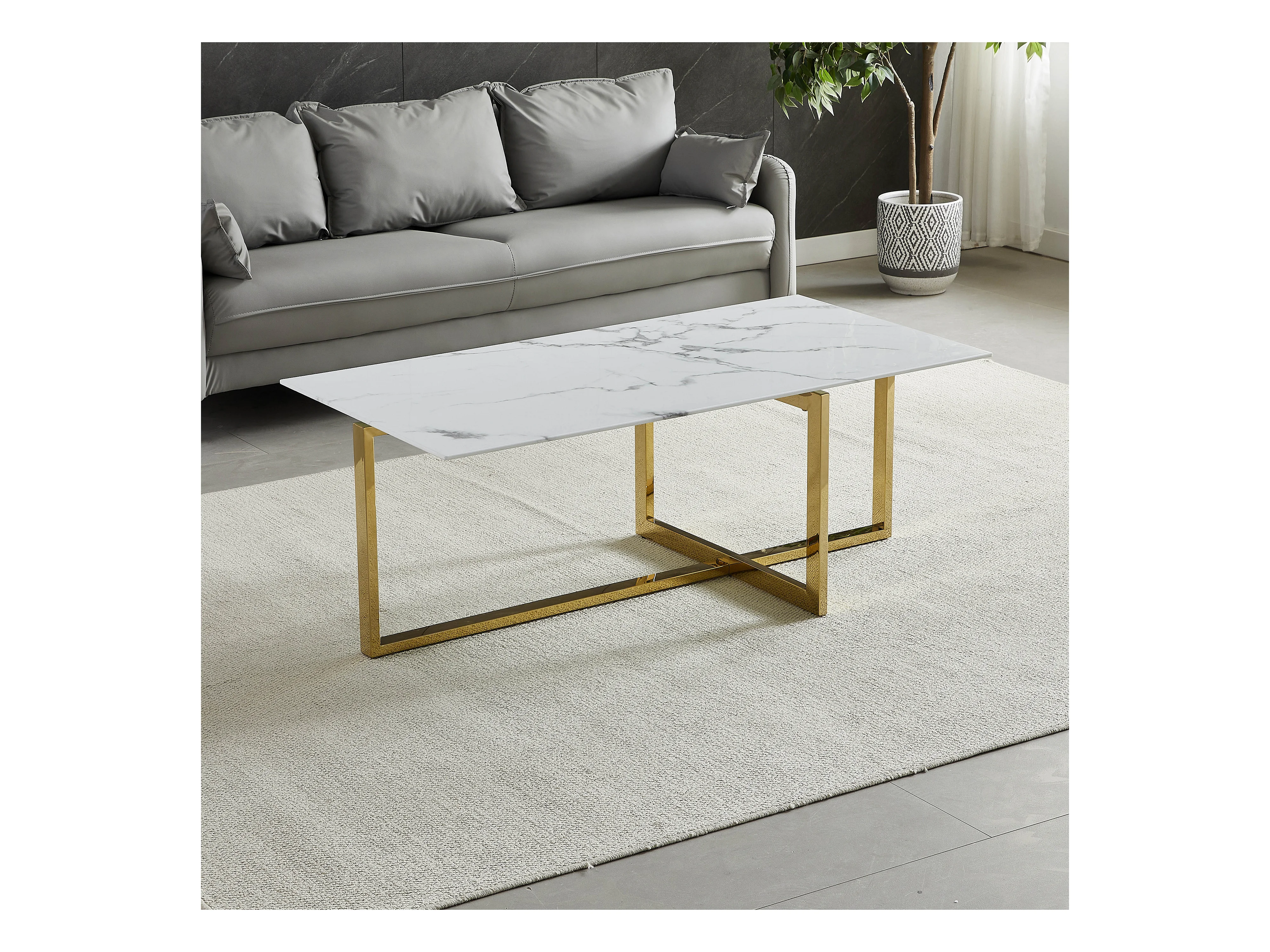 Table basse rectangulaire - Verre trempé effet marbre blanc - Métal doré - CHIARA