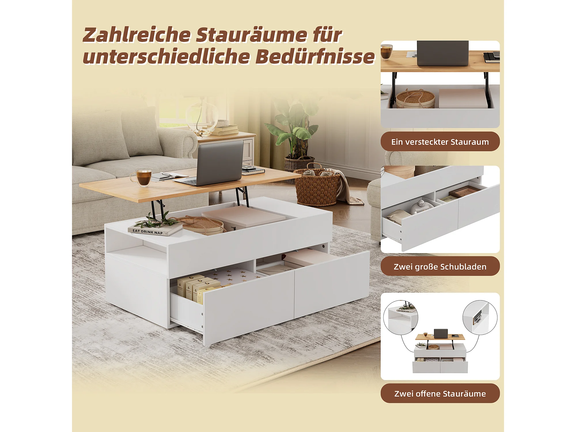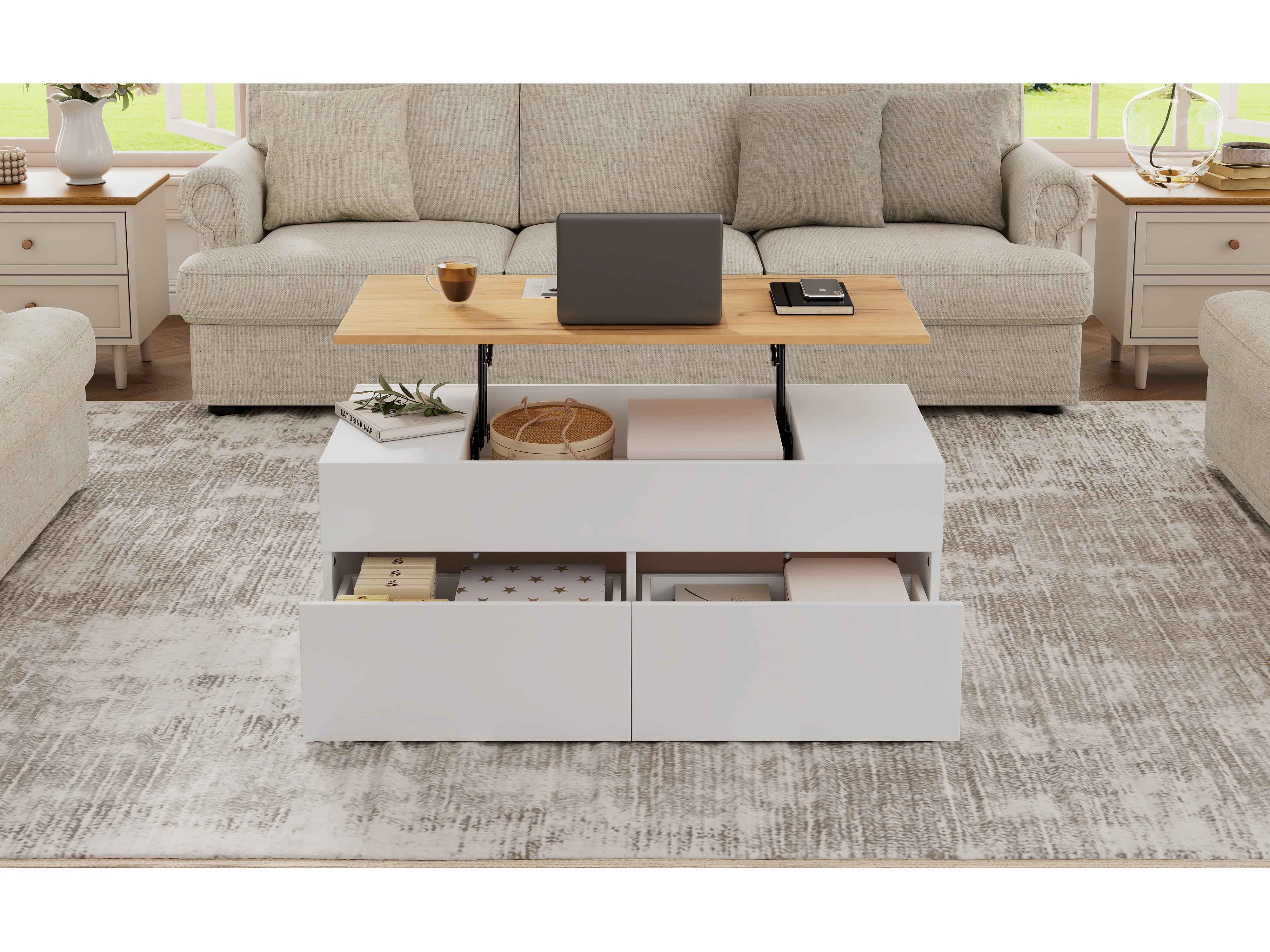Table basse réglable avec 2 tiroirs, stockage caché, design moderne, MDF + bois, blanc + bois naturel (100x50x40 cm)