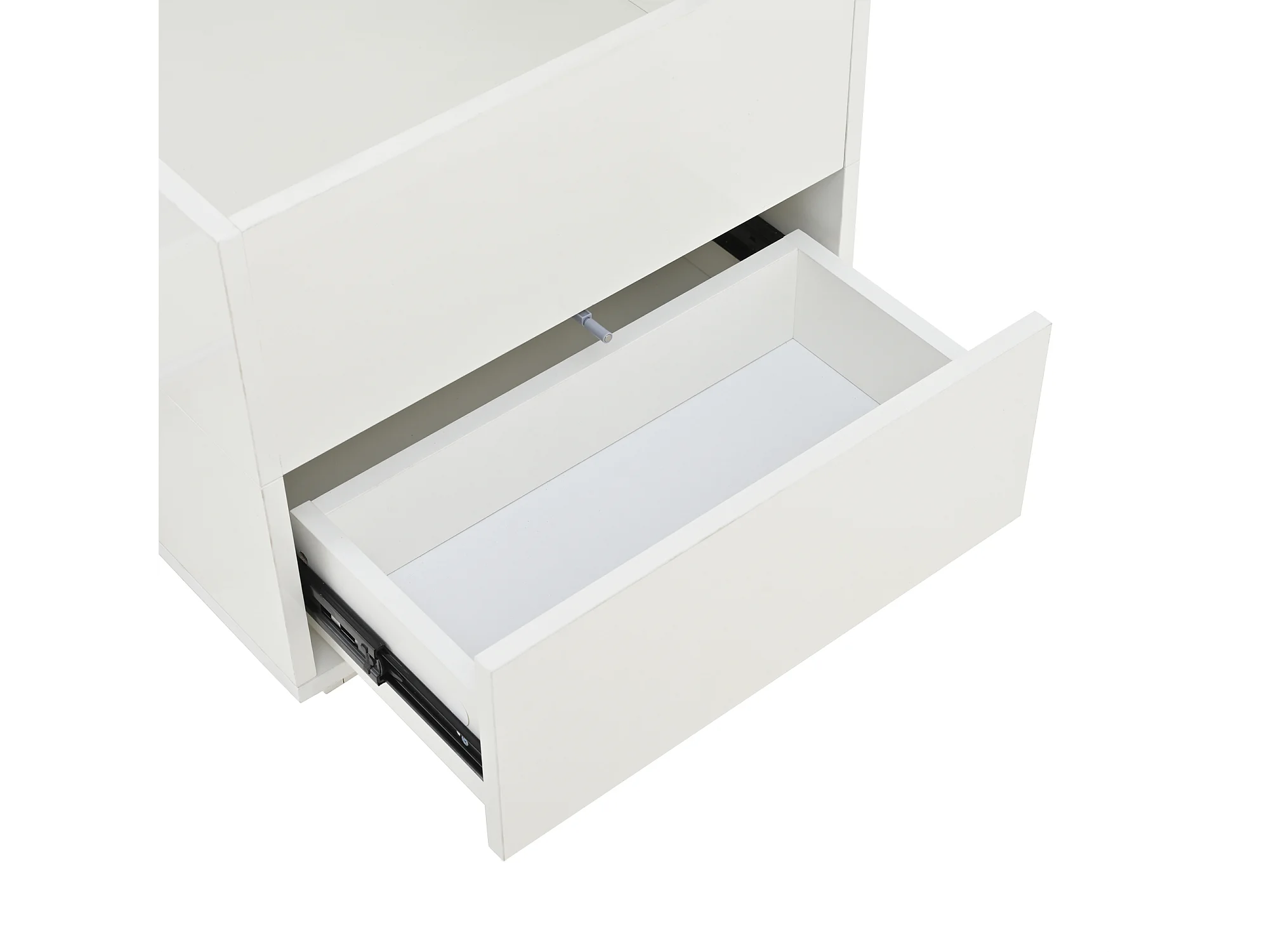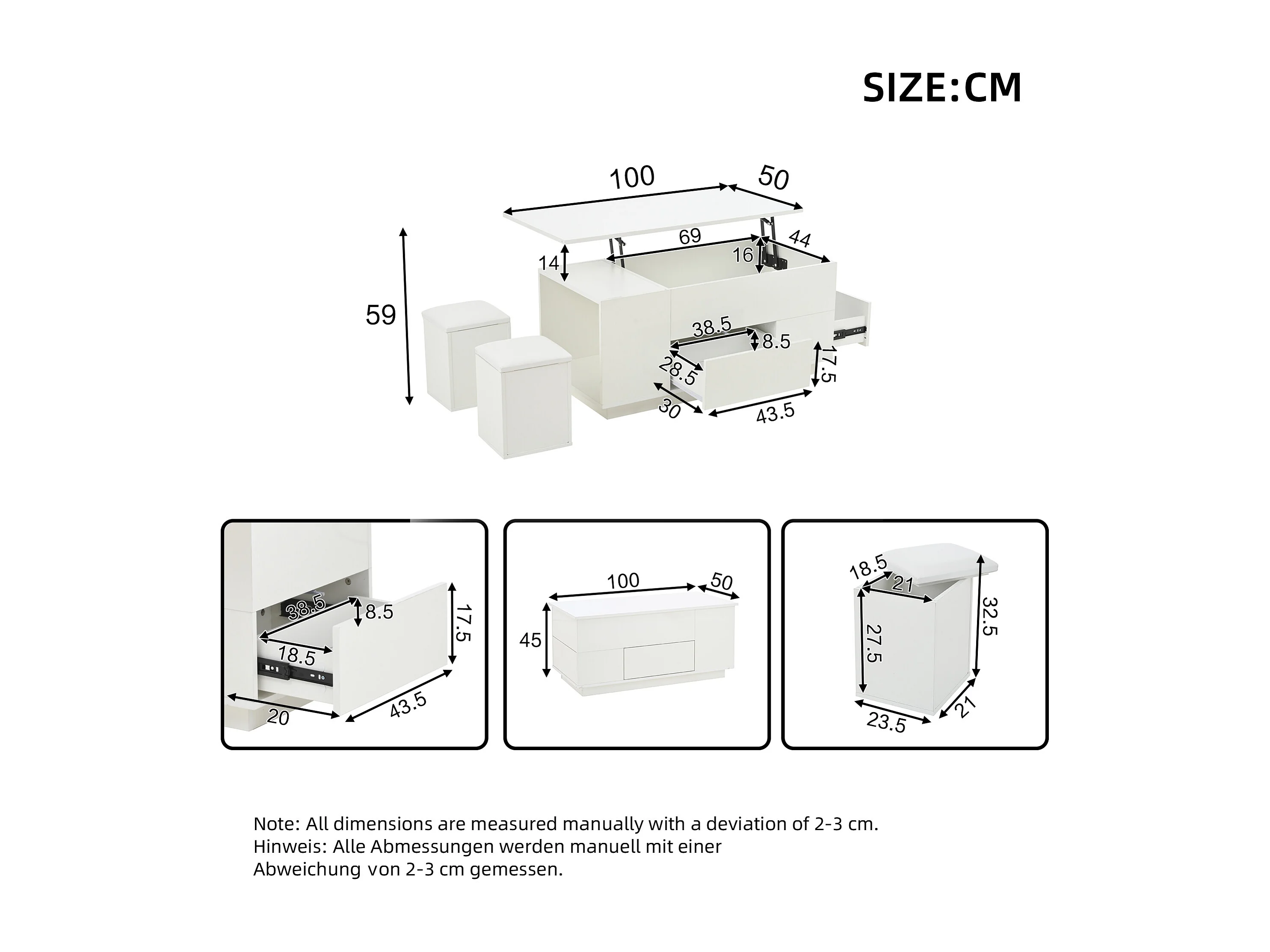 Table basse relevable 100x50x45 cm - avec éclairage LED - finition brillante - avec 2 tiroirs et 2 tabourets - Blanc