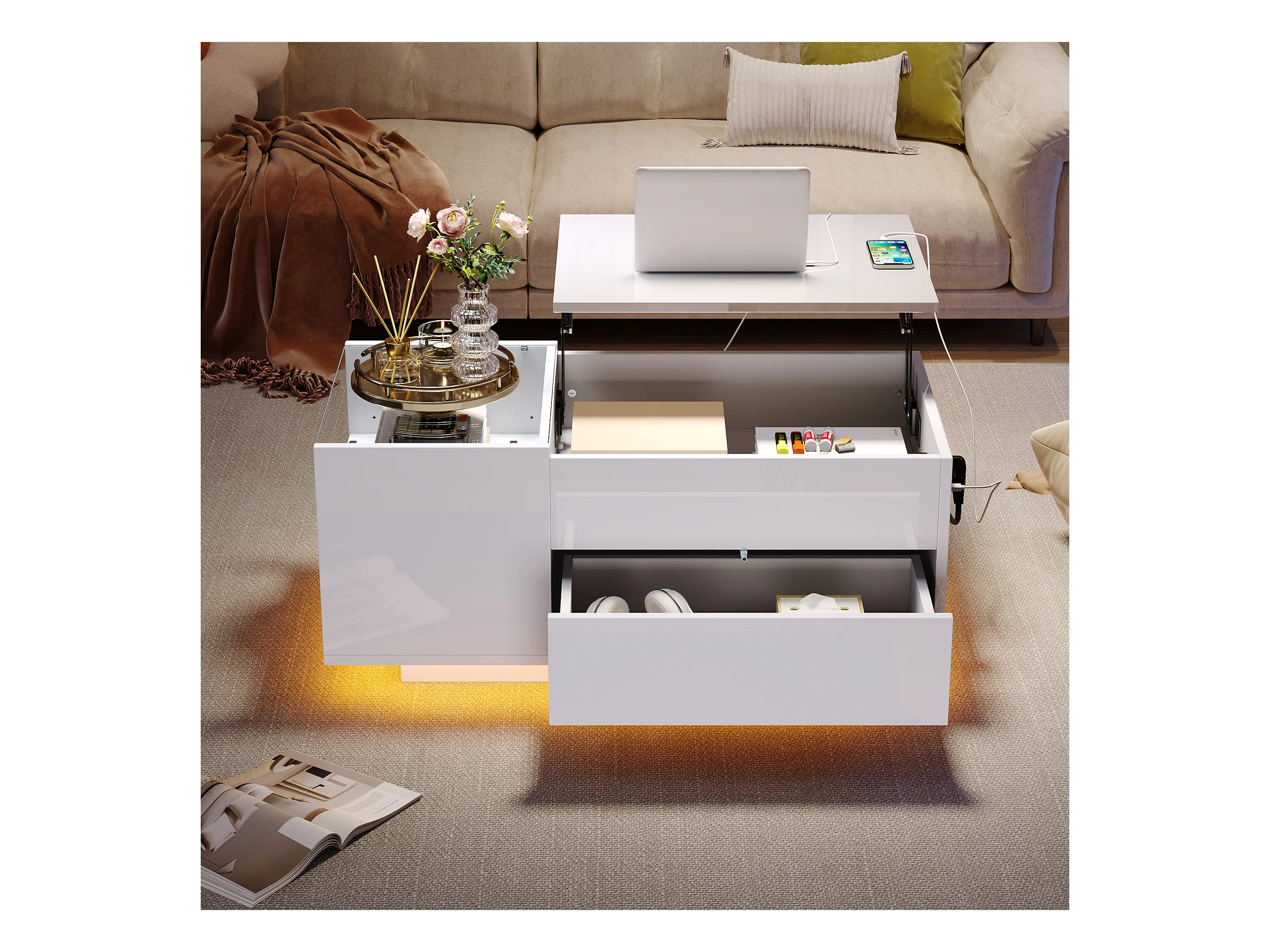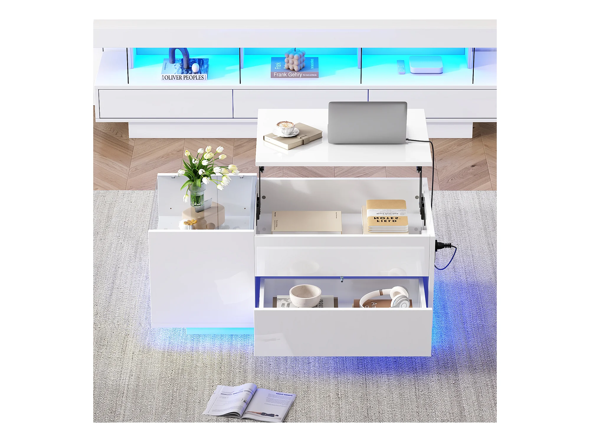 Table basse relevable 95x48x42cm - avec éclairage LED - avec prise - 1 tiroir - finition brillante - blanc