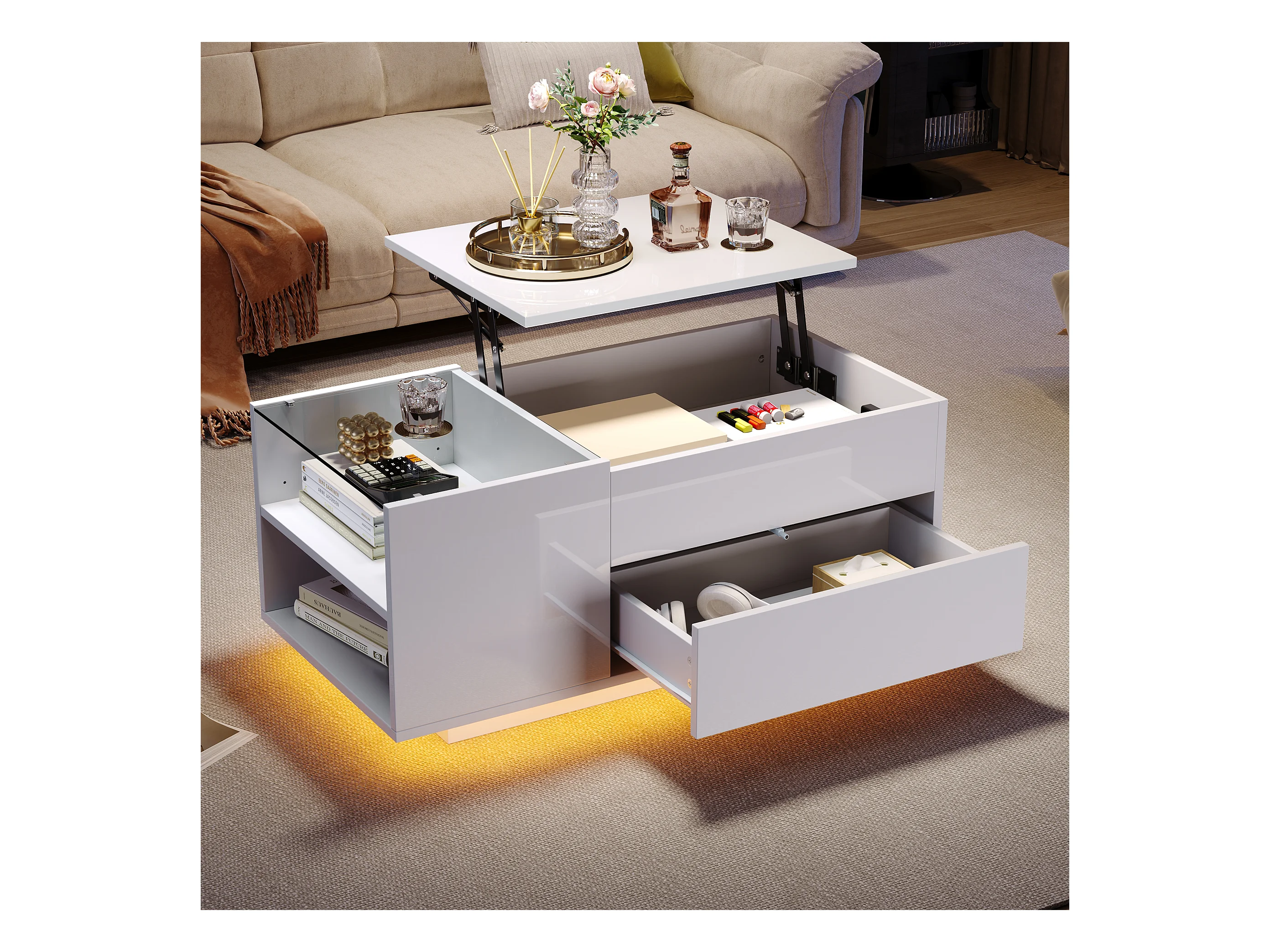 Table basse relevable avec LED - avec rangements - effet brillant - Blanc