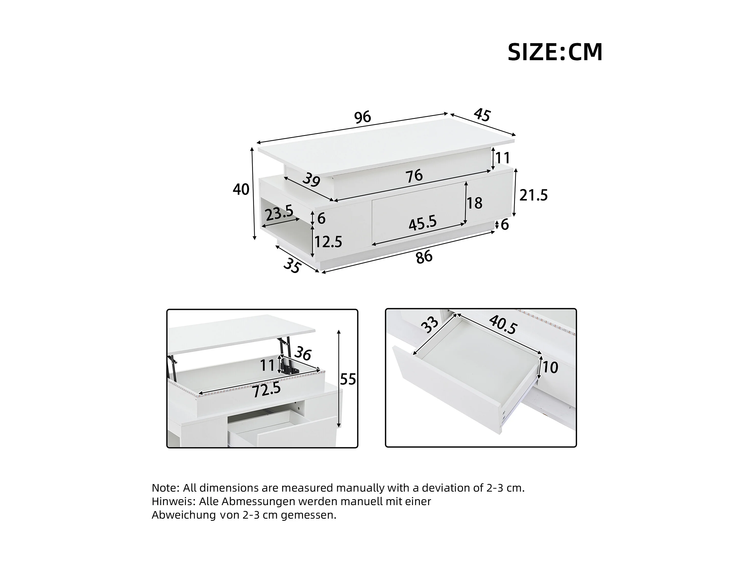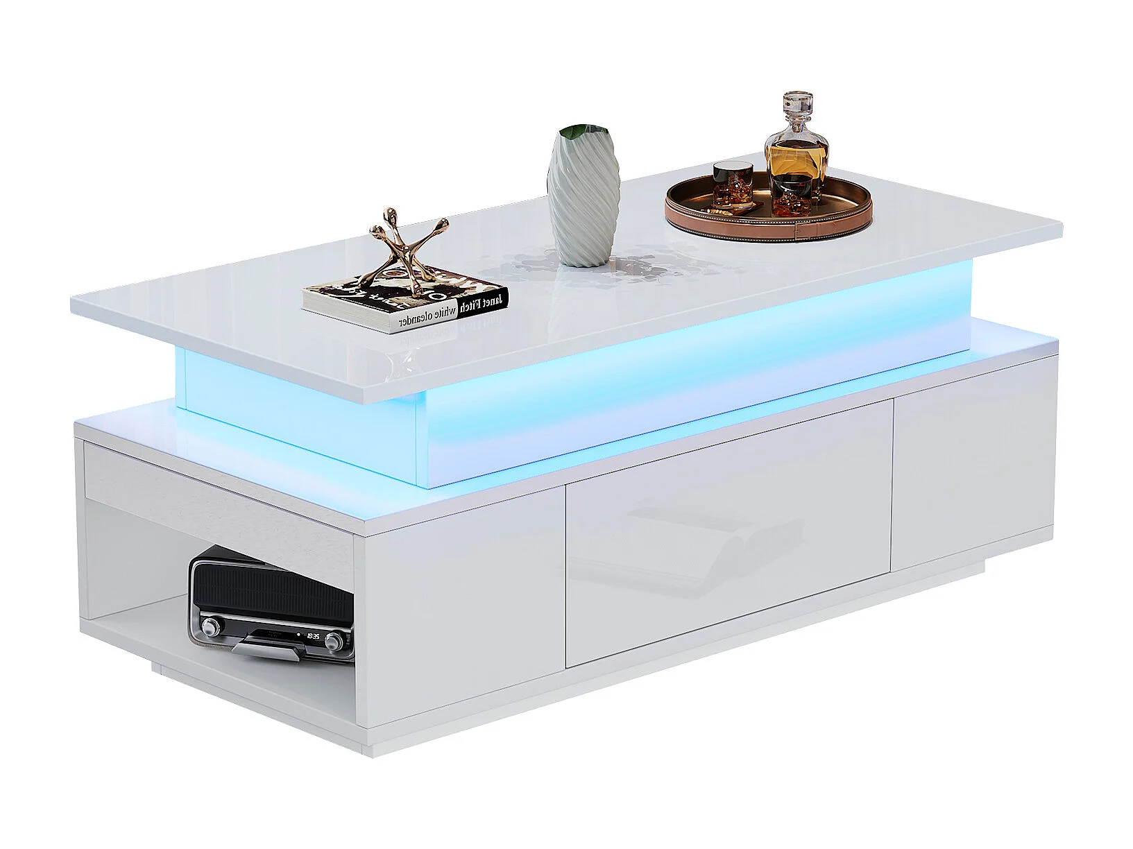 Table basse relevable 96x45x40cm - avec éclairage LED - avec 1 tiroir - Finition laquée brillante - Blanc