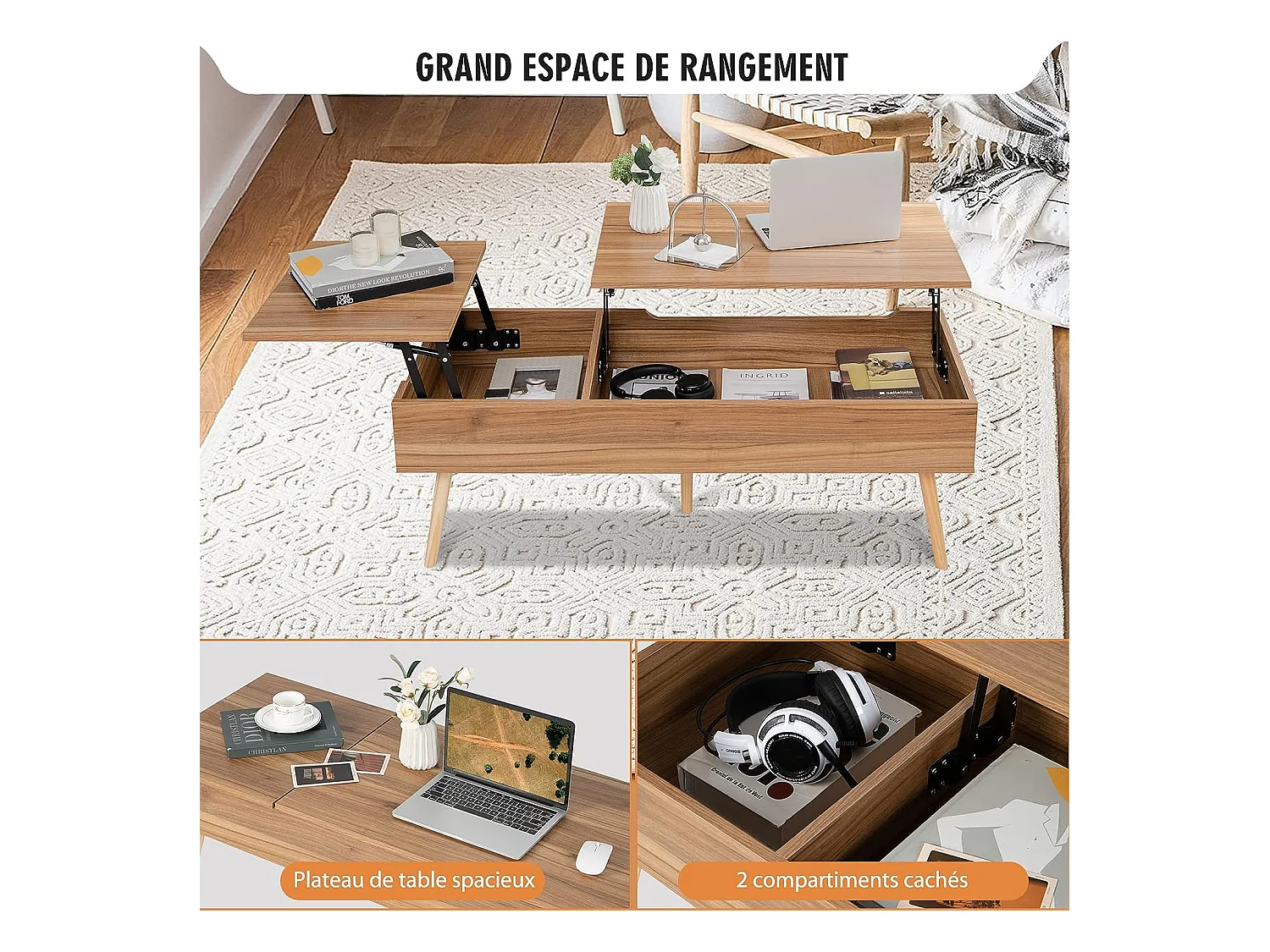 Table basse avec plateau relevable et espace de rangement caché, ideal pour salon 109 x 47,5 x 50 cm