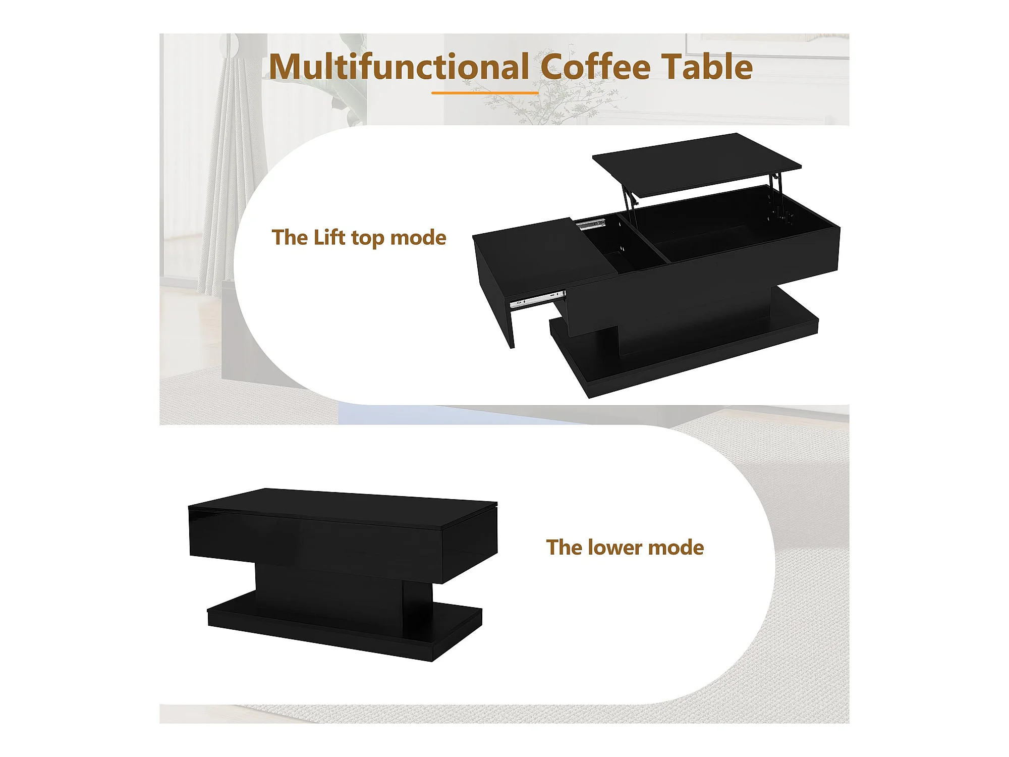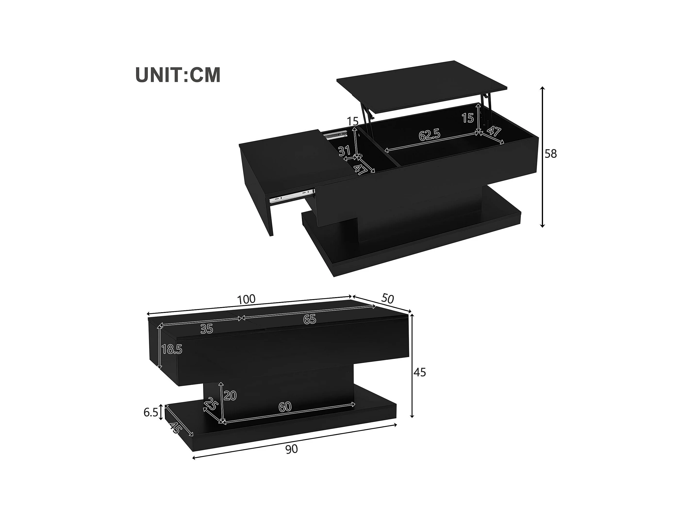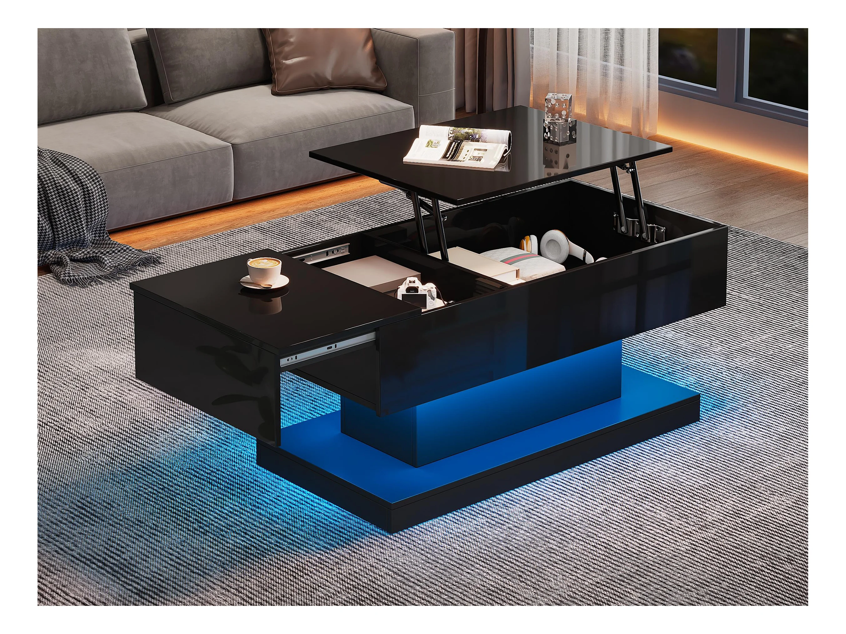 Table basse relevable avec LED - avec rangements - effet brillant - Noir