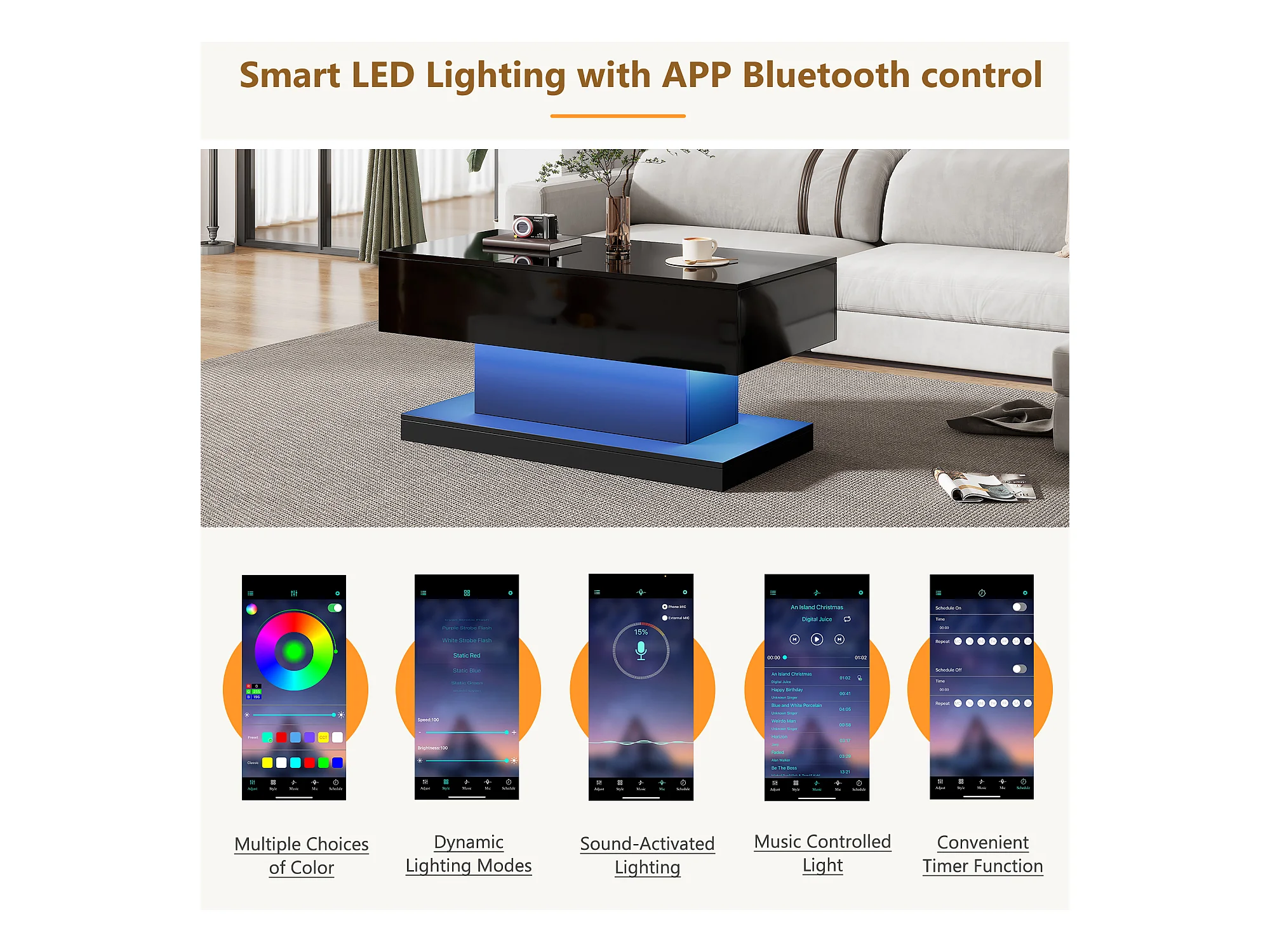 Table basse réglable en hauteur avec LED - 2 tiroirs - contrôlé par APP - Noir
