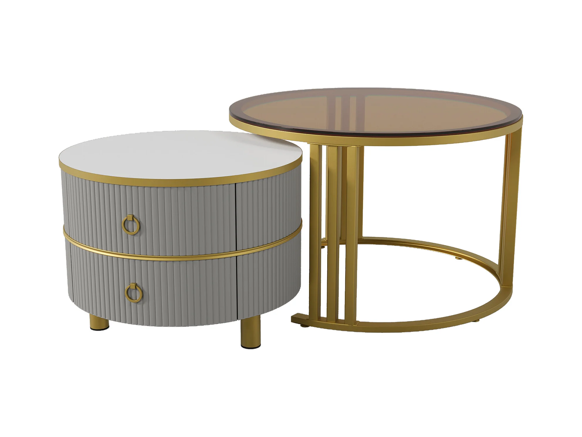 Table basse ronde 2-en-1, MDF, plateau laqué et verre trempé marron, 2 tiroirs, gris et marron (70x70x45 + 50x50x40 cm)
