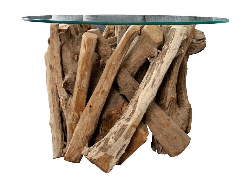 Table basse ronde ARBOREA 70 cm – Table basse en bois de teck avec plateau en verre trempé