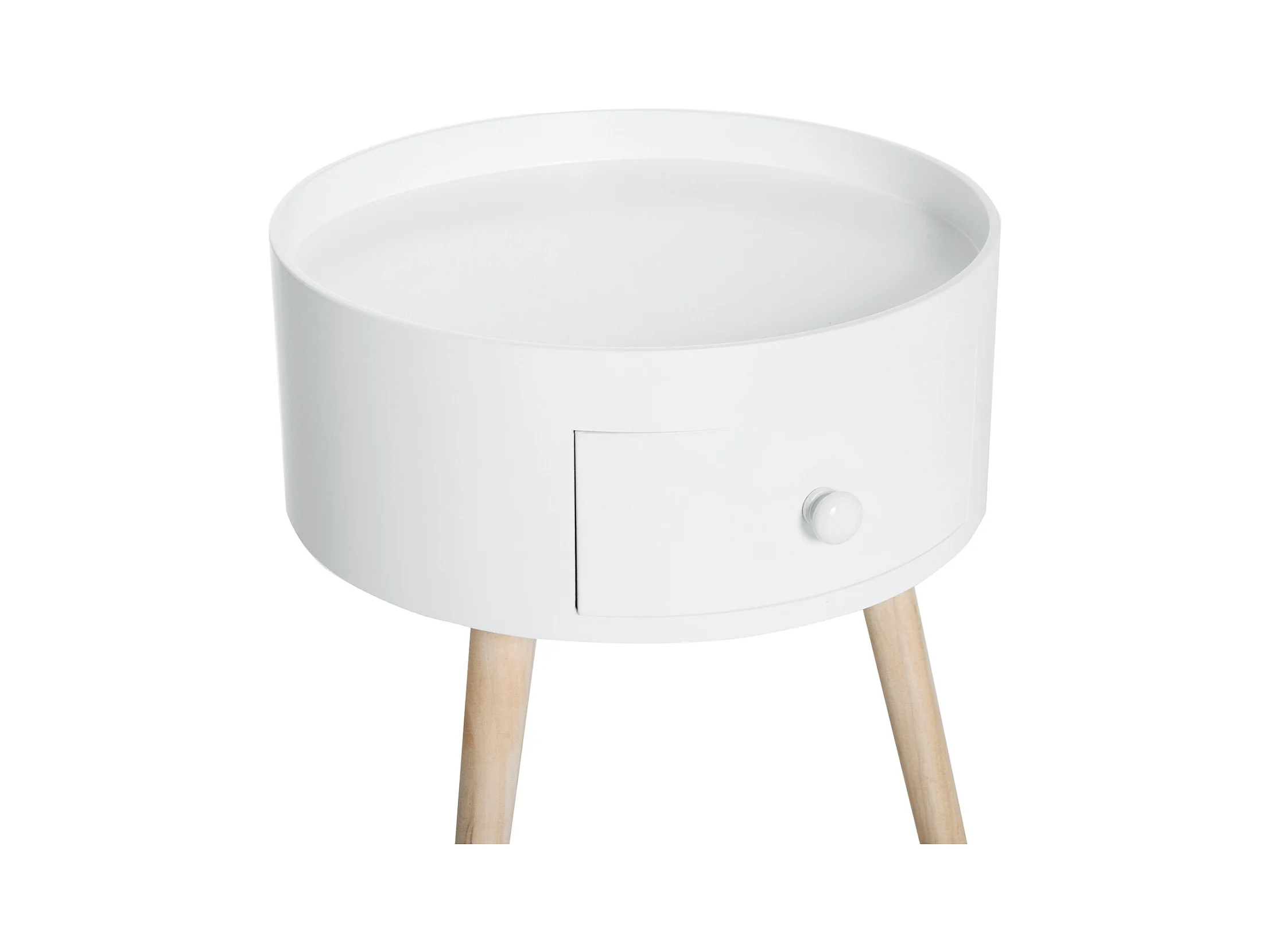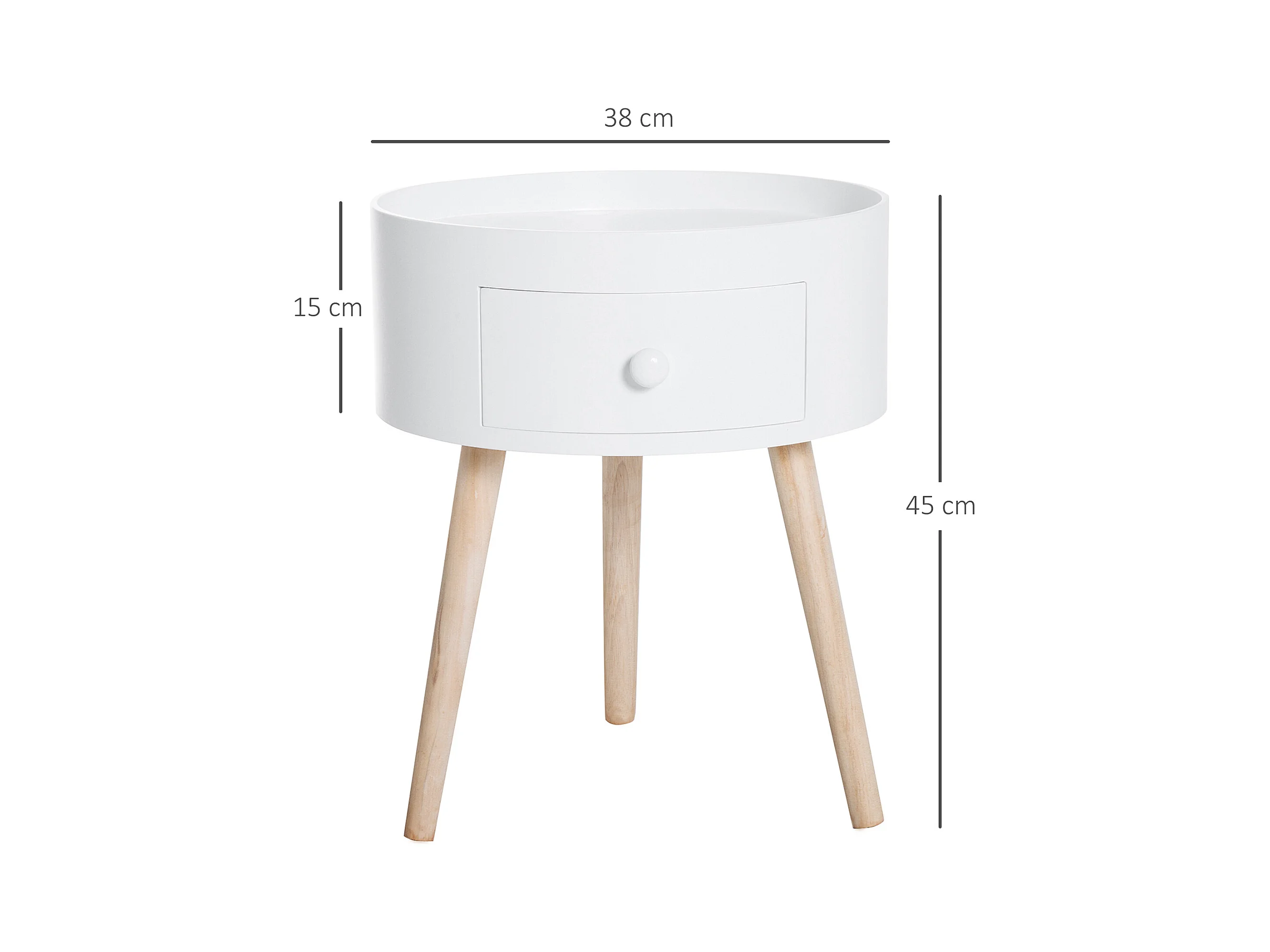 Table basse ronde avec tiroir, bois blanc, style scandinave, capacité 50kg (Ø38x45cm)