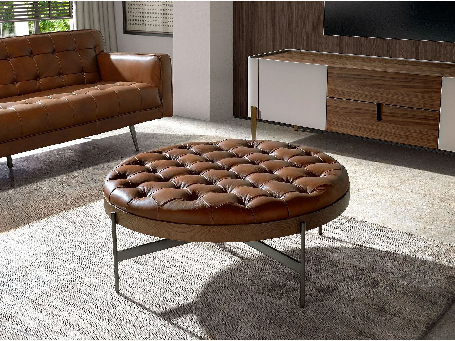 Table basse ronde en cuir brun foncé, noyer et acier foncé 2147 ANGEL CERDA