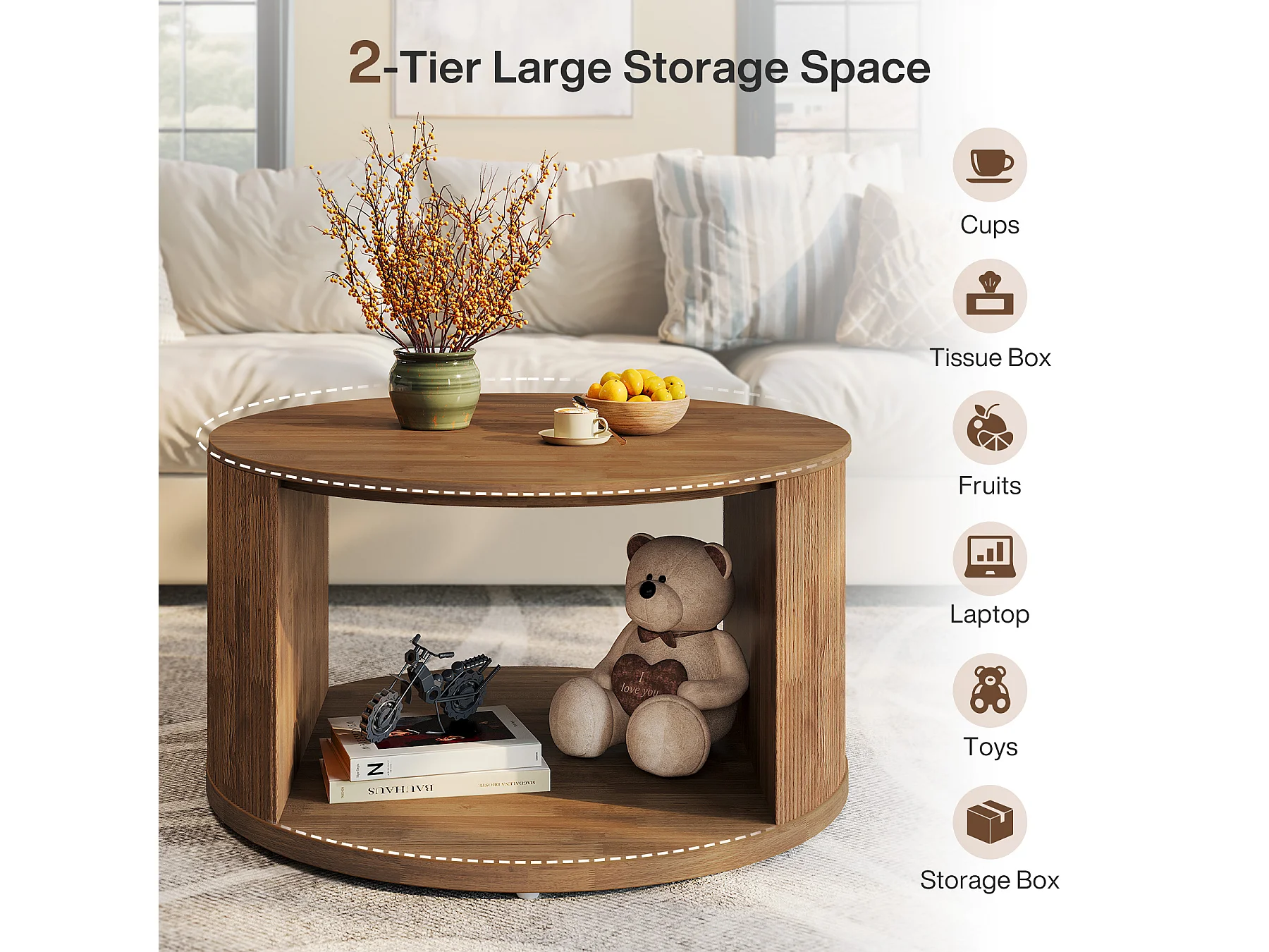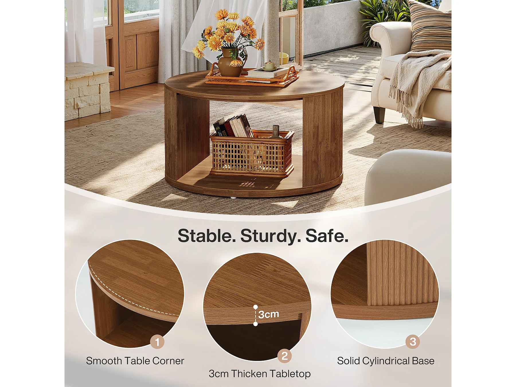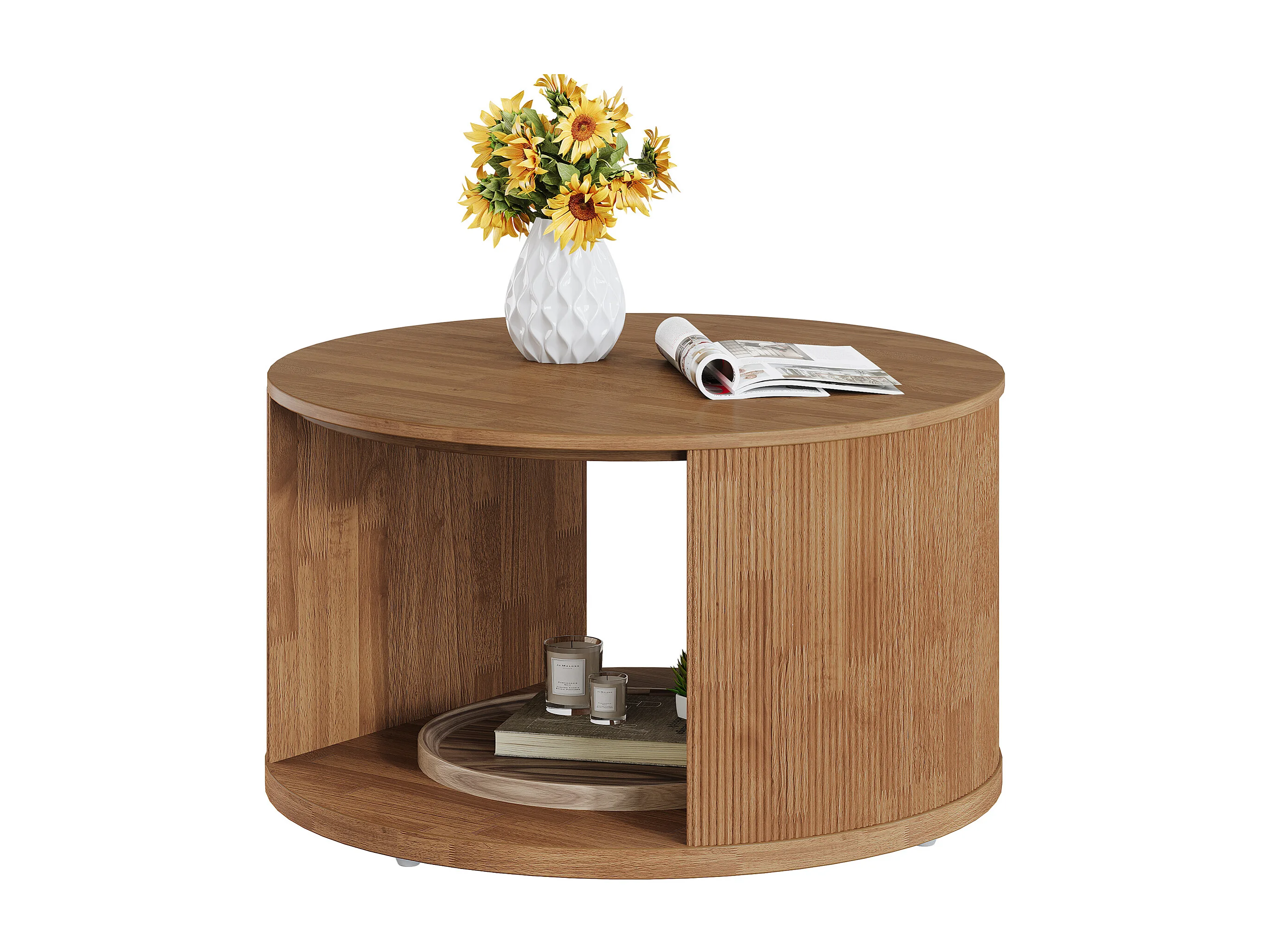 Table basse ronde, petite table basse de 80 cm avec base tambour cannelée et rangement en alcôve, table d'appoint moderne du milieu du siècle
