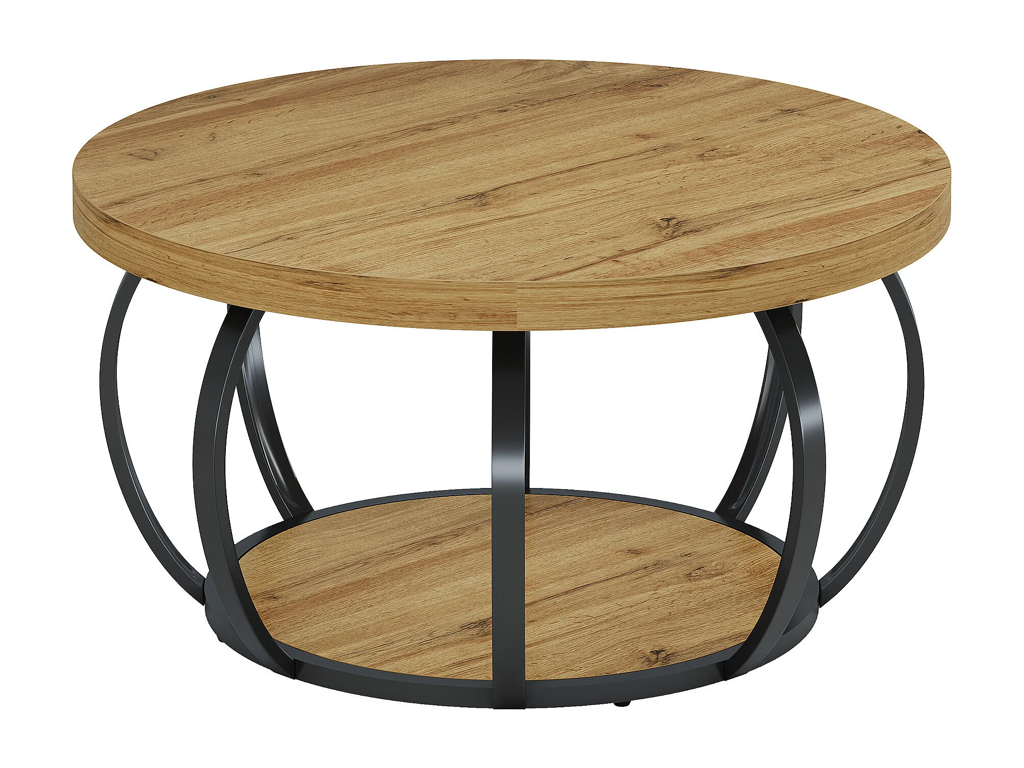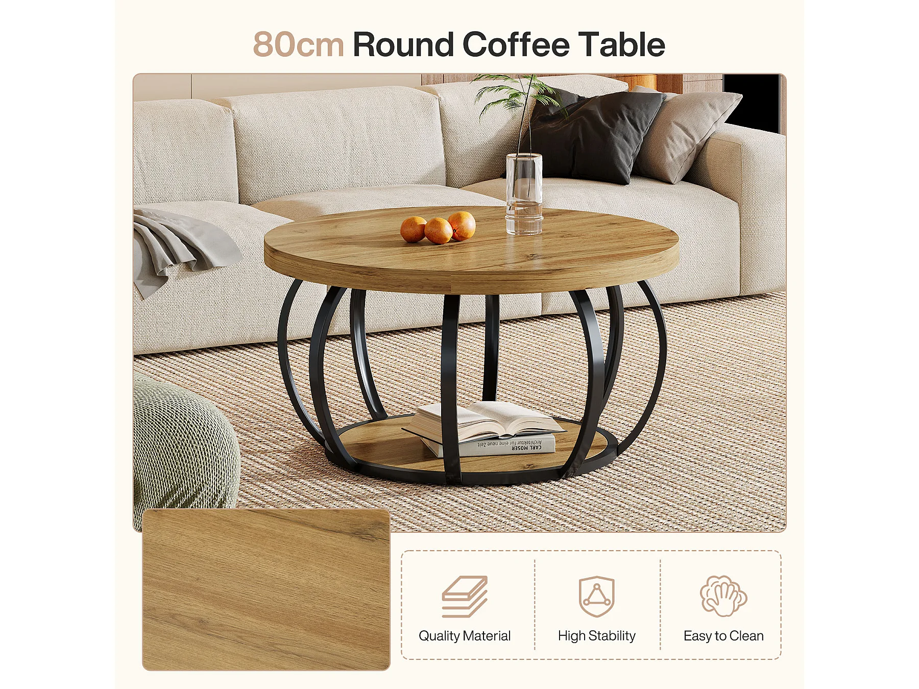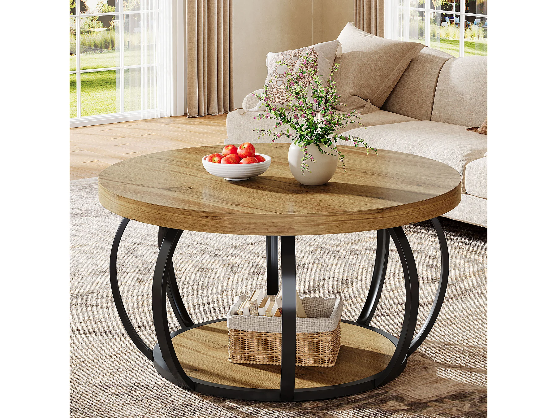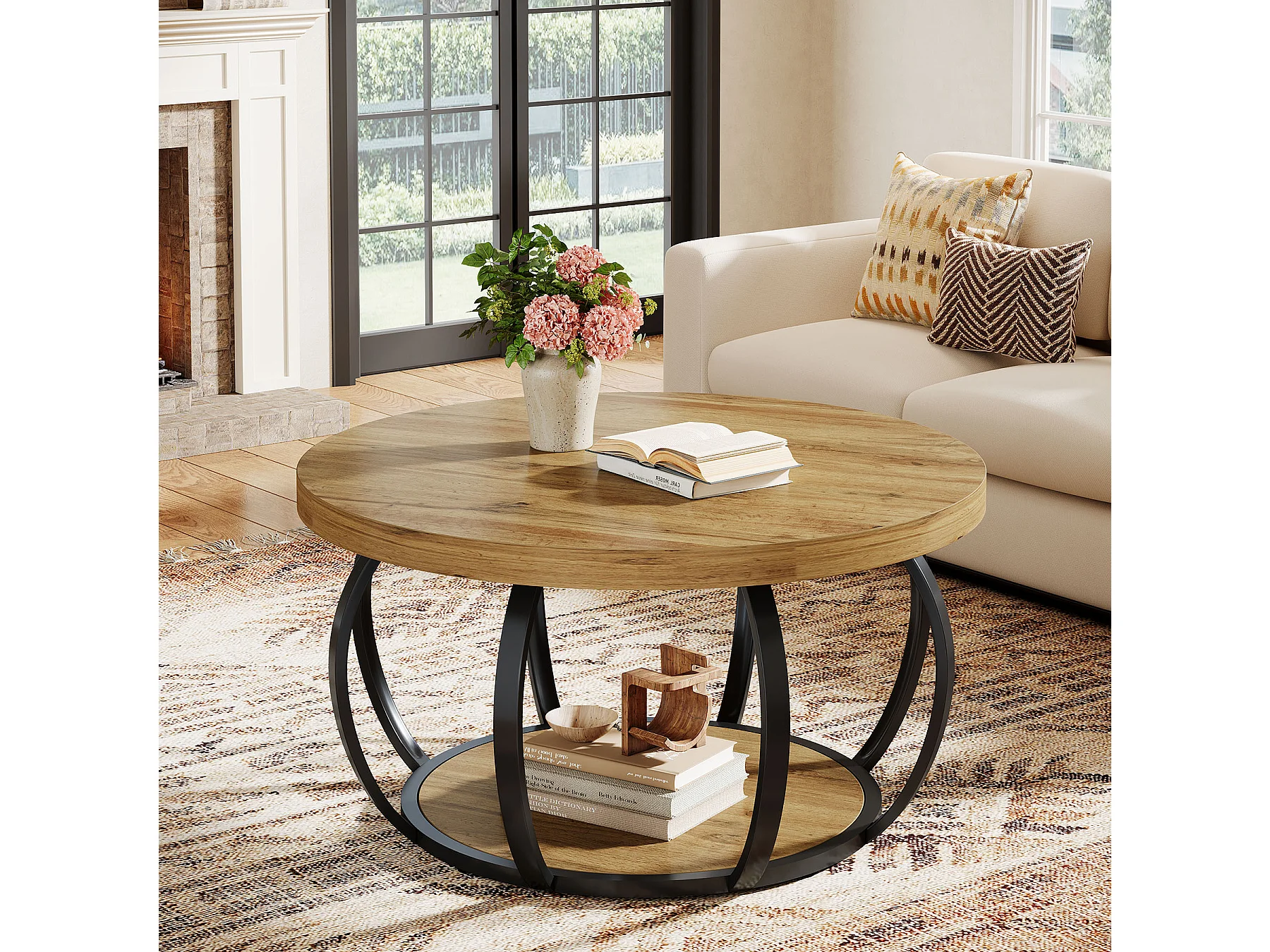 Table basse ronde, table basse industrielle à 2 niveaux avec étagères de rangement, table d'appoint moderne en bois pour canapé