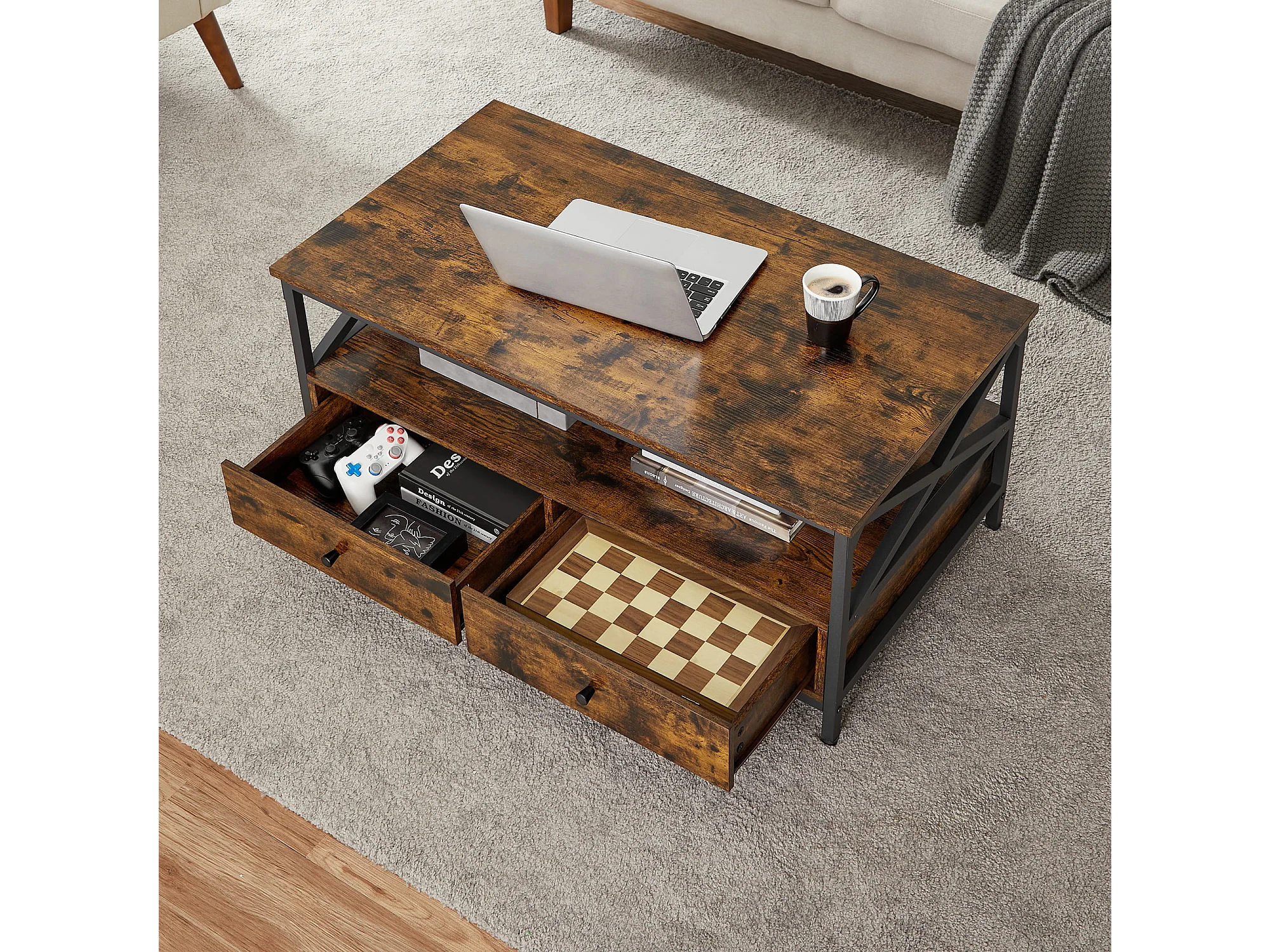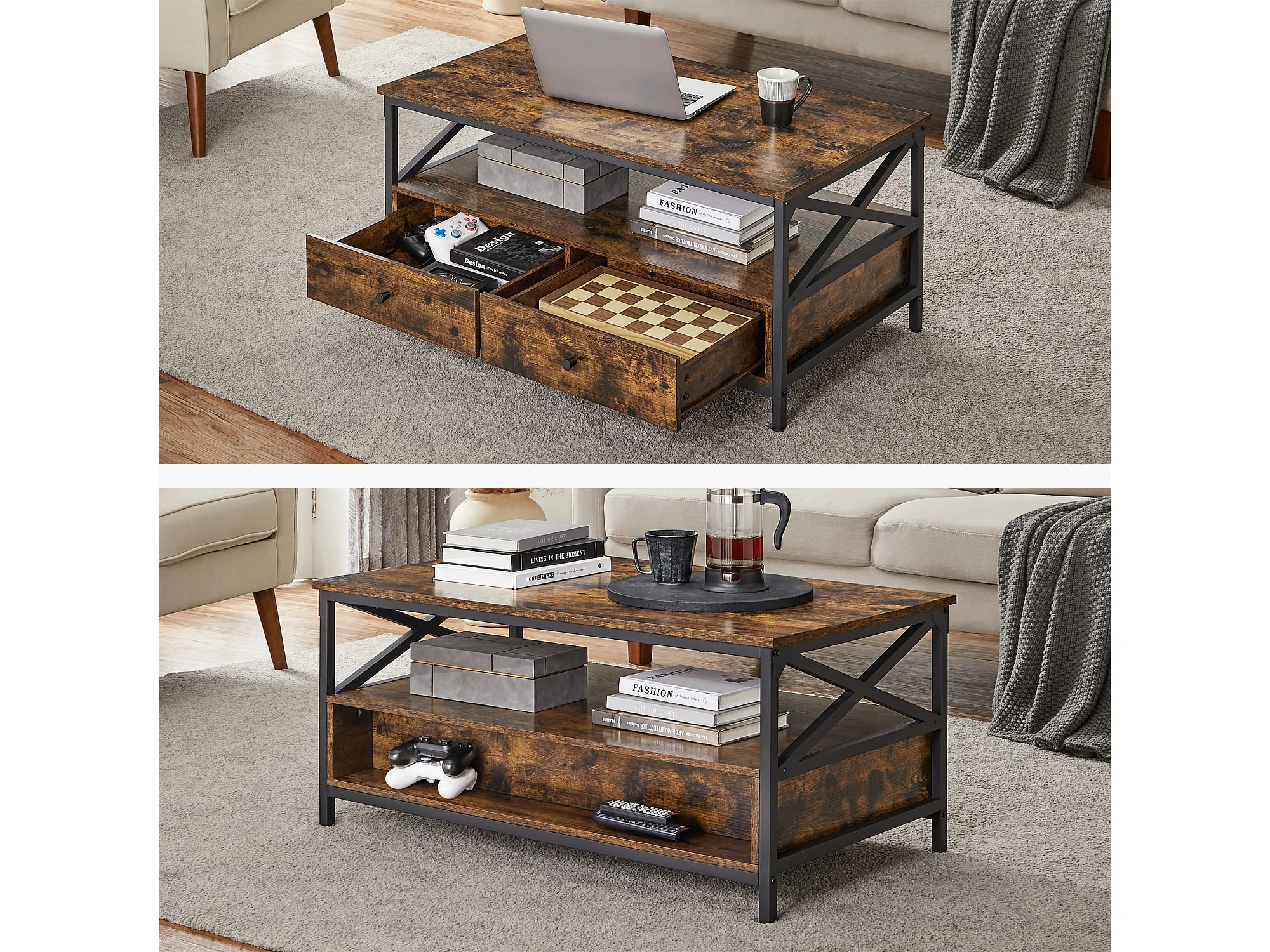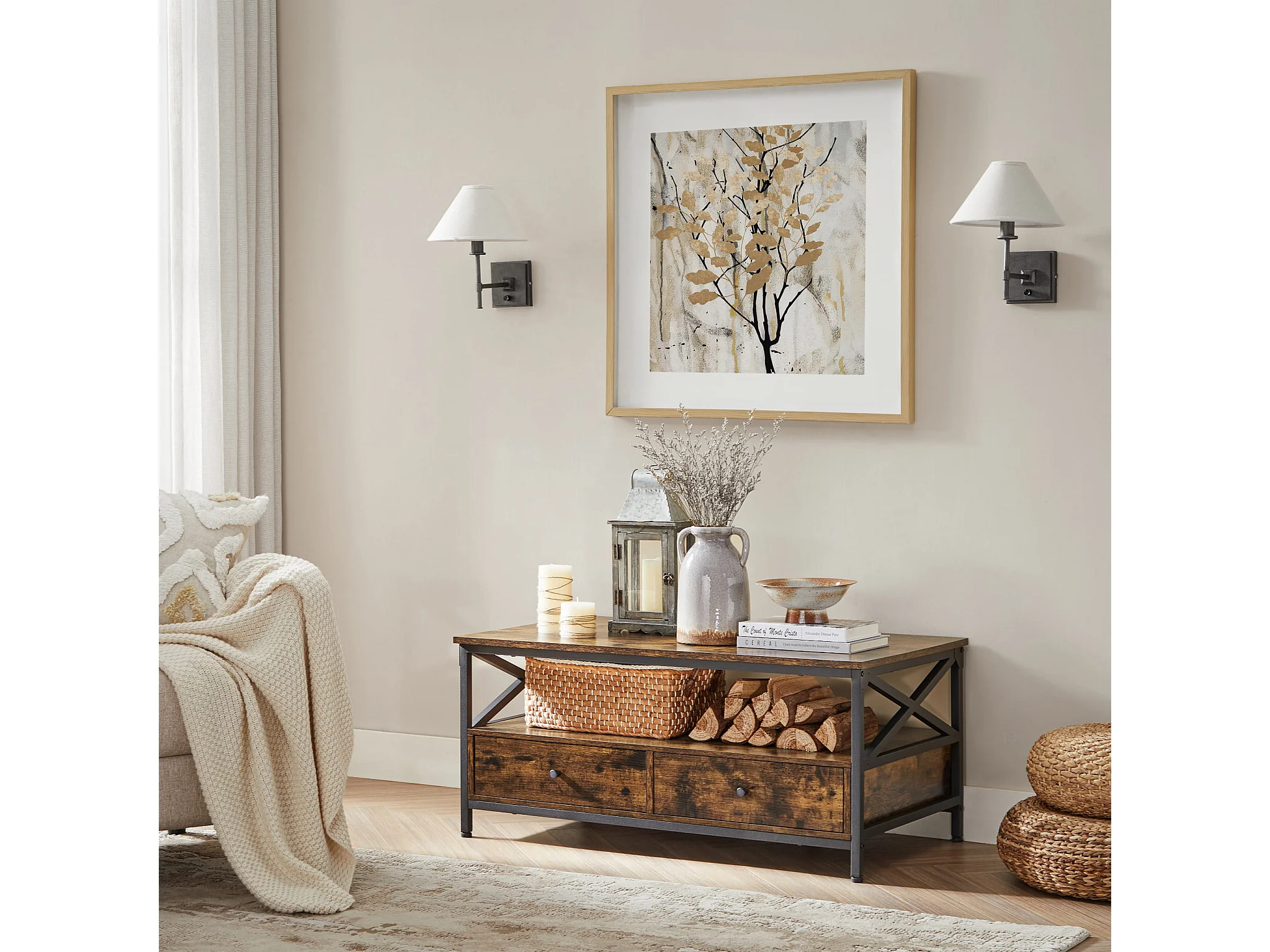 Table basse rustique marron Valora avec tiroirs et étagère pour le salon