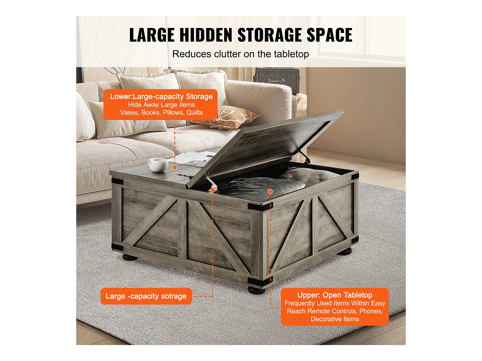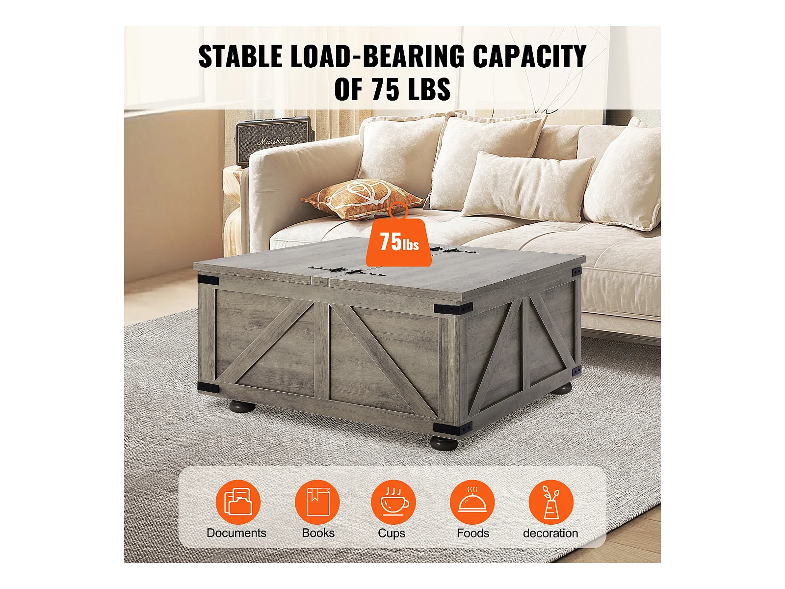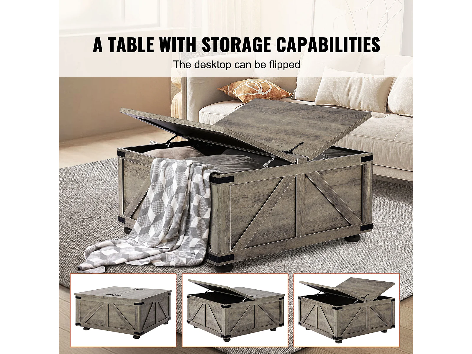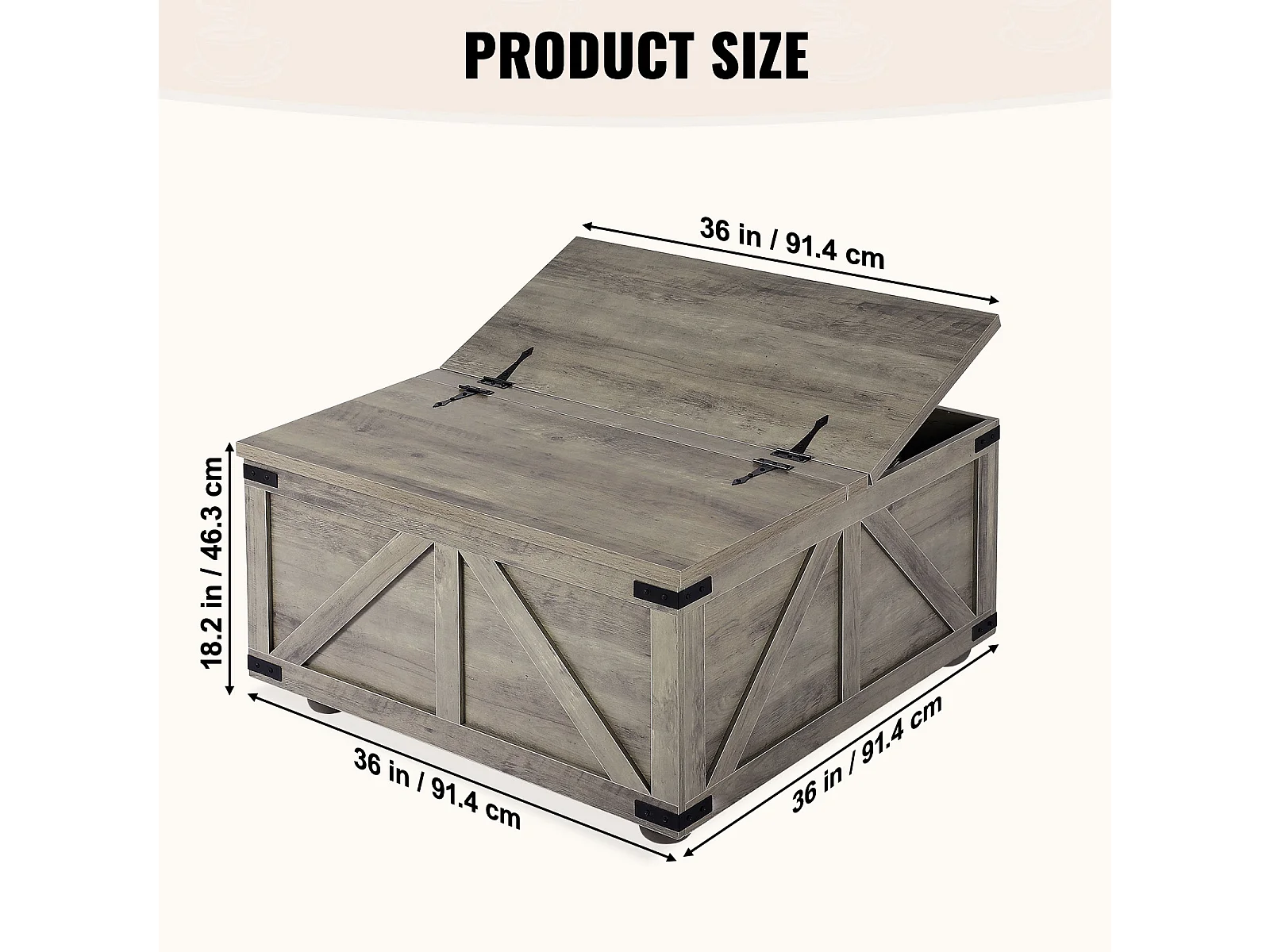 Table Basse SucceBuy, 914 mm, Table Carrée à Charnières avec Grand Compartiment de Rangement, Gris-Marron, pour Salon, Chambre, Appartement, Studio