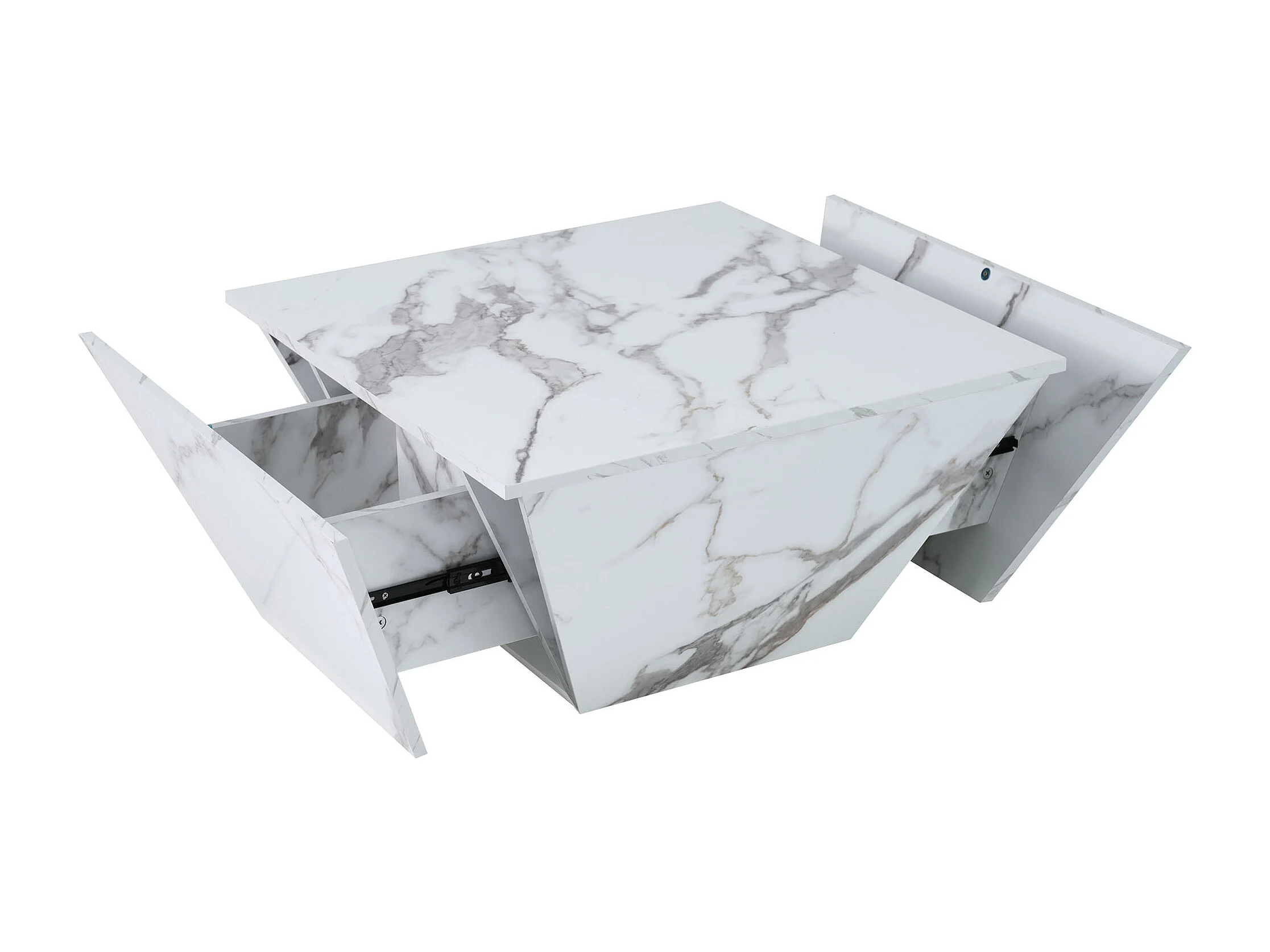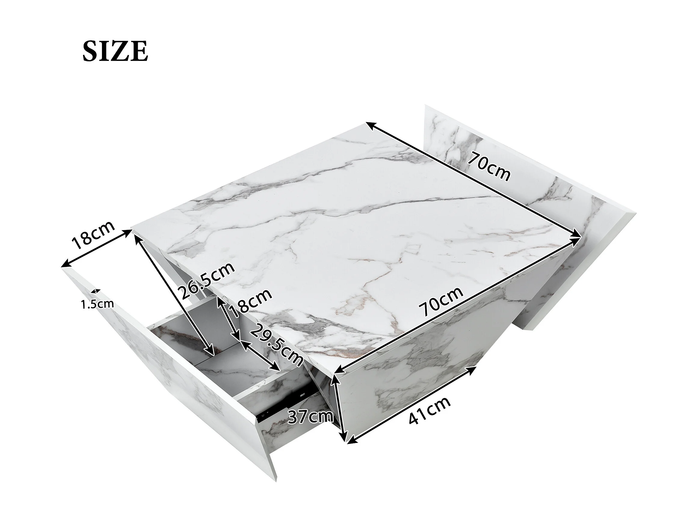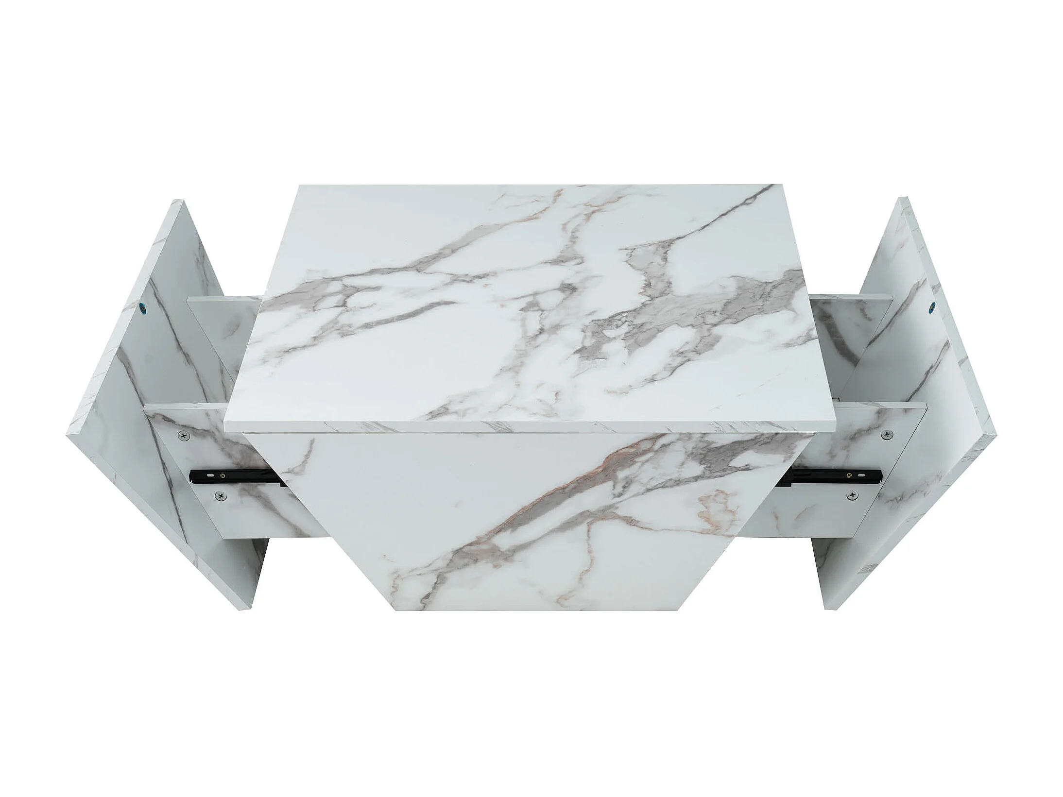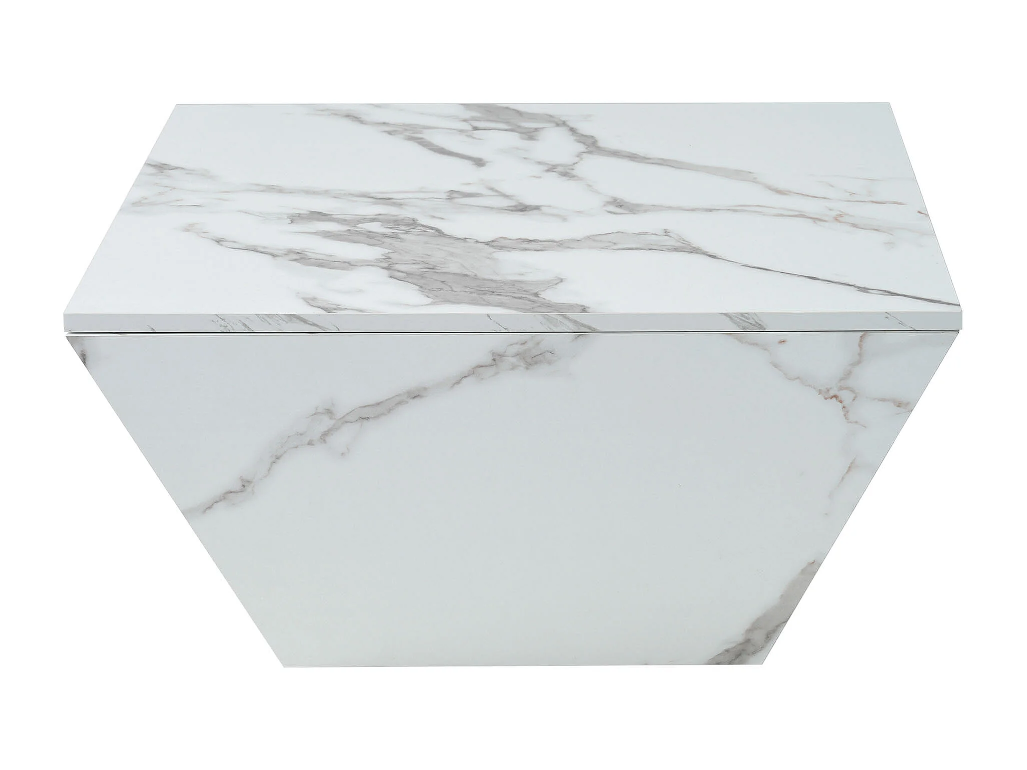 Table basse trapézoïdale 70x70x37 cm, 2 tiroirs, plateau épais et lisse, MDF, blanc