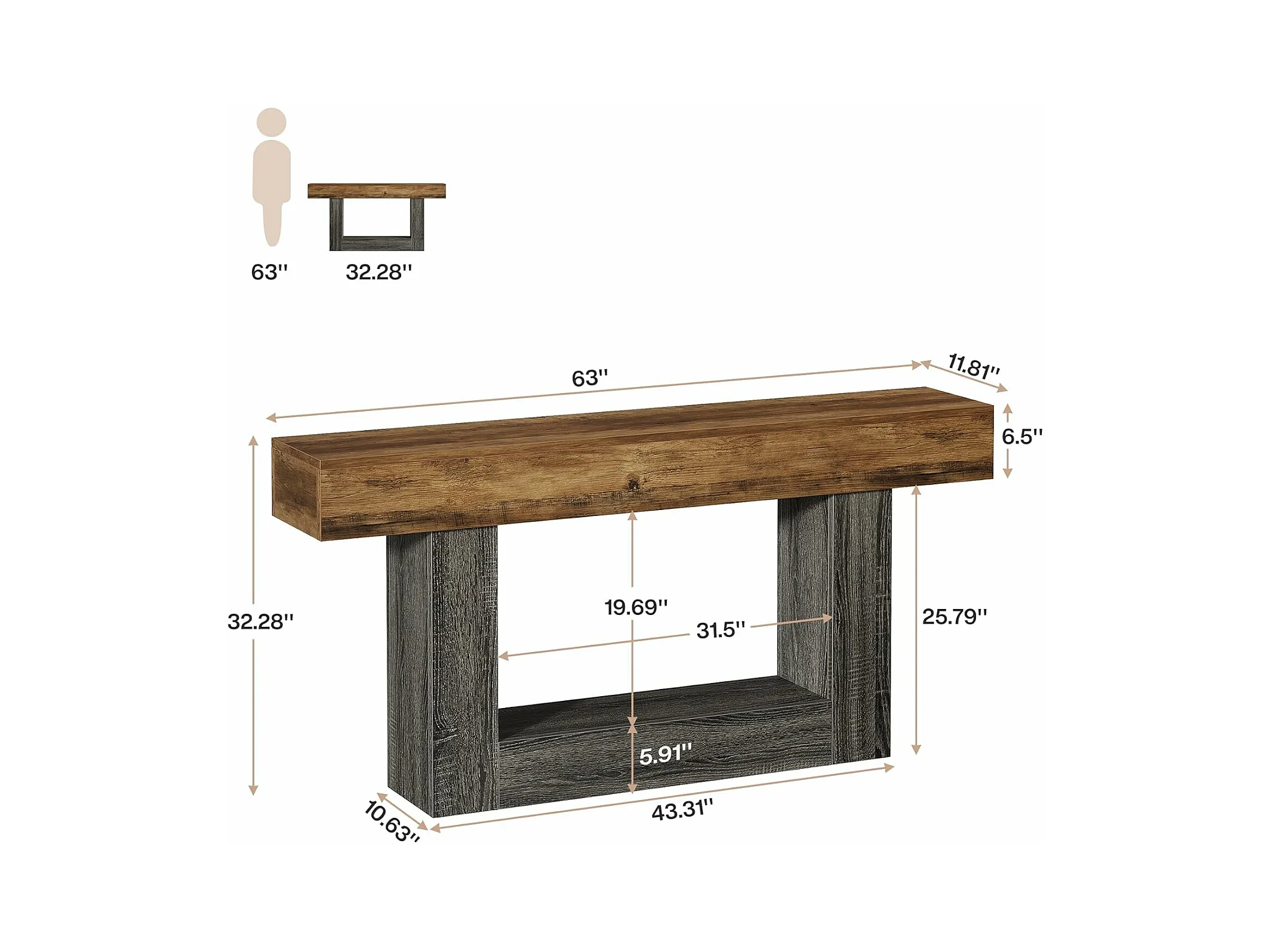 Table console de 160 cm de long, table d'entrée à 2 niveaux, table de canapé avec rangement, table de canapé en bois de ferme pour salon, couloir