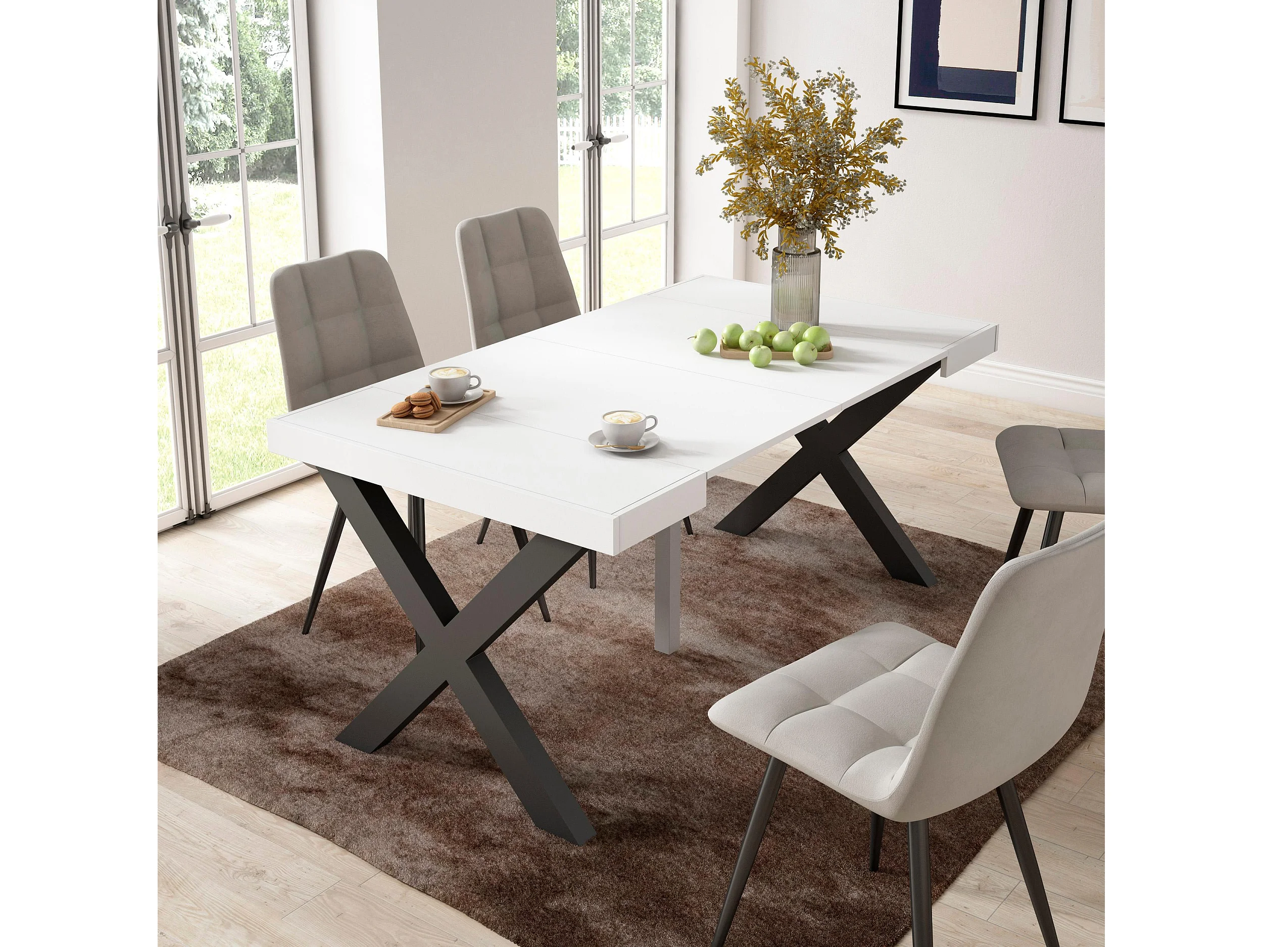 Table console extensible, 160x90x73cm, Pour 8 personnes, Pieds bois massif, Blanc