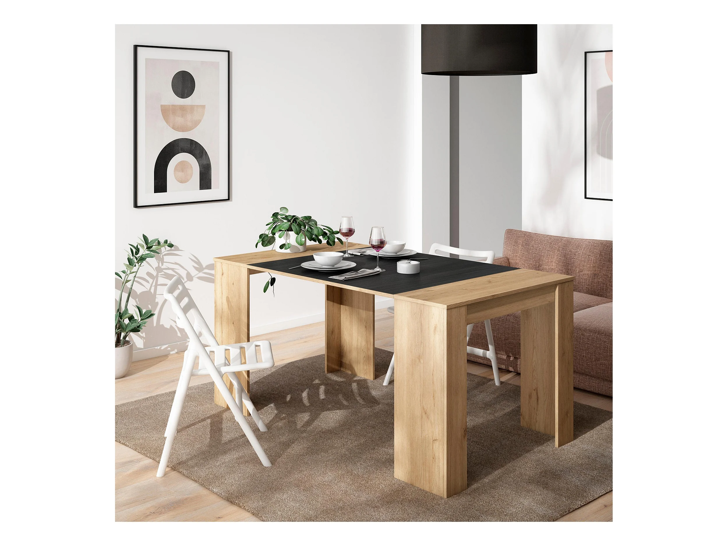 Table console extensible, 160x90x77cm, Pour 8 personnes, Table à Manger, Chêne et noir