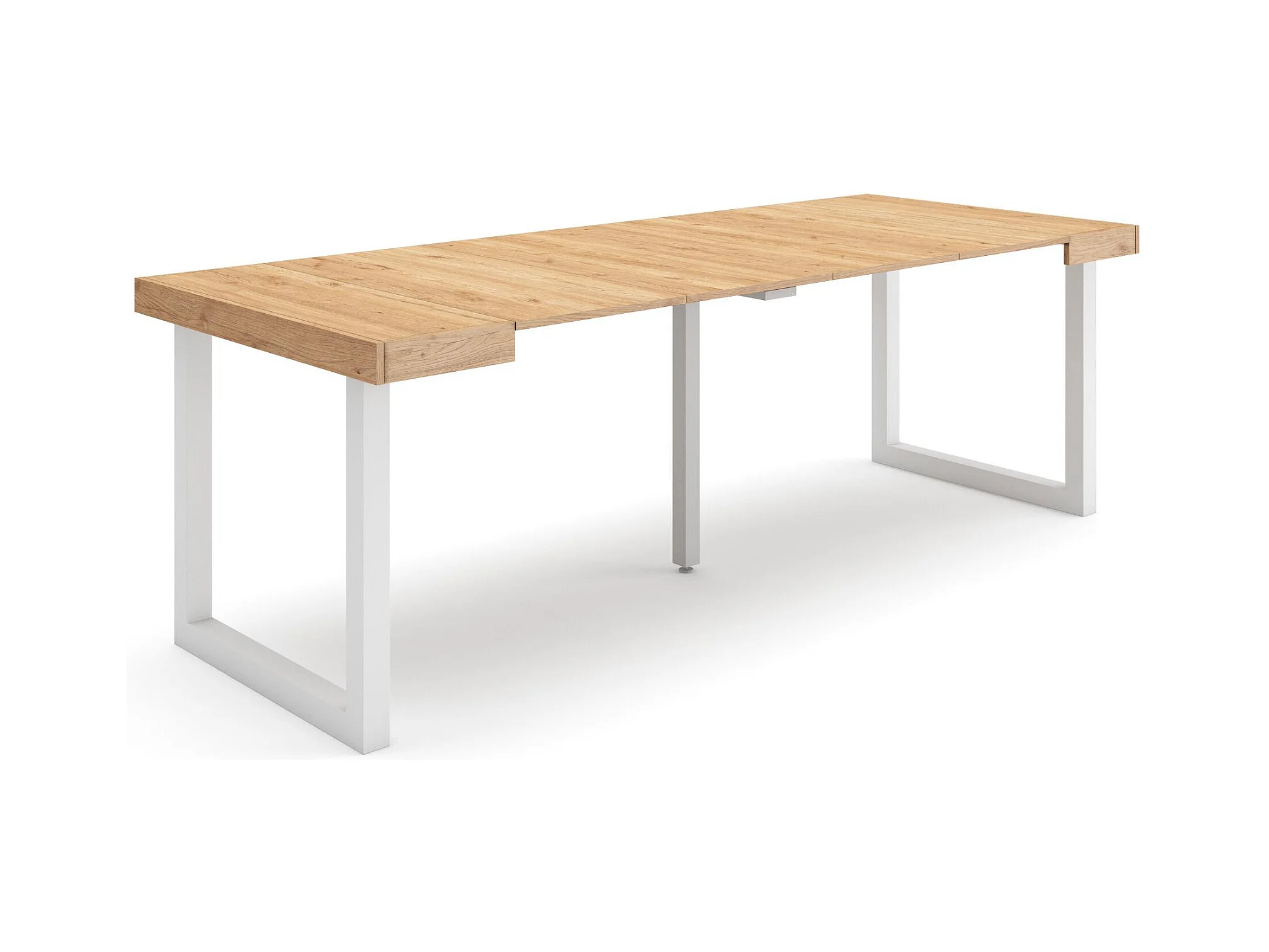 Table console extensible, 222x90x73cm, Pour 10 personnes, Pieds en bois, Chêne et blanc
