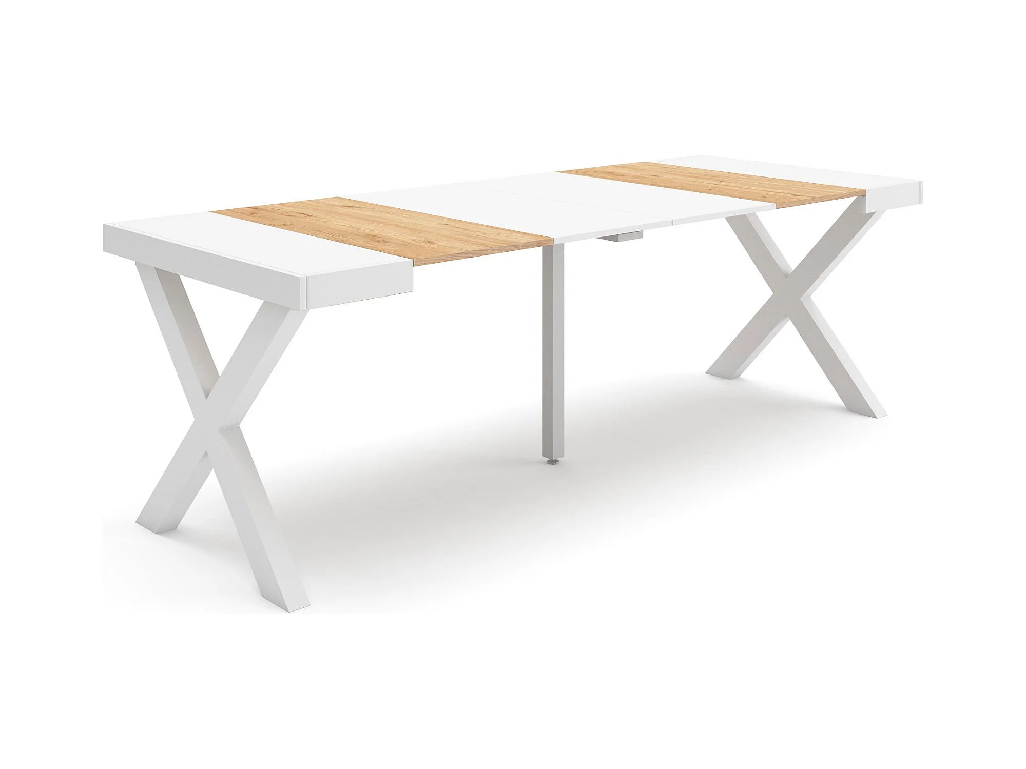 Table console extensible, 222x90x73cm, Pour 10 personnes, Pieds en bois, Chêne et blanc