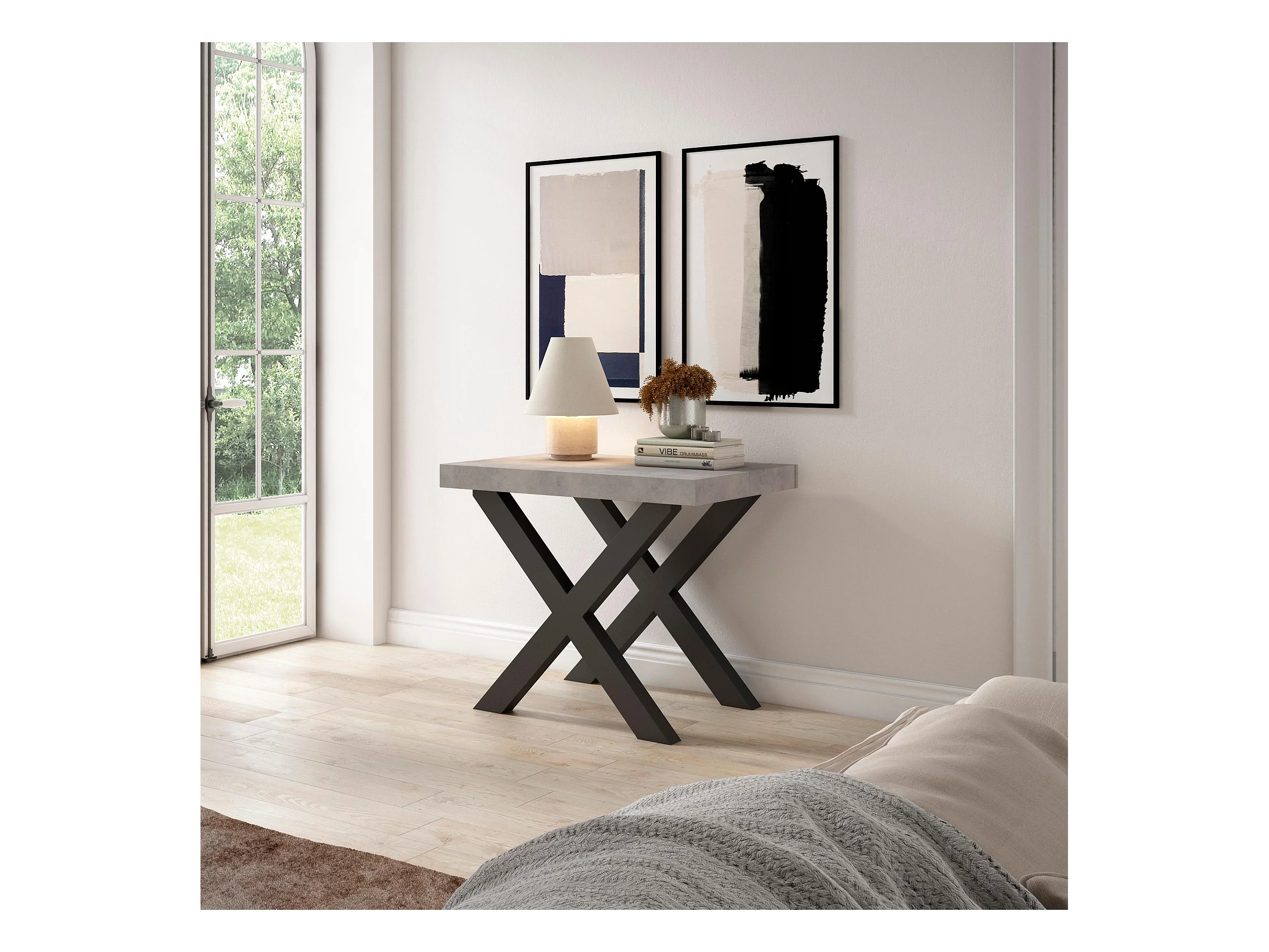 Table console extensible, 302x90x73cm, Pour 14 personnes, Pieds bois massif, Ciment