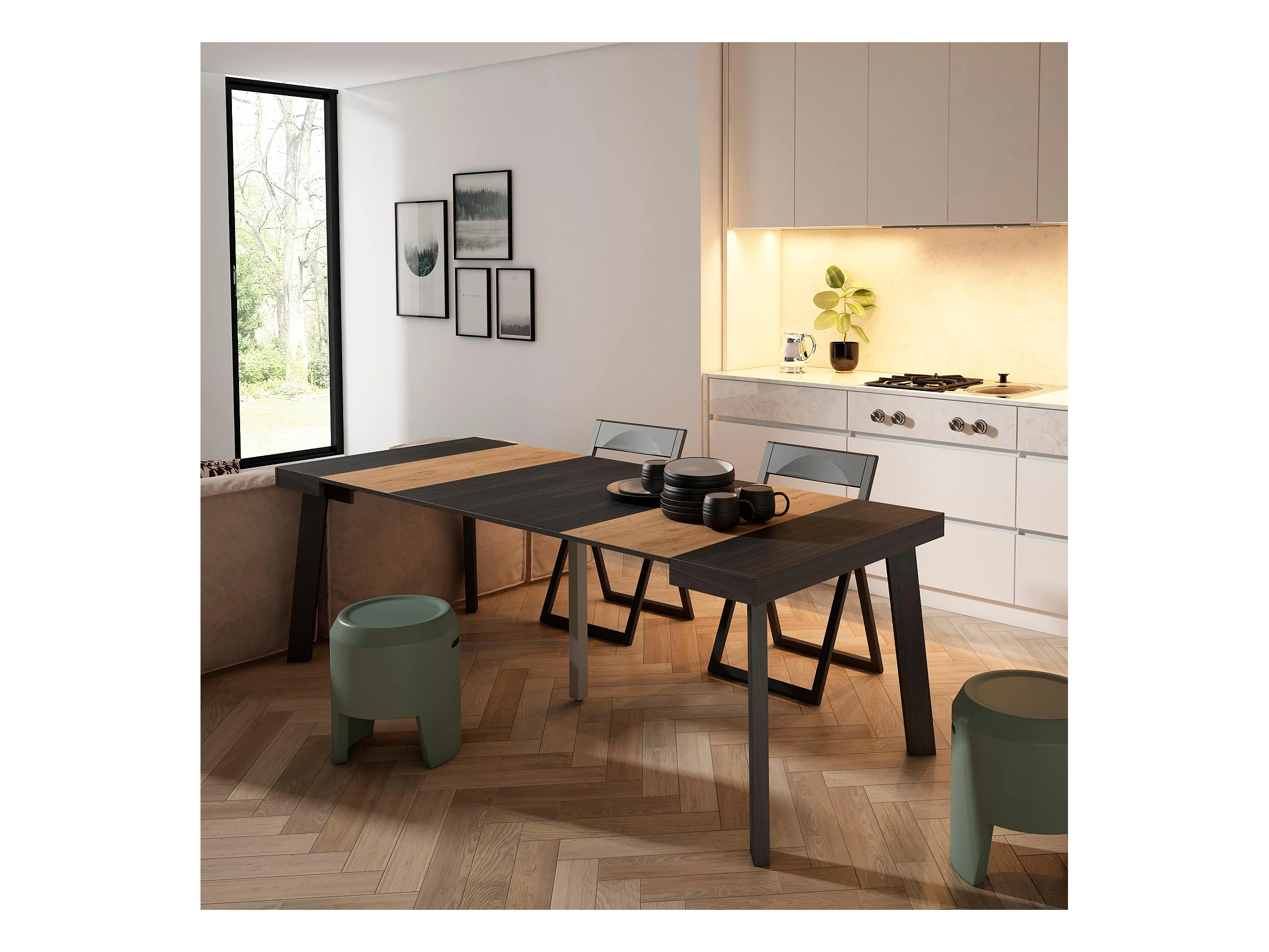 Table console extensible, 222x90x73cm, Pour 10 personnes, Pieds en bois, Chêne et noir