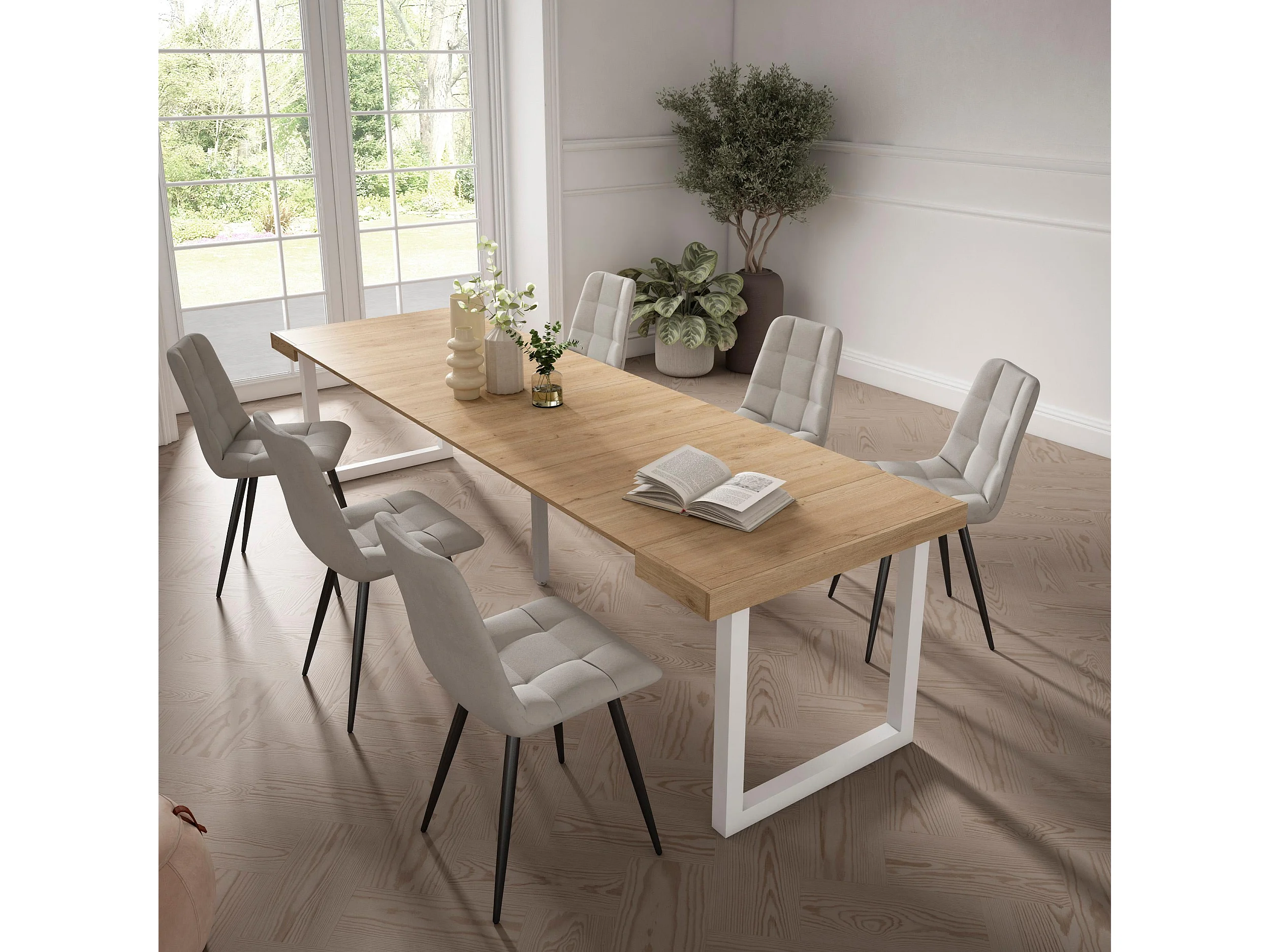 Table console extensible, 302x90x73cm, Pour 14 personnes, Pieds bois massif, Chêne