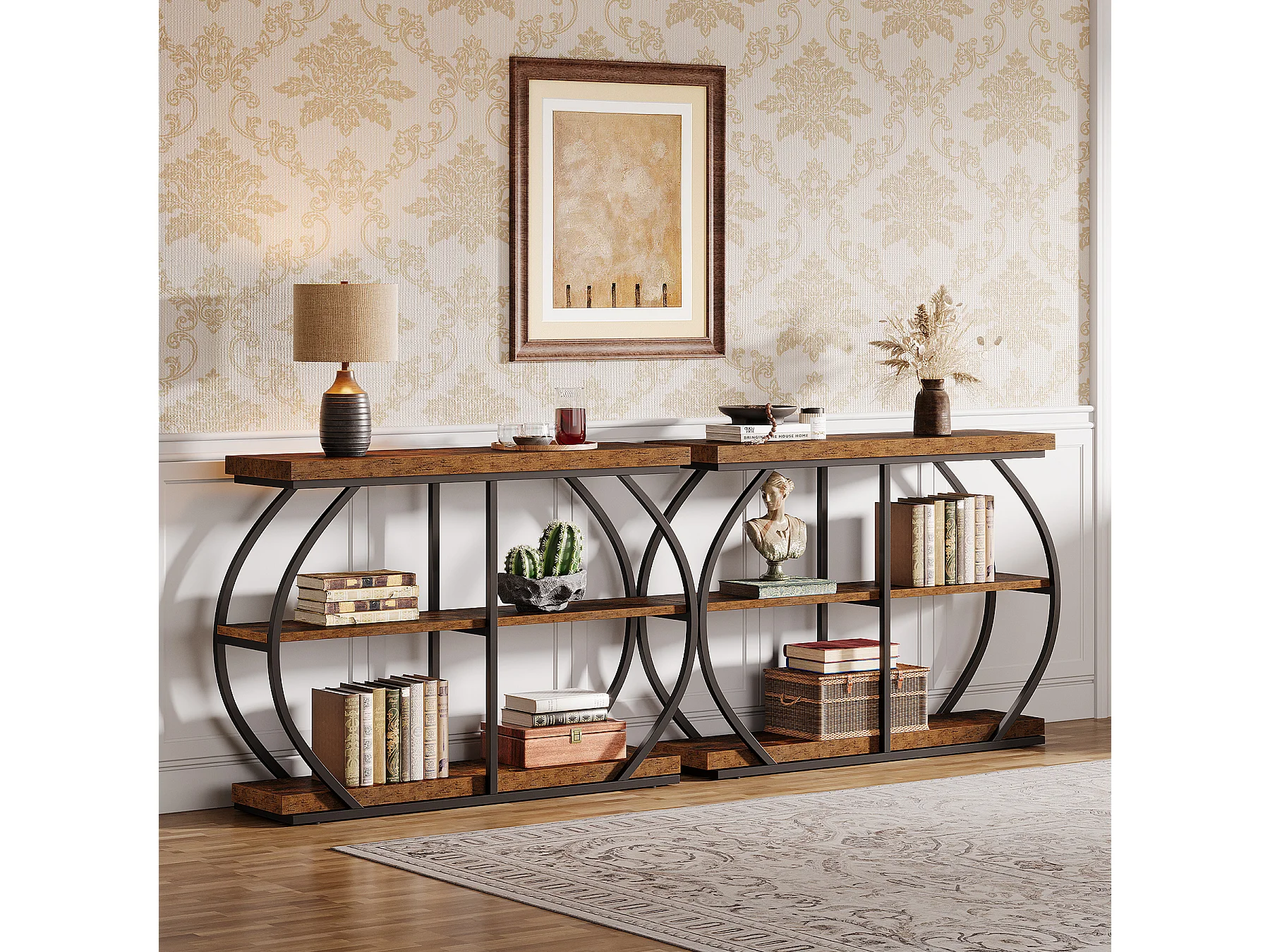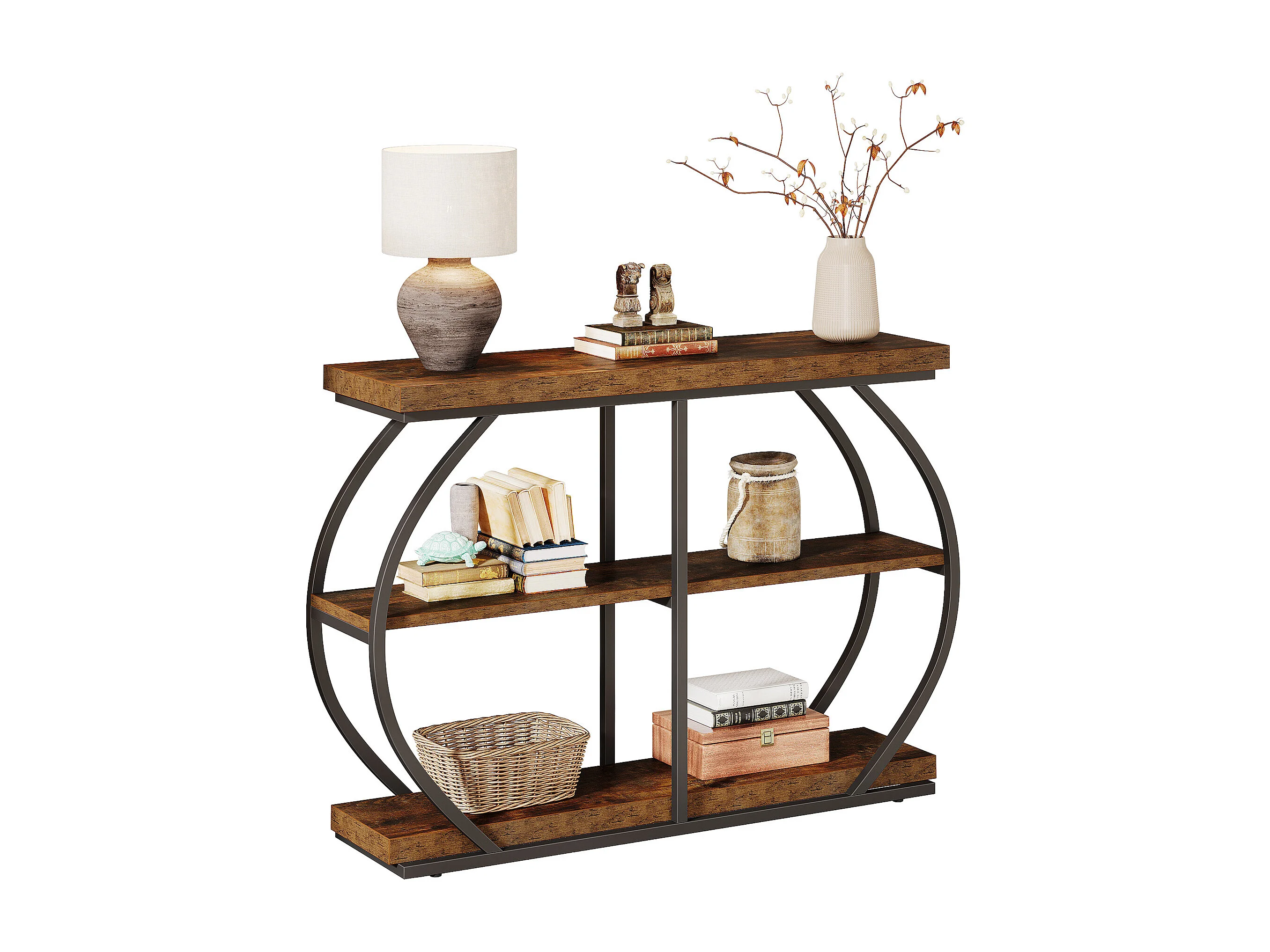 Table console industrielle à 3 niveaux avec cadre en métal arqué et étagères de rangement