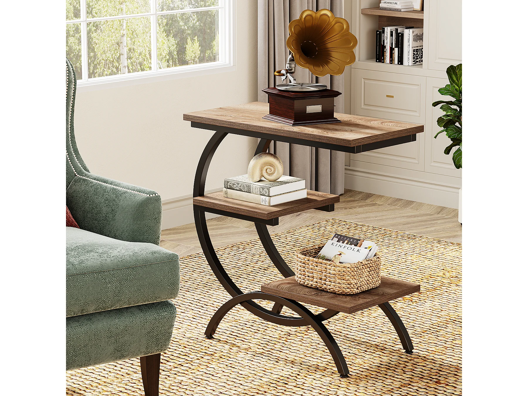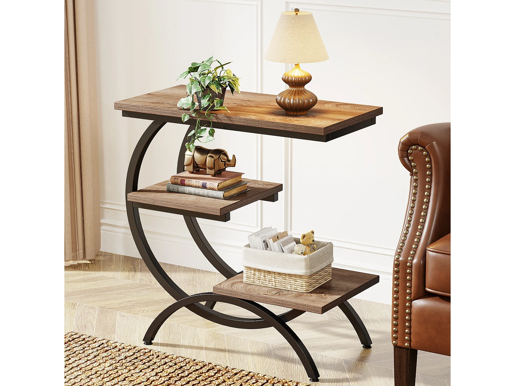 Table d'appoint étroite avec 3 étagères de rangement, style industriel, en forme de C, idéale pour un petit canapé.