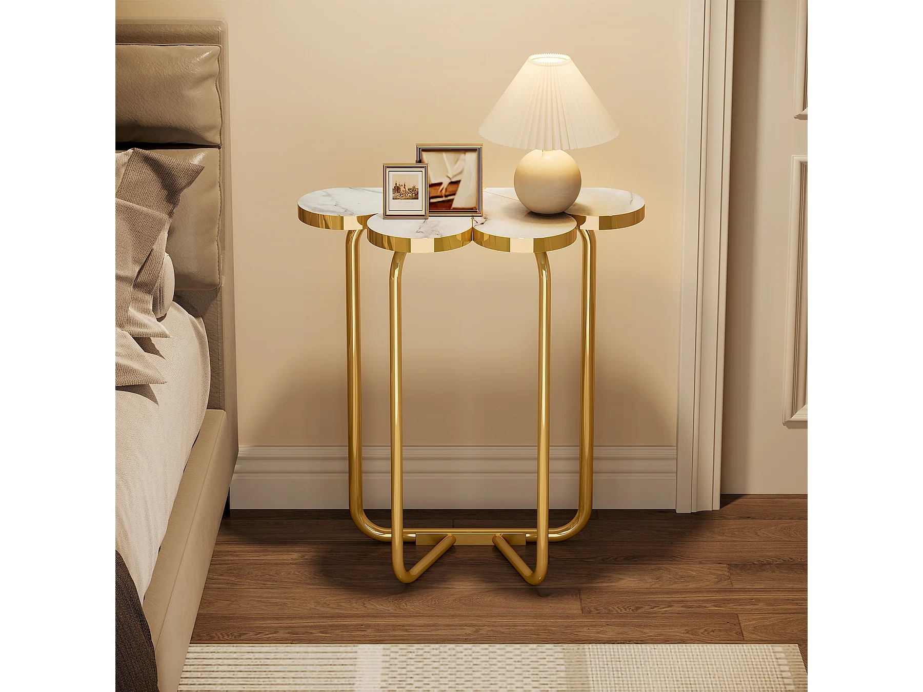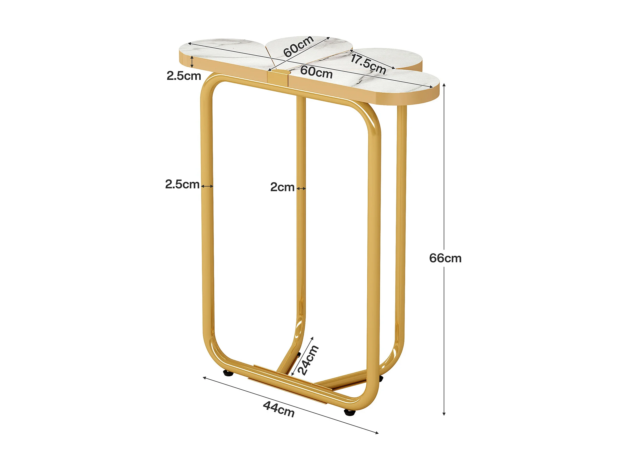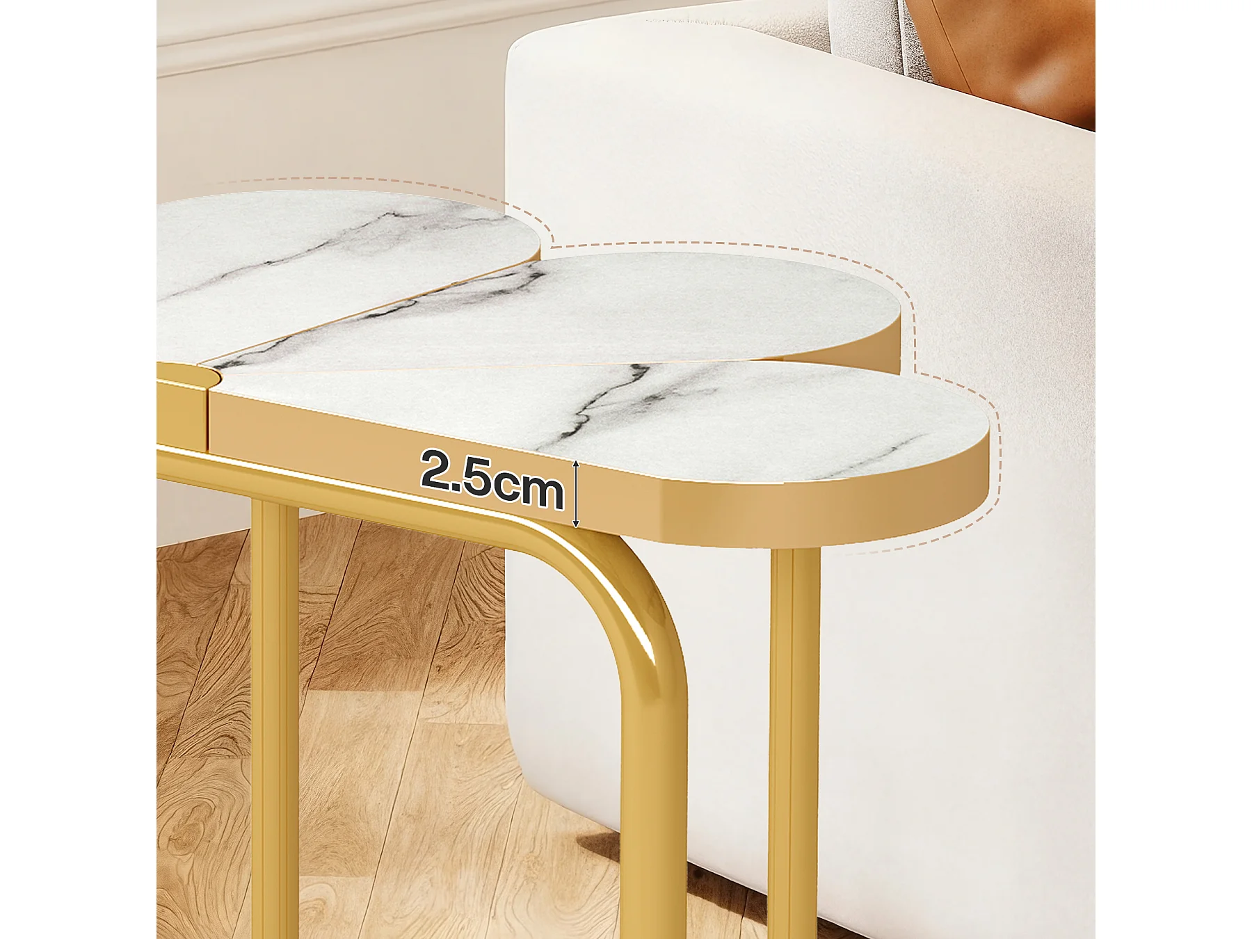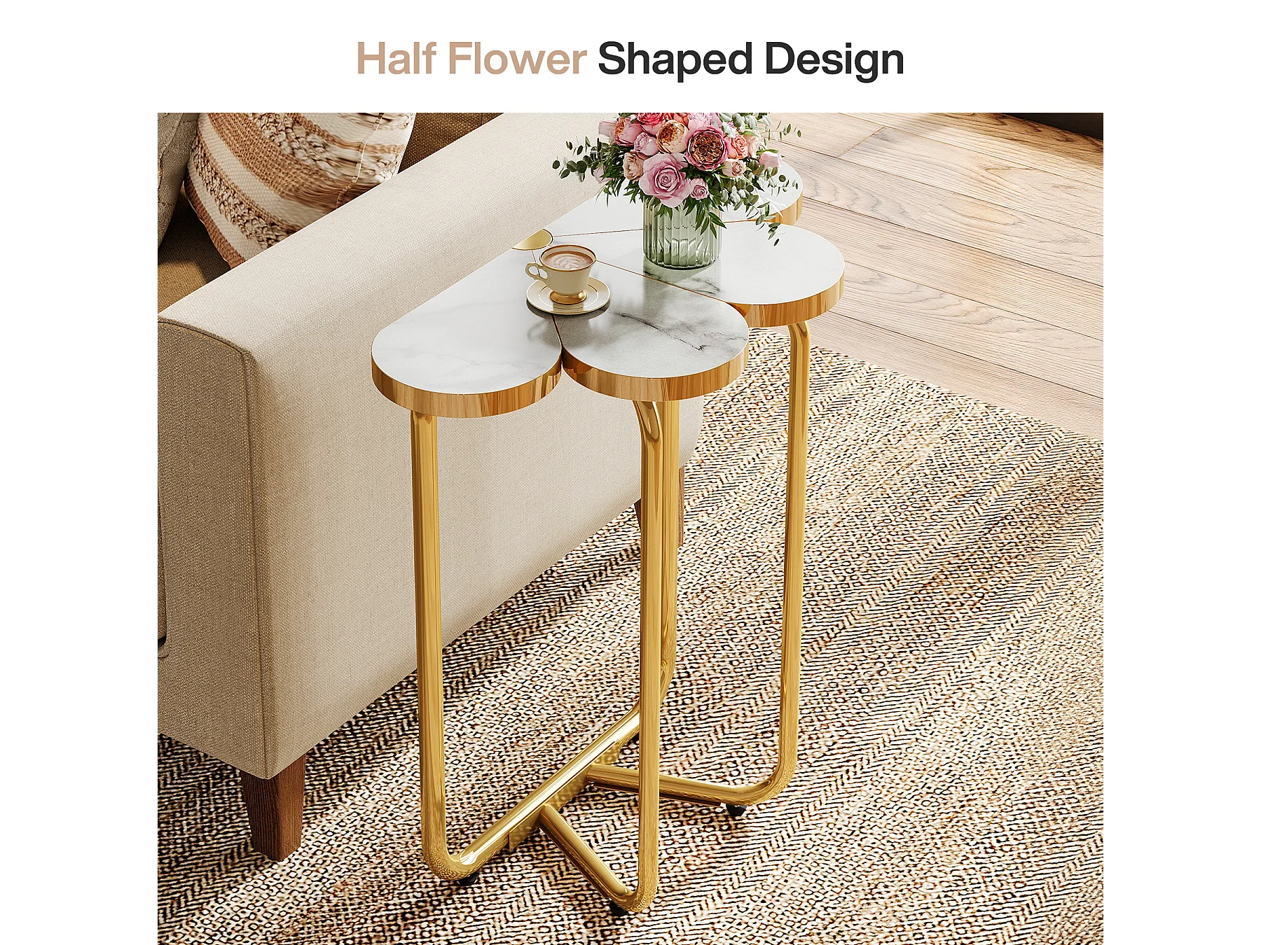 Table d'appoint étroite, table d'appoint demi-fleur avec cadre doré élégant et finition imitation marbre