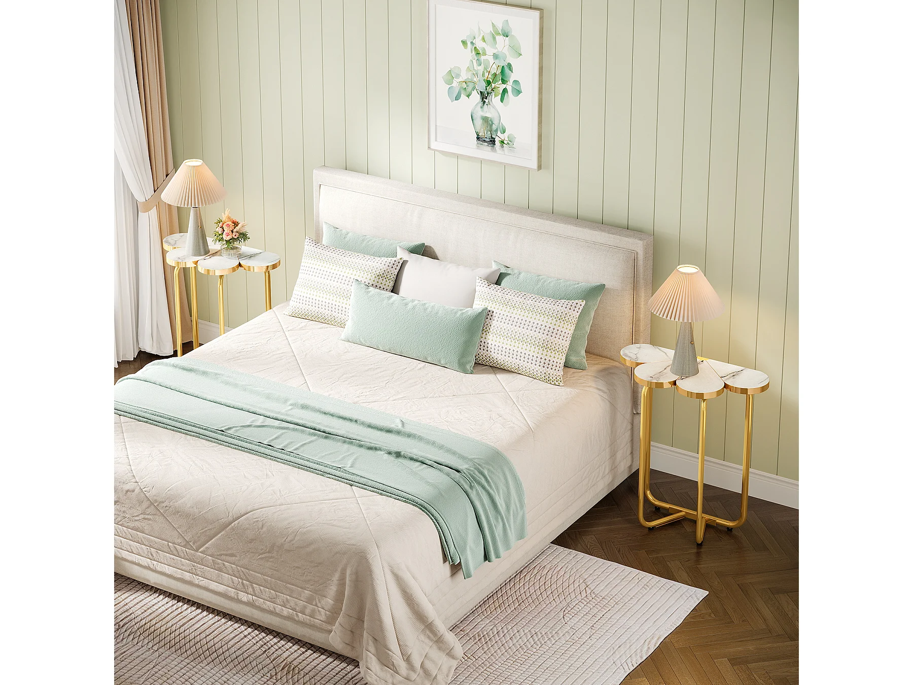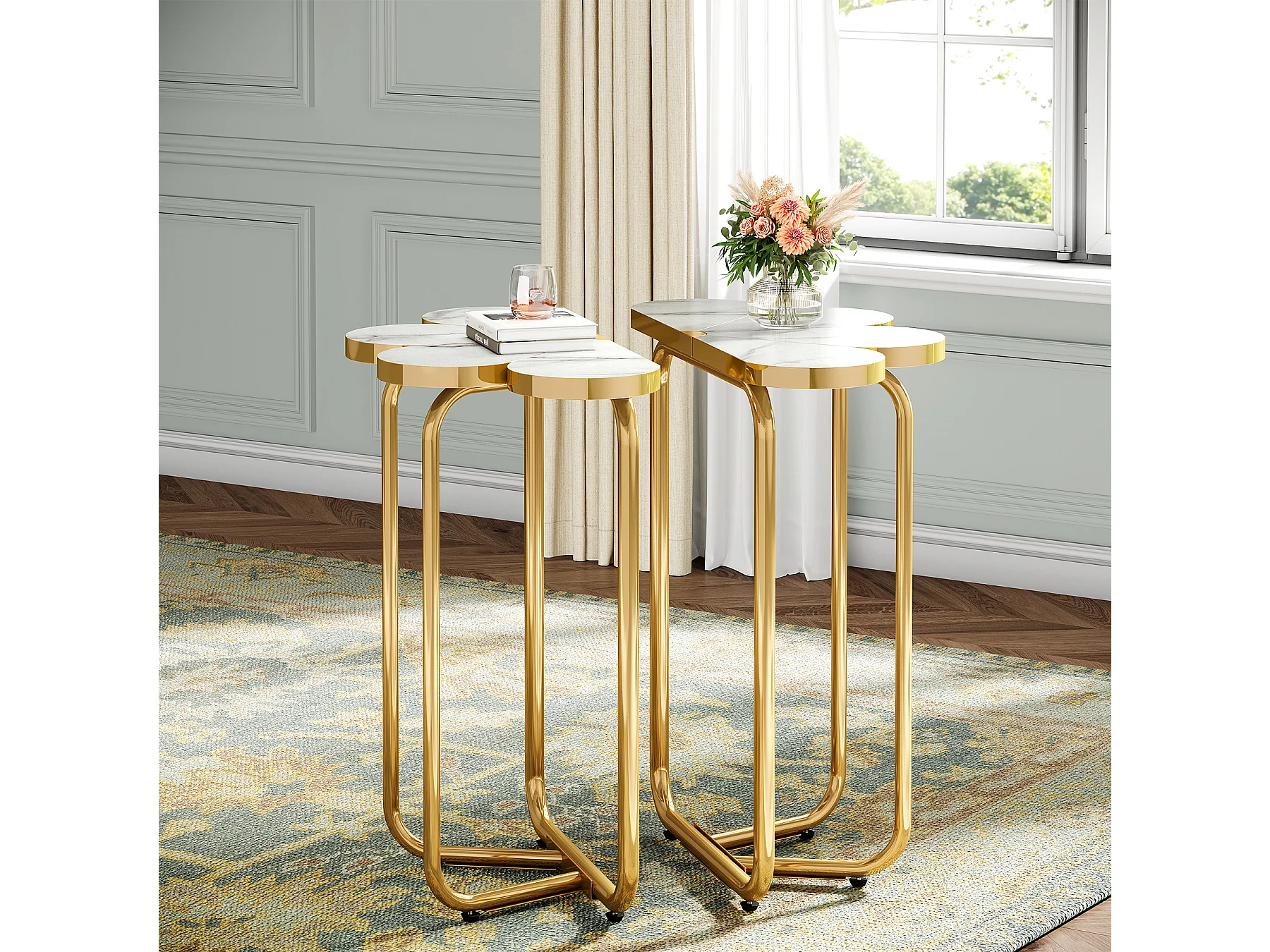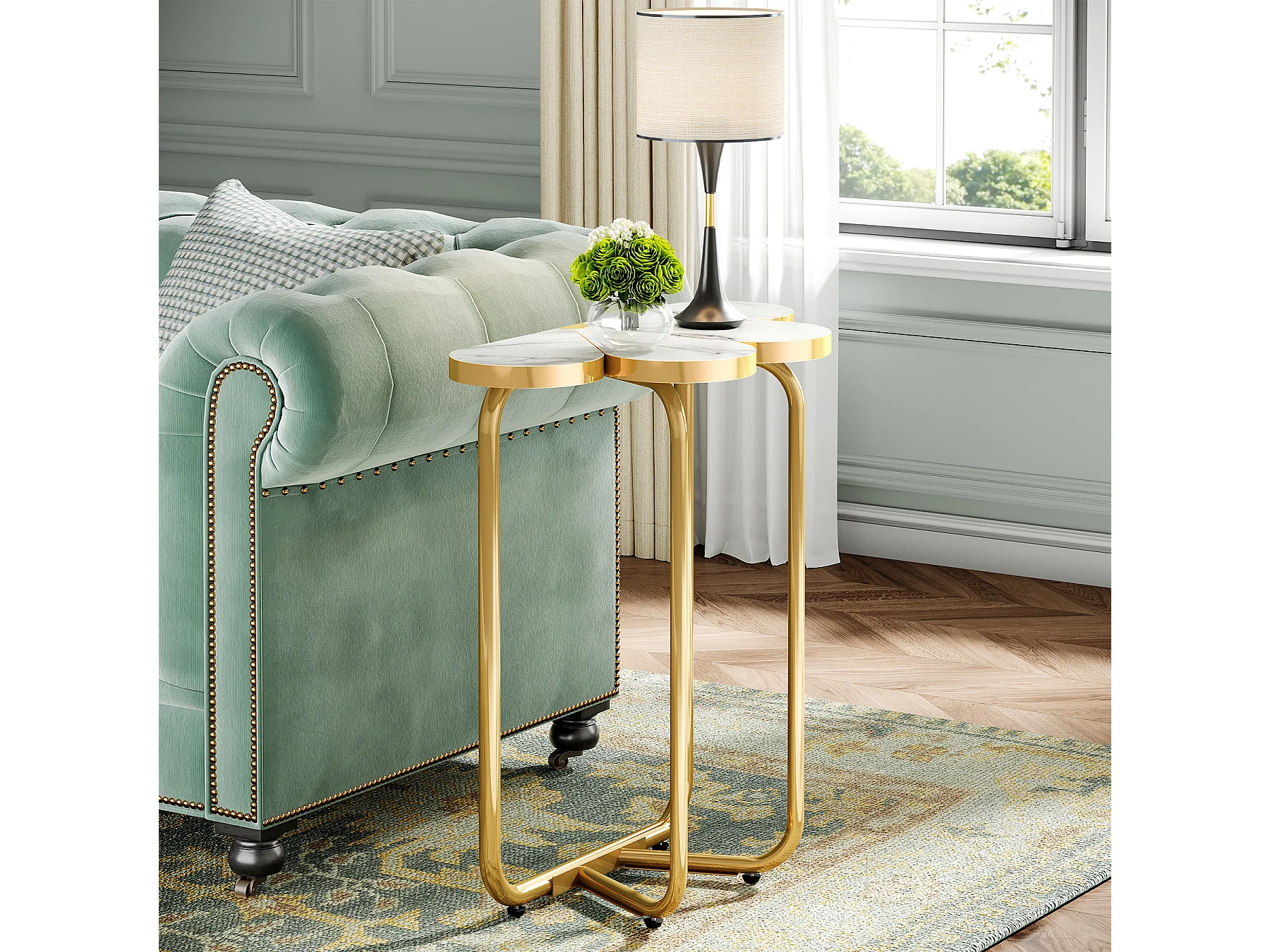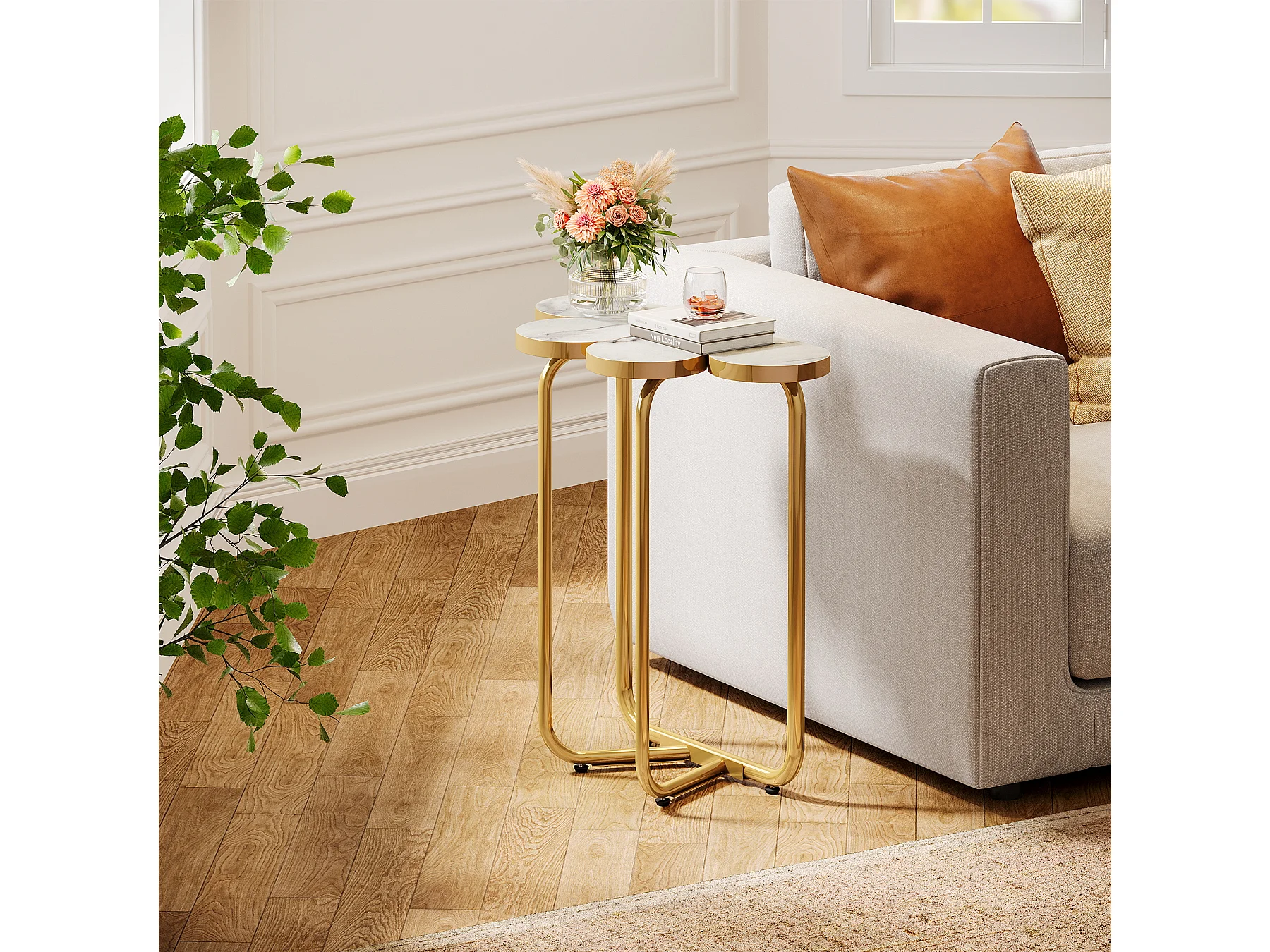 Table d'appoint étroite, table d'appoint demi-fleur avec cadre doré élégant et finition imitation marbre