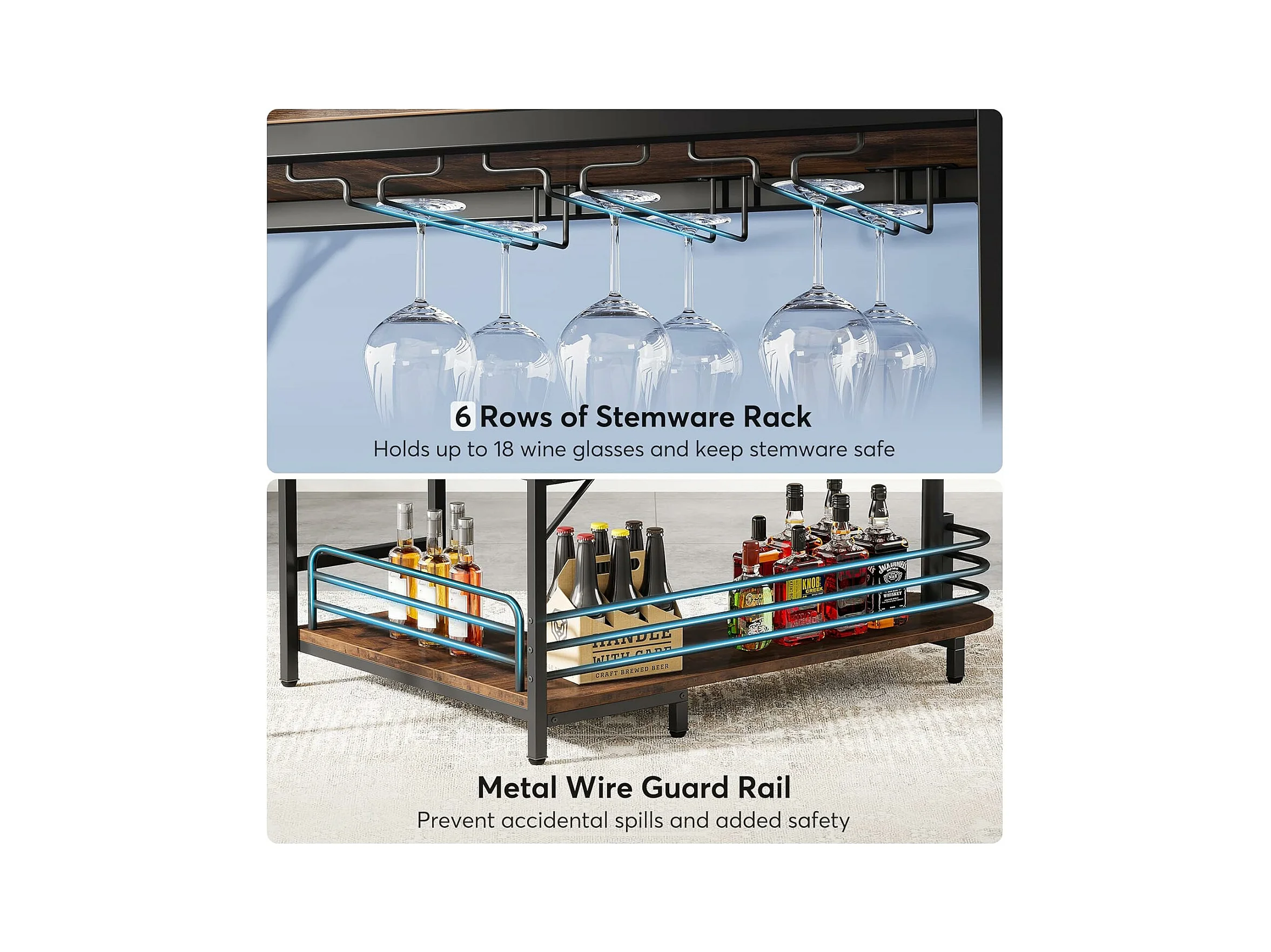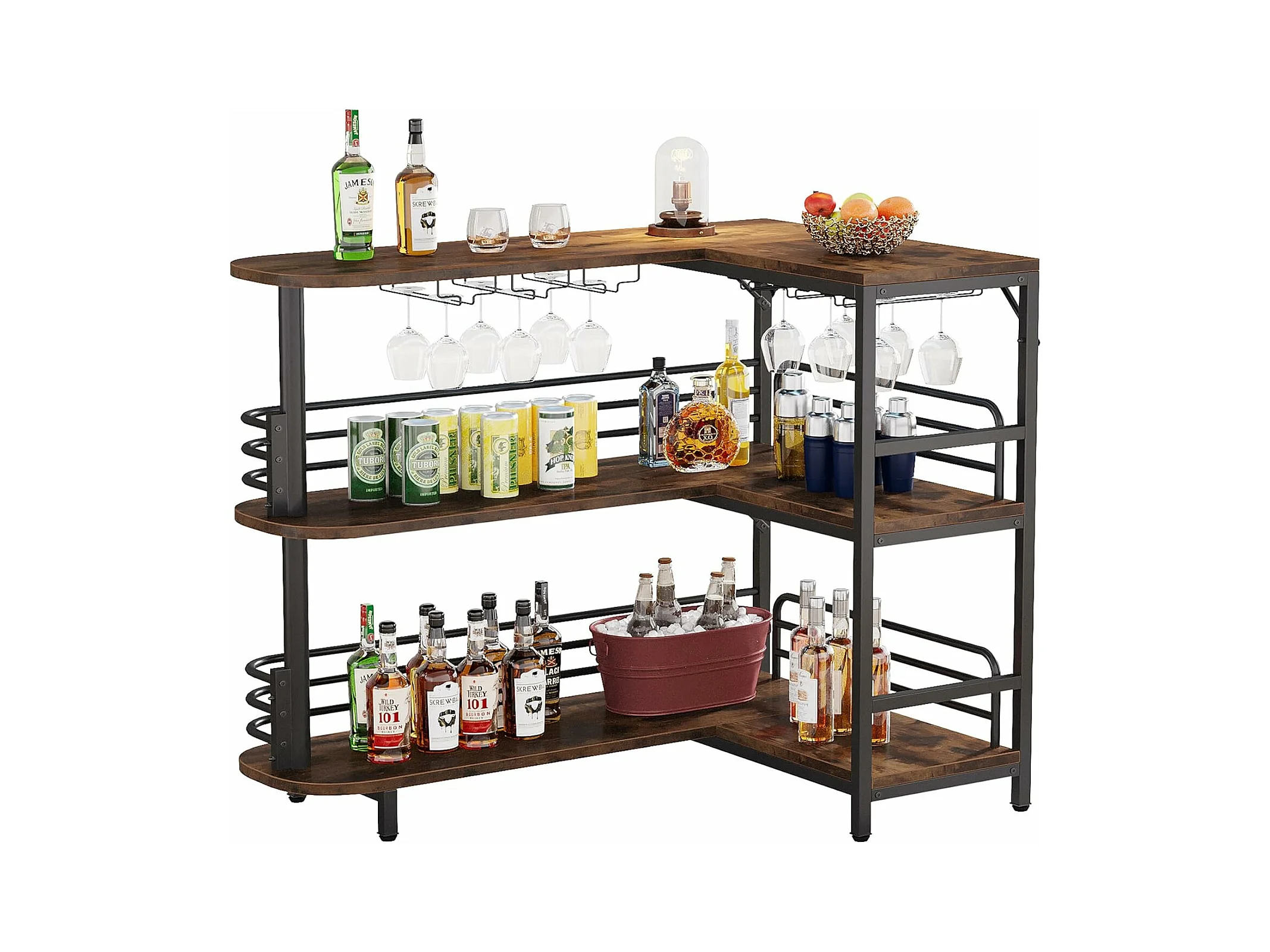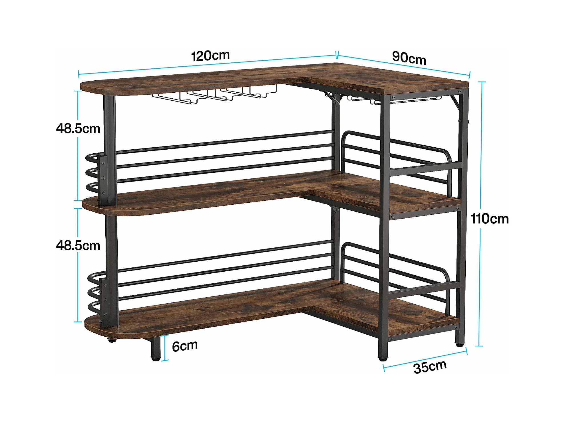 Table de Bar en Forme de L, 3 Tiers Liquor Table de bistrot avec étagère à vin et Support pour Les Verres à vin, Brun Rustique