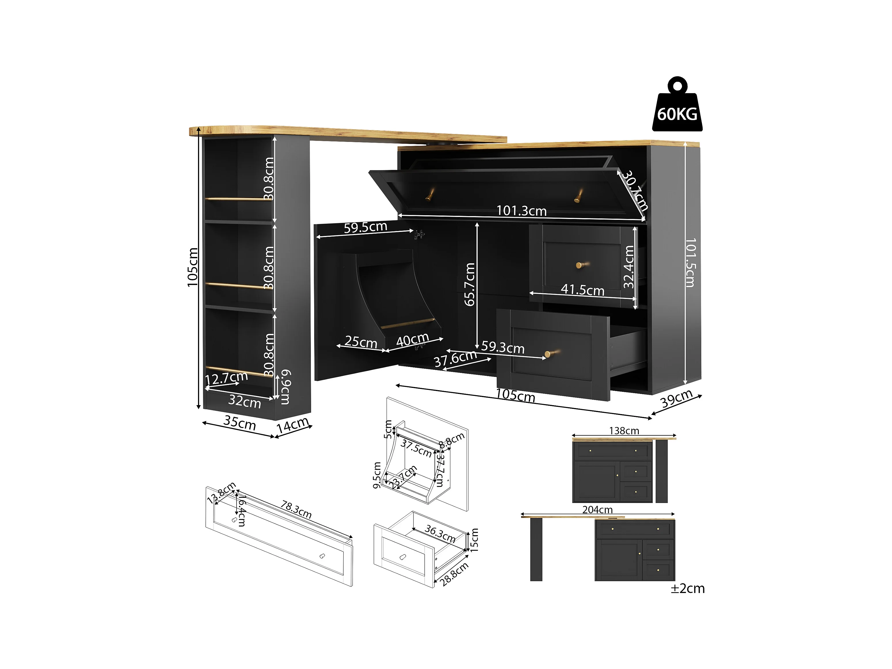 Bartisch Ausziehbar, 360° Drehbar, Stauraum, MDF, Schwarz (138-204x39x104 cm)