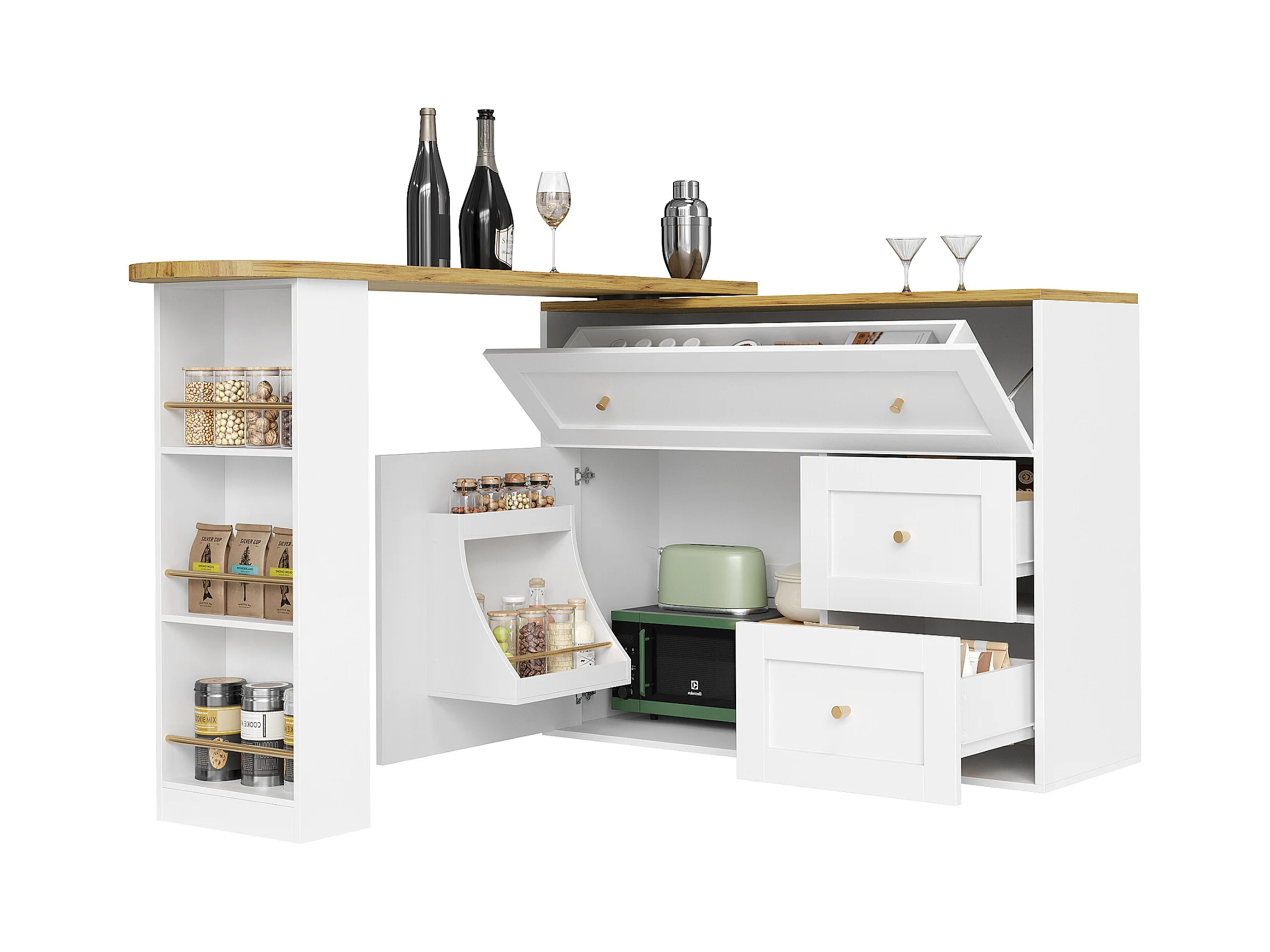 Meuble de bar rotatif - Table de bar extensible avec 2 tiroirs et 1 porte vitrée - rangement ouvert - blanc