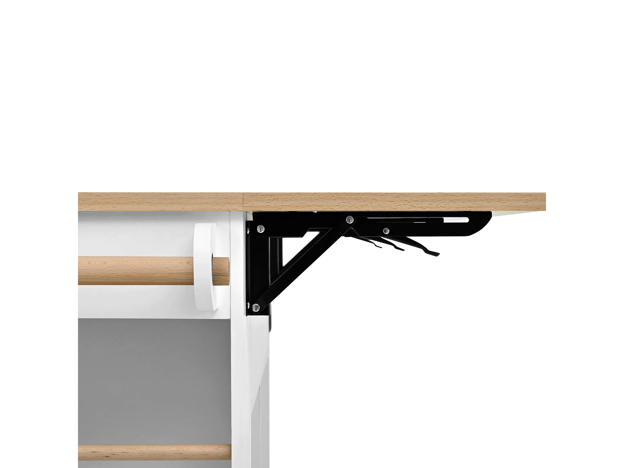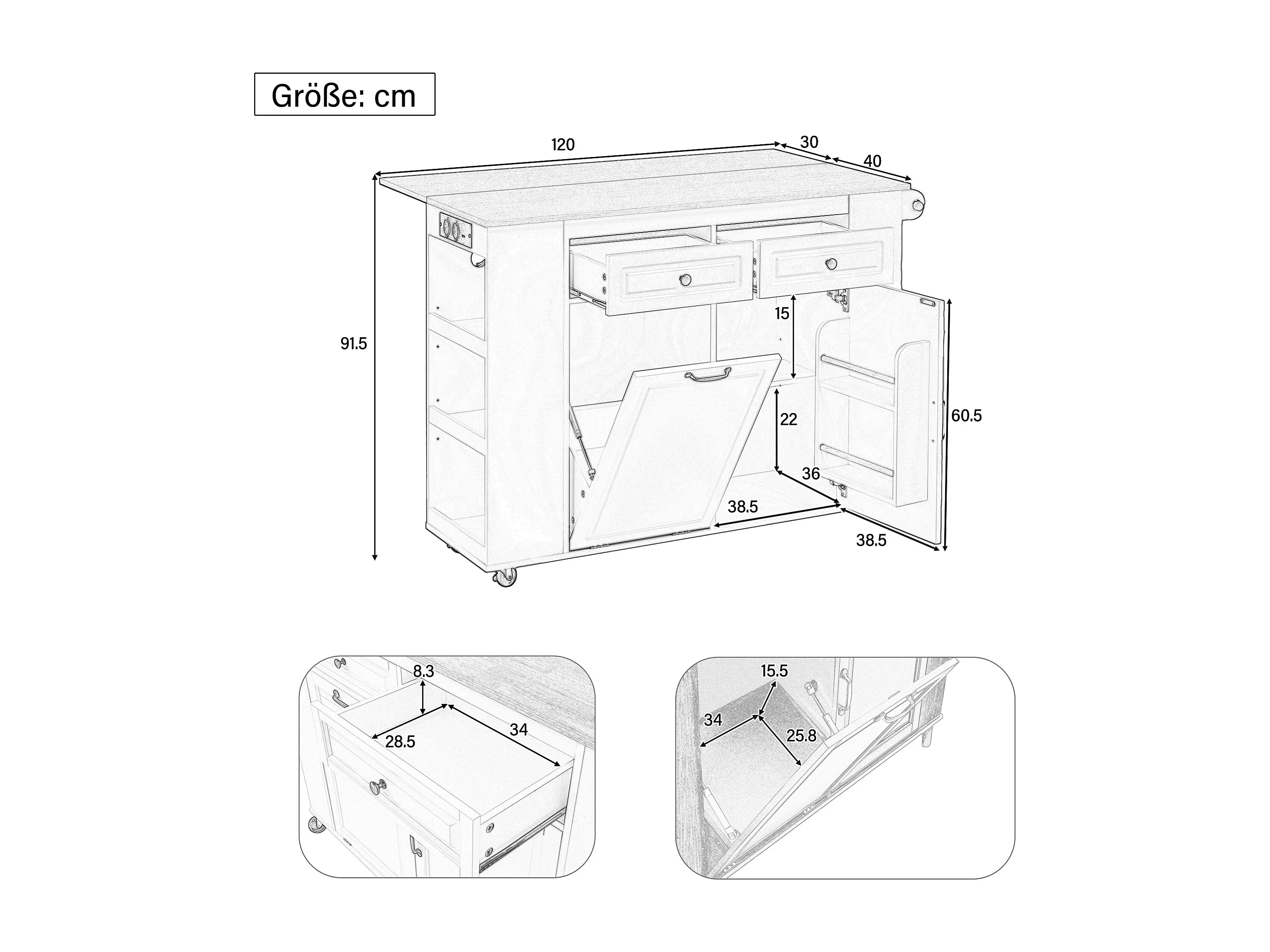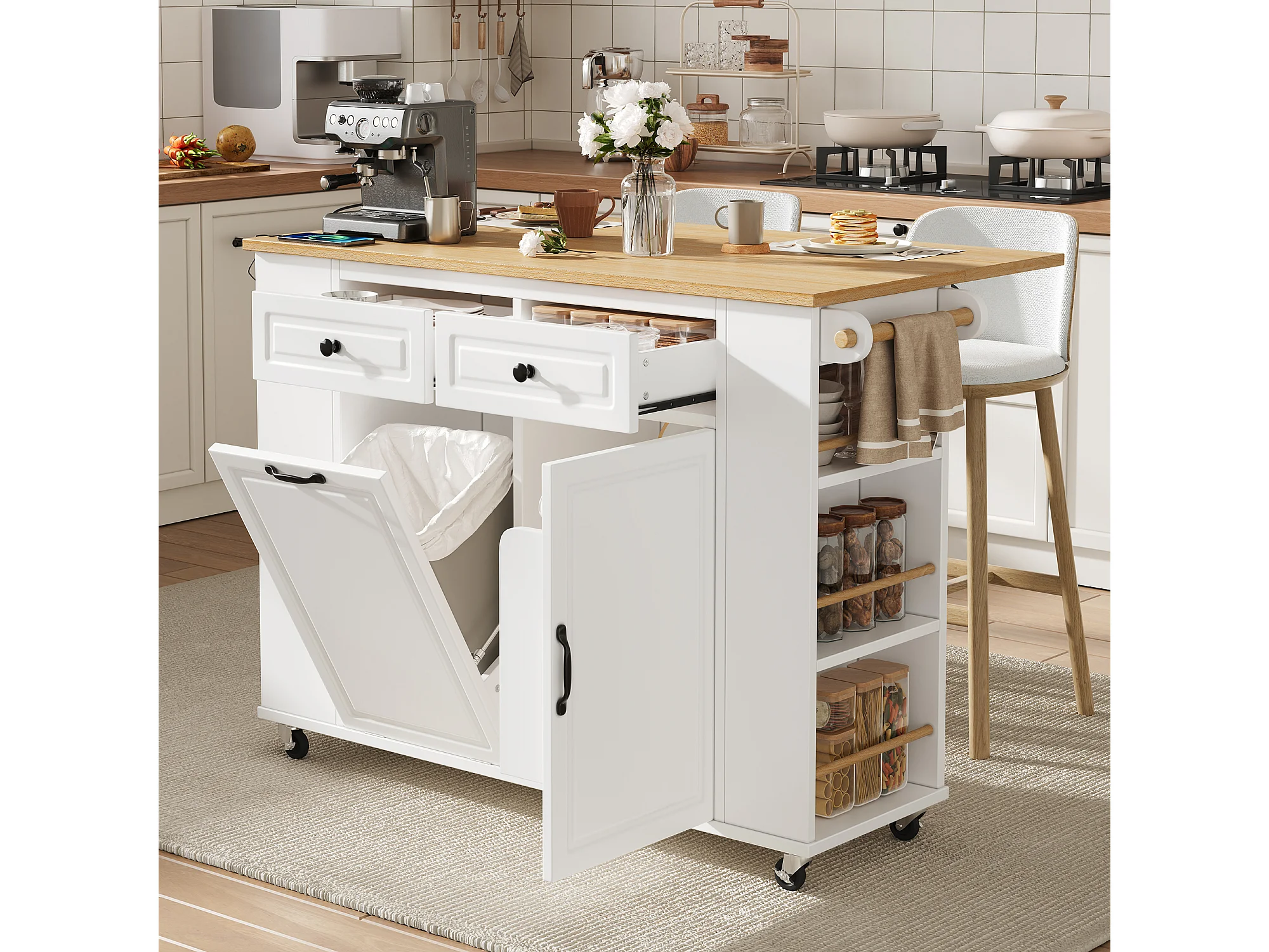 Îlot de cuisine 120x40-70x91.5 cm, plateau rabattable avec prises et USB, roulettes, support poubelle, MDF, blanc naturel