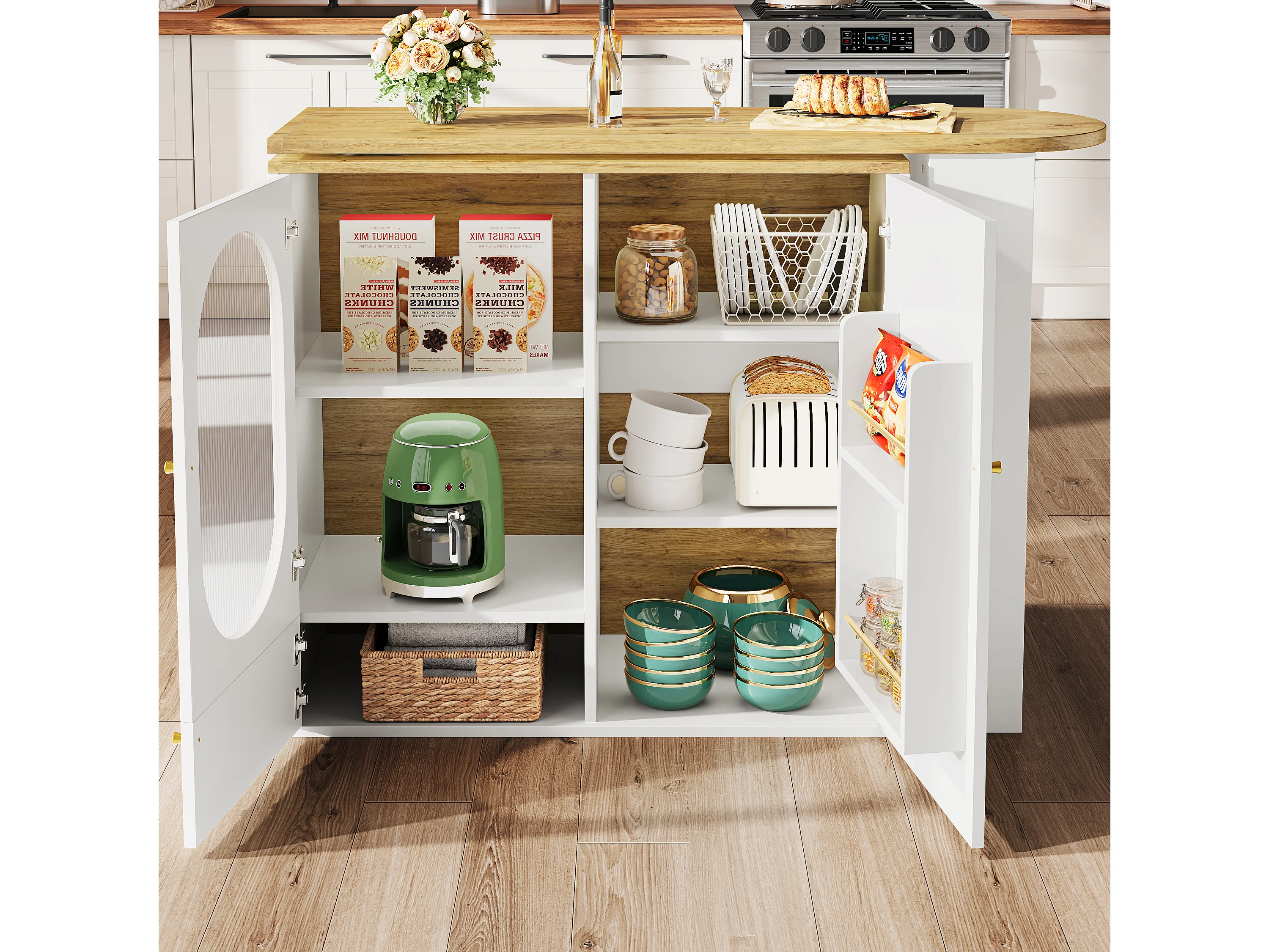 Îlot de cuisine 138x39x105 cm, plateau rotatif 360°, grand rangement à 3 portes, MDF et métal, blanc