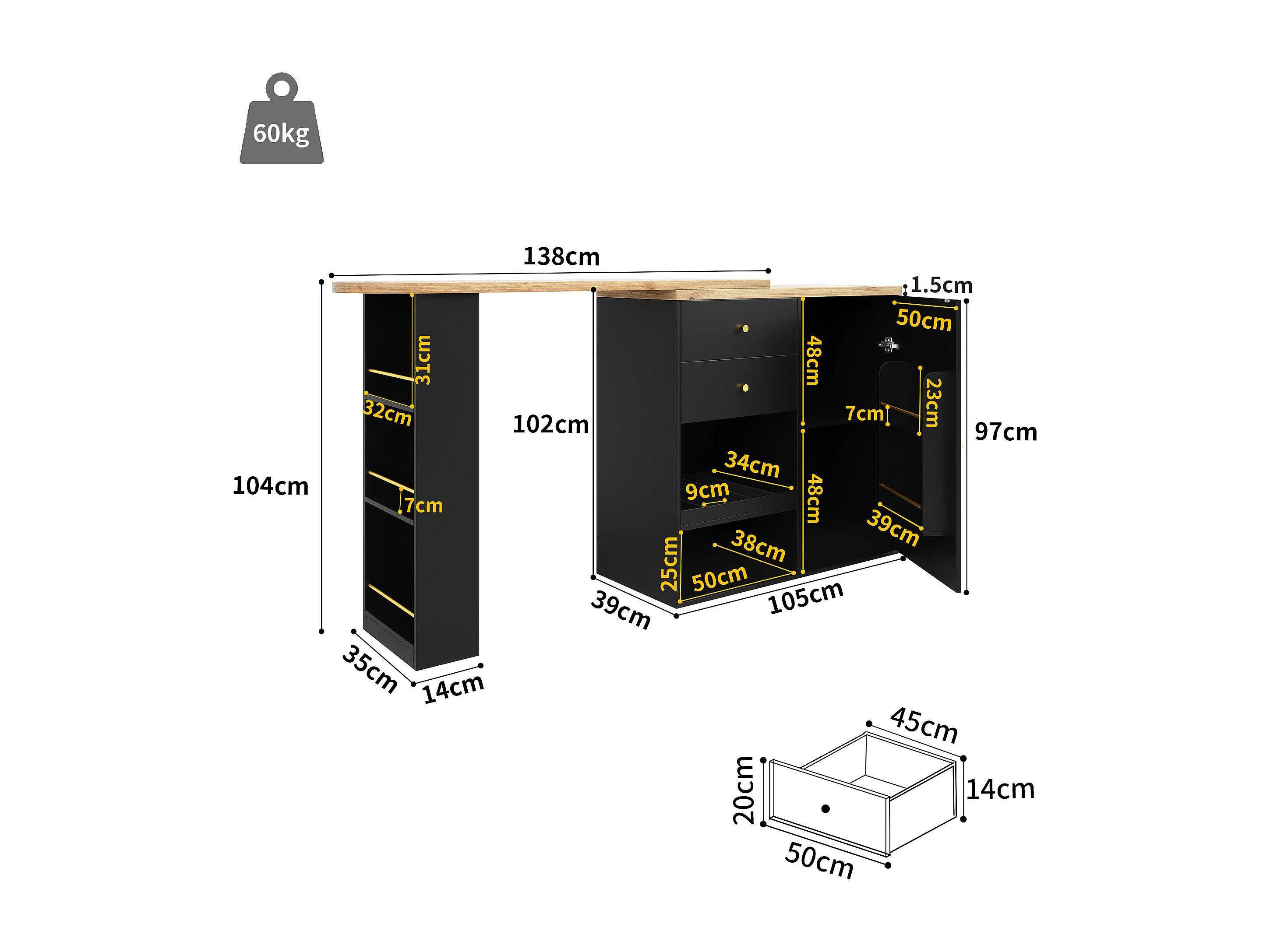 Meuble de rangement modulable 105x39x102 cm, côtés pivotants, 4 tiroirs, étagères ouvertes 3 niveaux, MDF noir