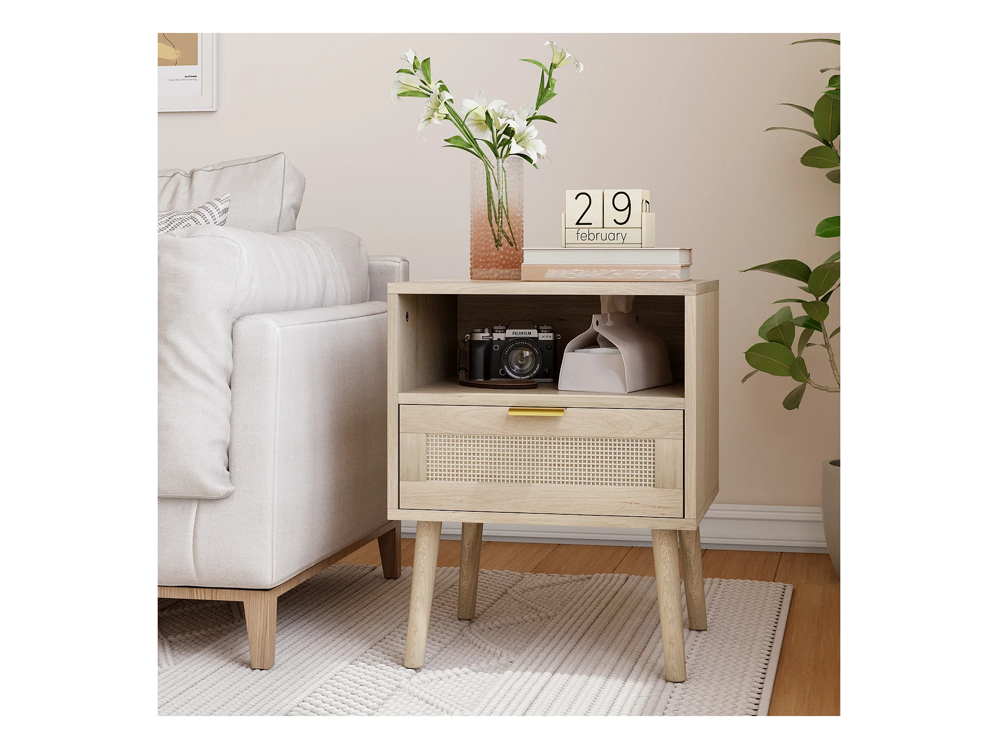 Table de chevet avec 1 tiroir - Table de chevet avec étagères ouvertes et design en rotin - bois - pour chambre