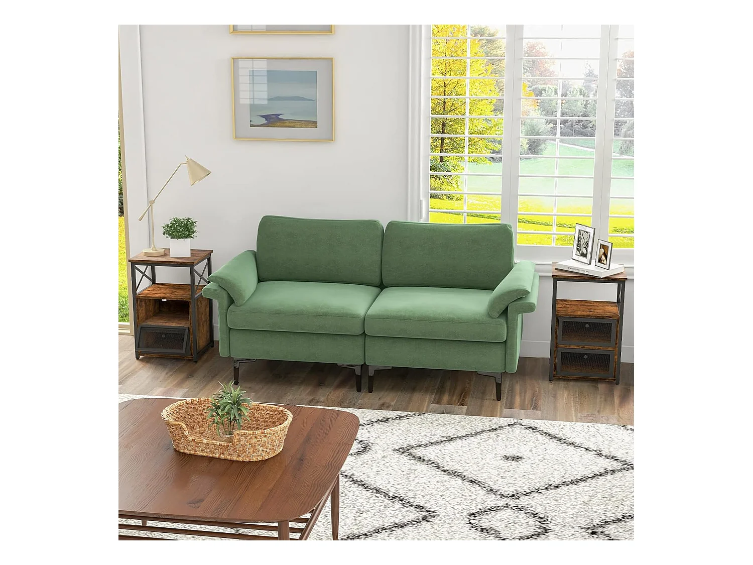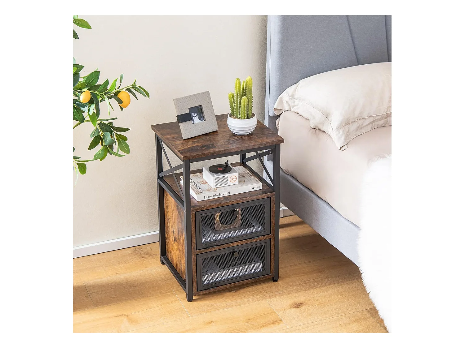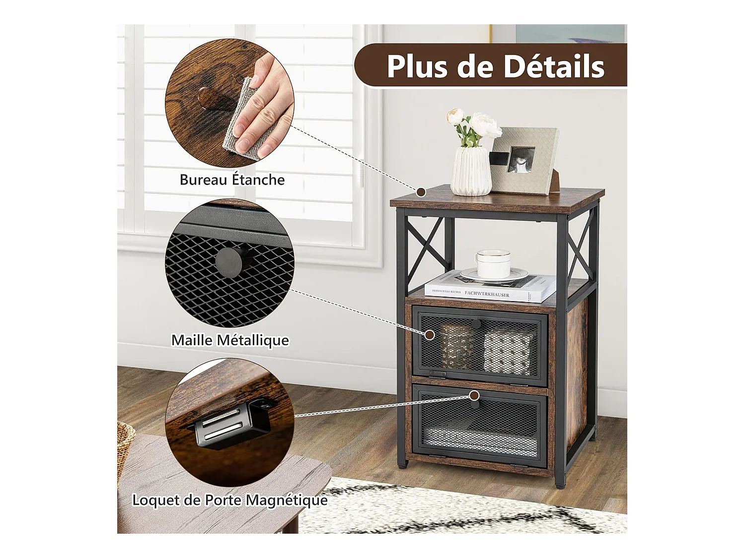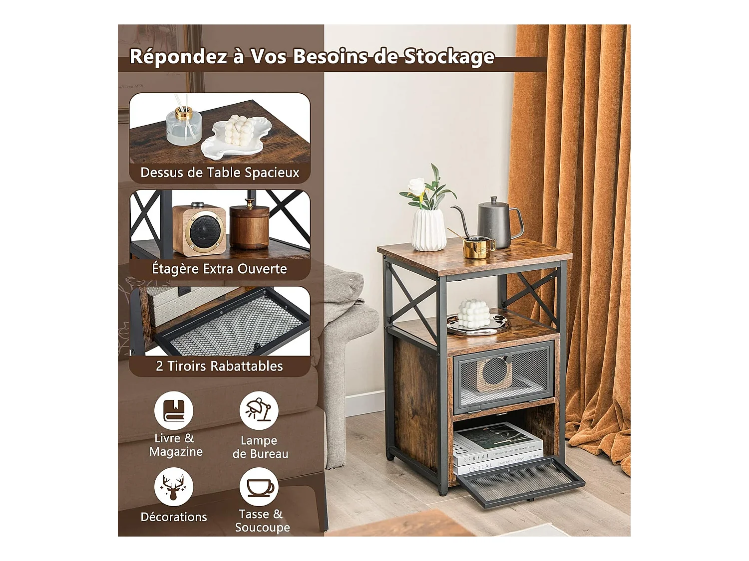 Table de Chevet Industrielle à 2 Compartments et 2 Étagères, Bout de Canapé Cadre Métal avec Porte à Bascule en Maille Fer, Table d’Appoint 60,5 x 40 x 35 cm