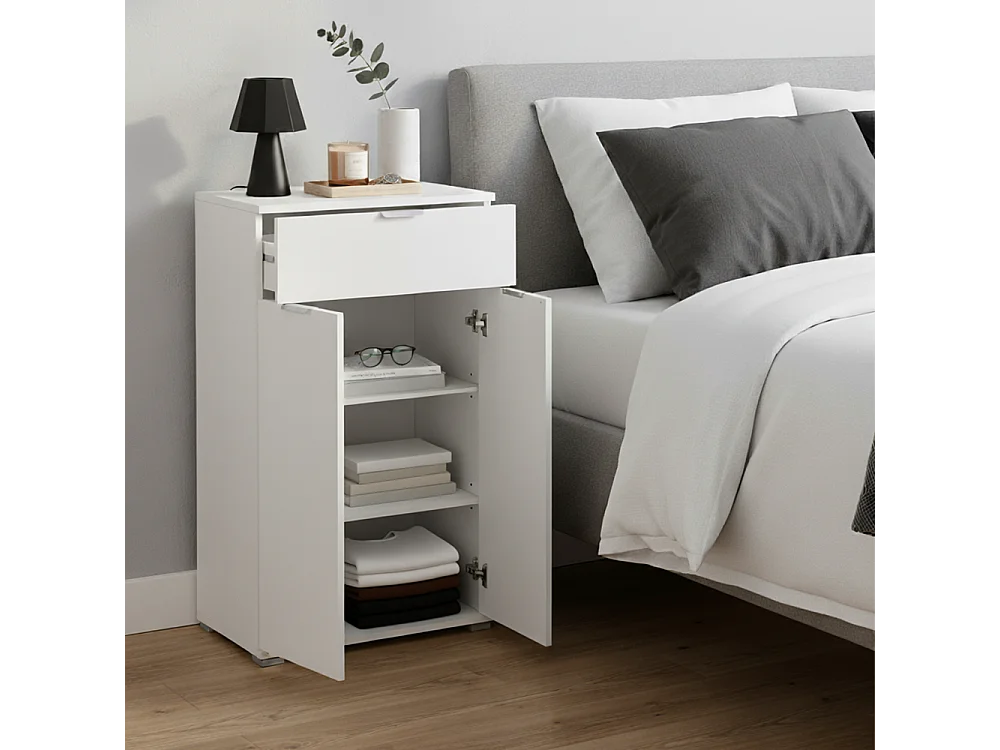 Table de Chevet/Armoire Blanche 2 Portes + Tiroir L45×H85×P38 cm | Meuble Gain de Place Moderne avec 2 Étagères Réglables | Déjà Monté