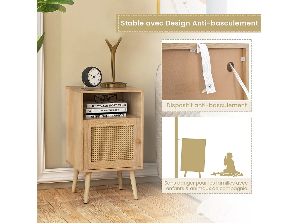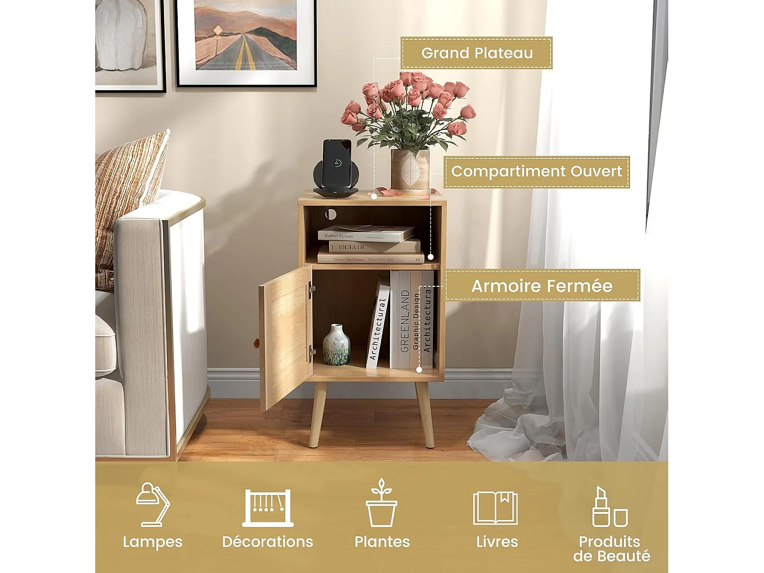 Table de Chevet avec à Porte Cannage et Pieds en Bois Massif, Table de Nuit Bohême, Fermeture Silencieuse, Table d'Appoint ave pour Salon, Chambre, 40 x 39 x 70 cm