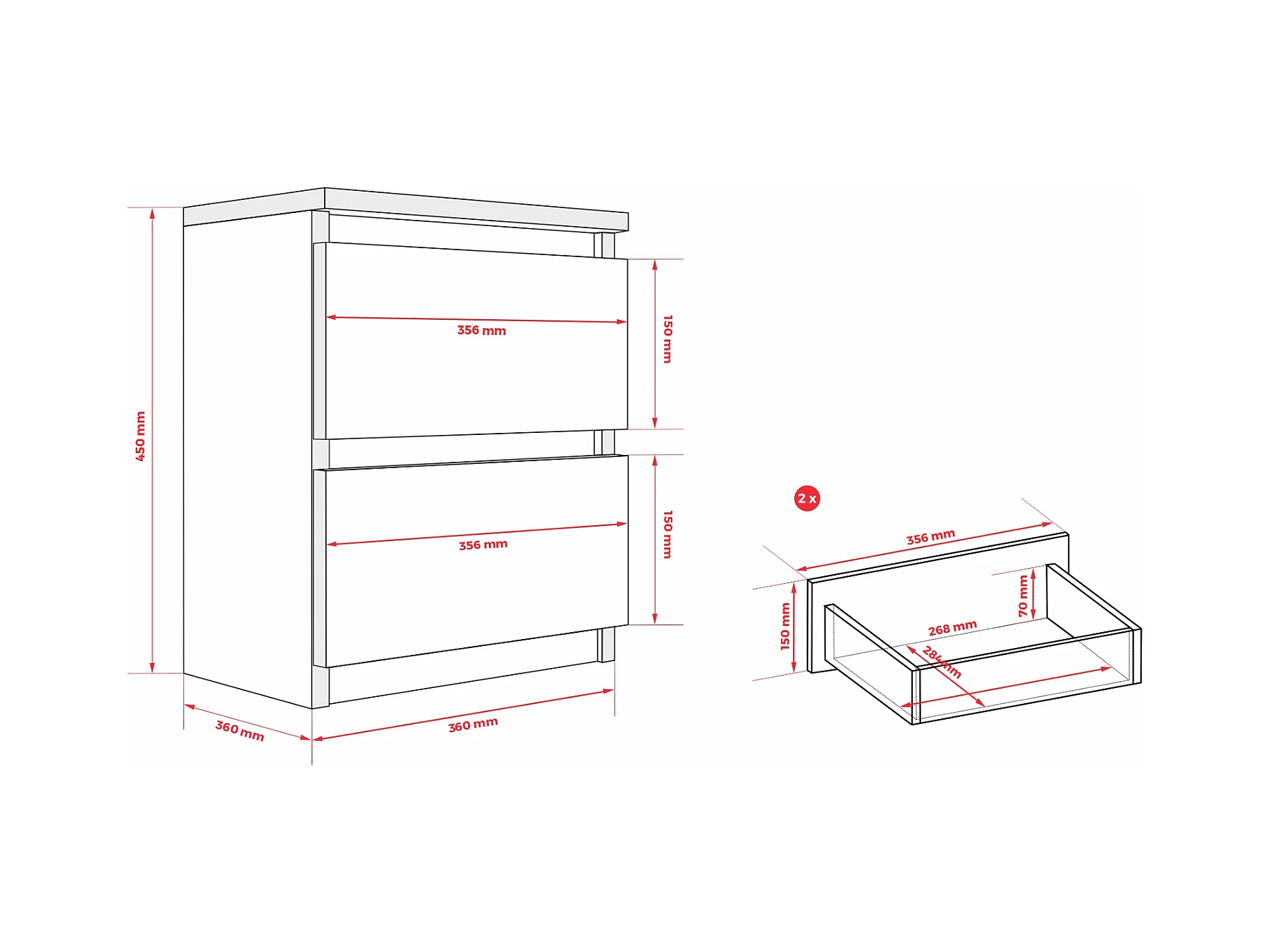 Table de chevet avec deux tiroirs, 45 × 36 × 36 cm, couleur : cachemire
