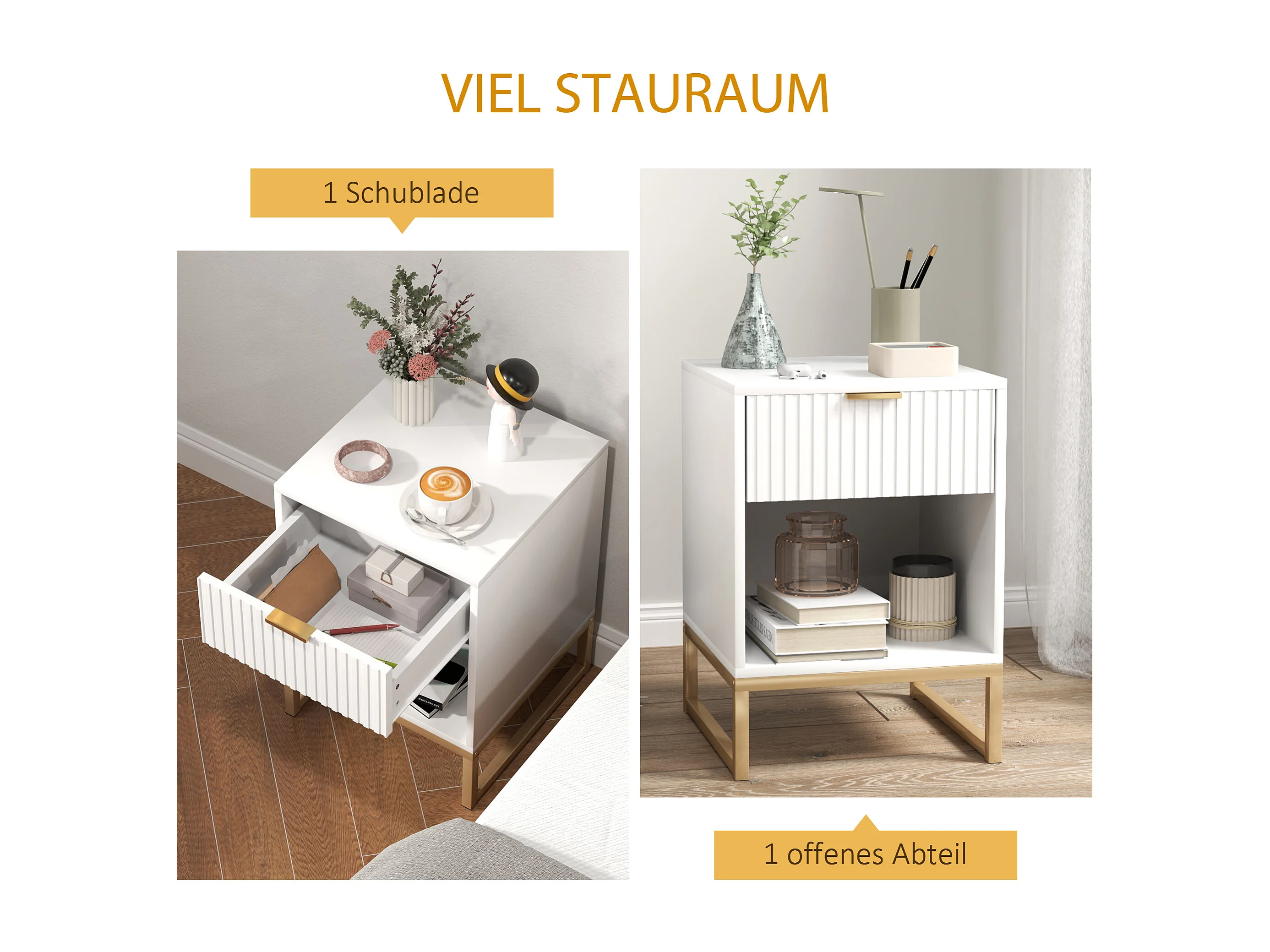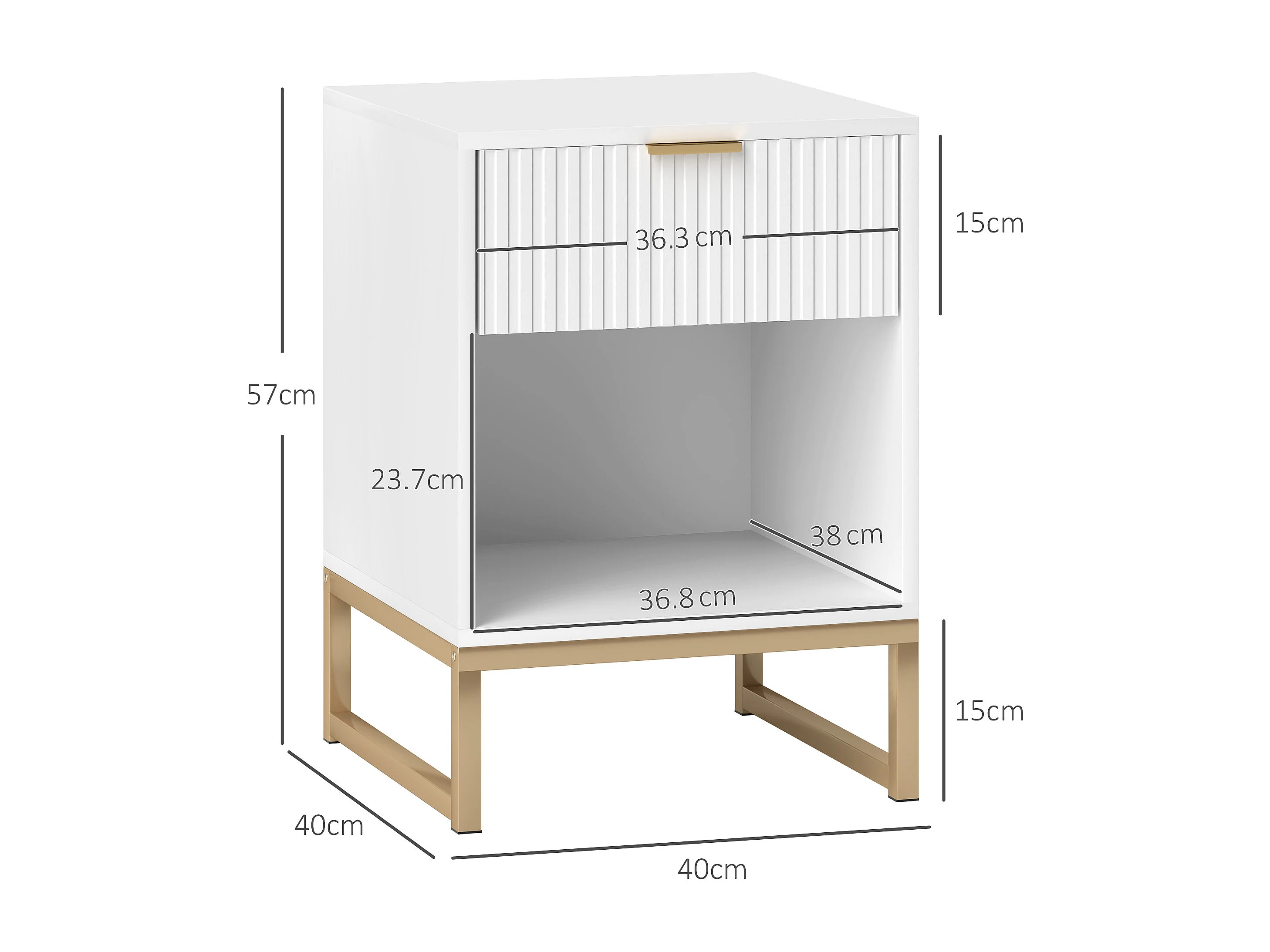 Table de chevet avec tiroir, MDF, blanc, pieds métal, rangement pratique (40x40x57cm)