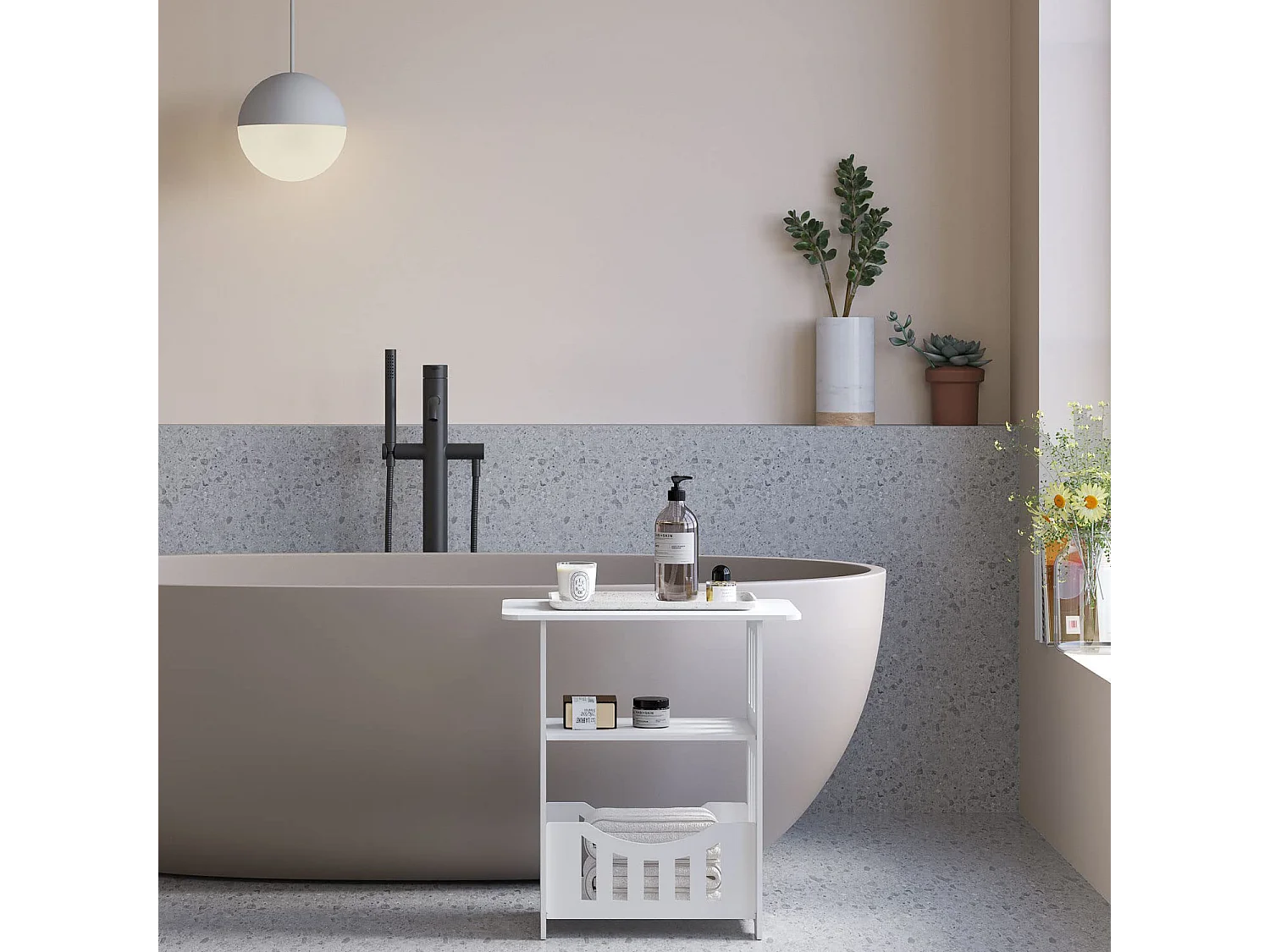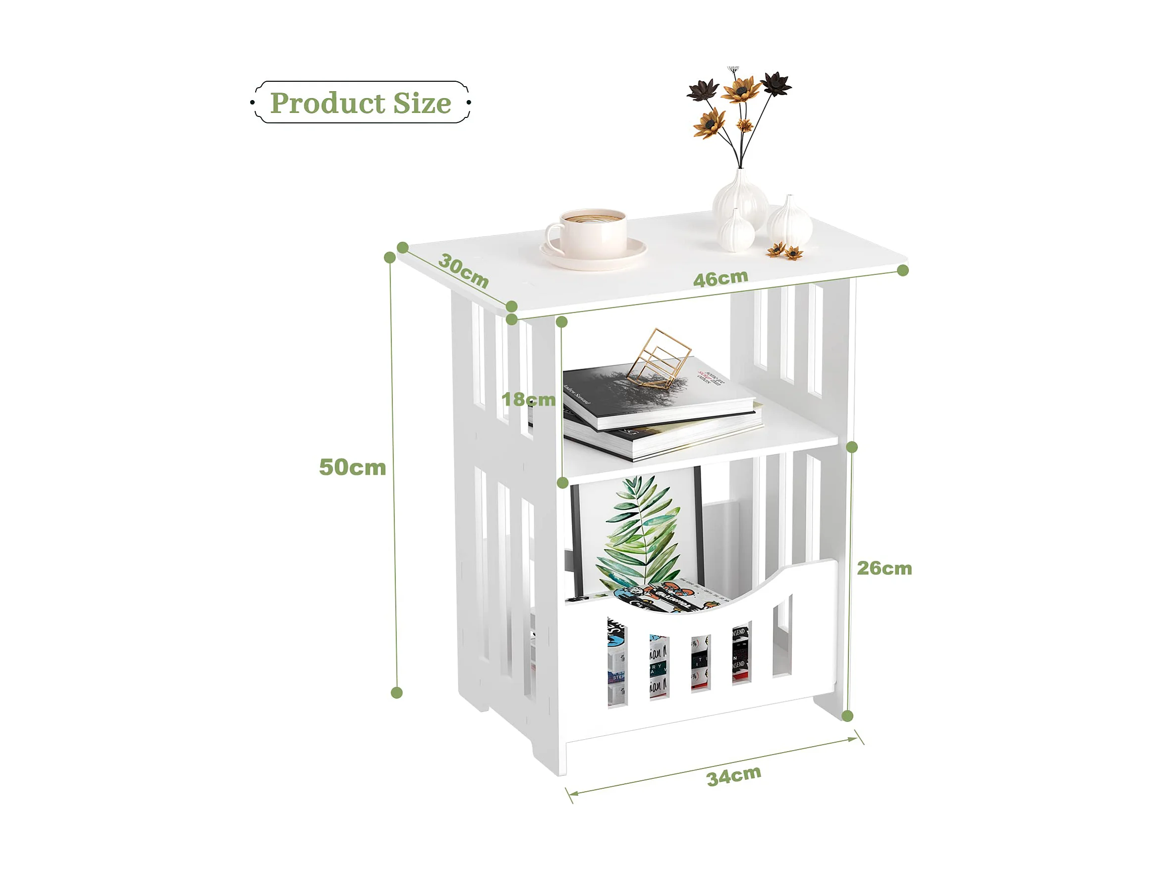 Table de chevet blanche 46x30x50 cm avec panier, idéale comme table de nuit, table à café ou bout de canapé pour salon, chambre, salle de bains ou balcon