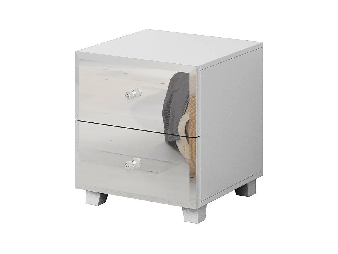 Table de chevet LIVORA – 2 tiroirs – Blanc mat avec façades miroir – Élégance contemporaine
