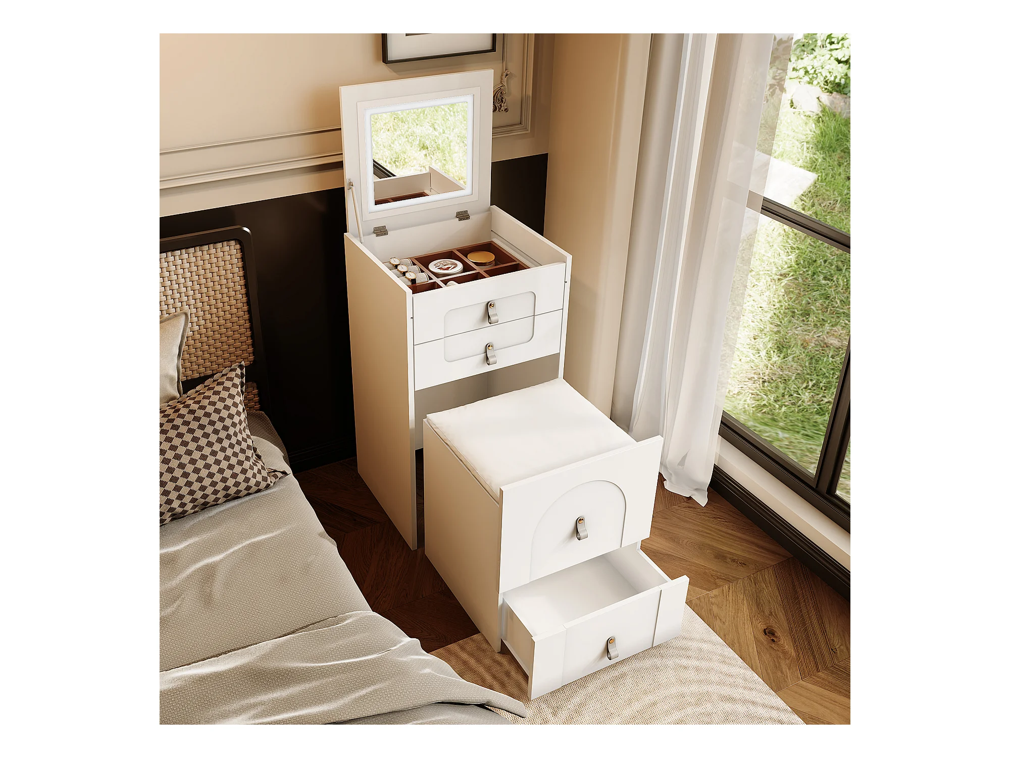 Table de chevet multifonctionnelle - 3 tiroirs & miroir avec LED & siège extractible - MDF - Blanc