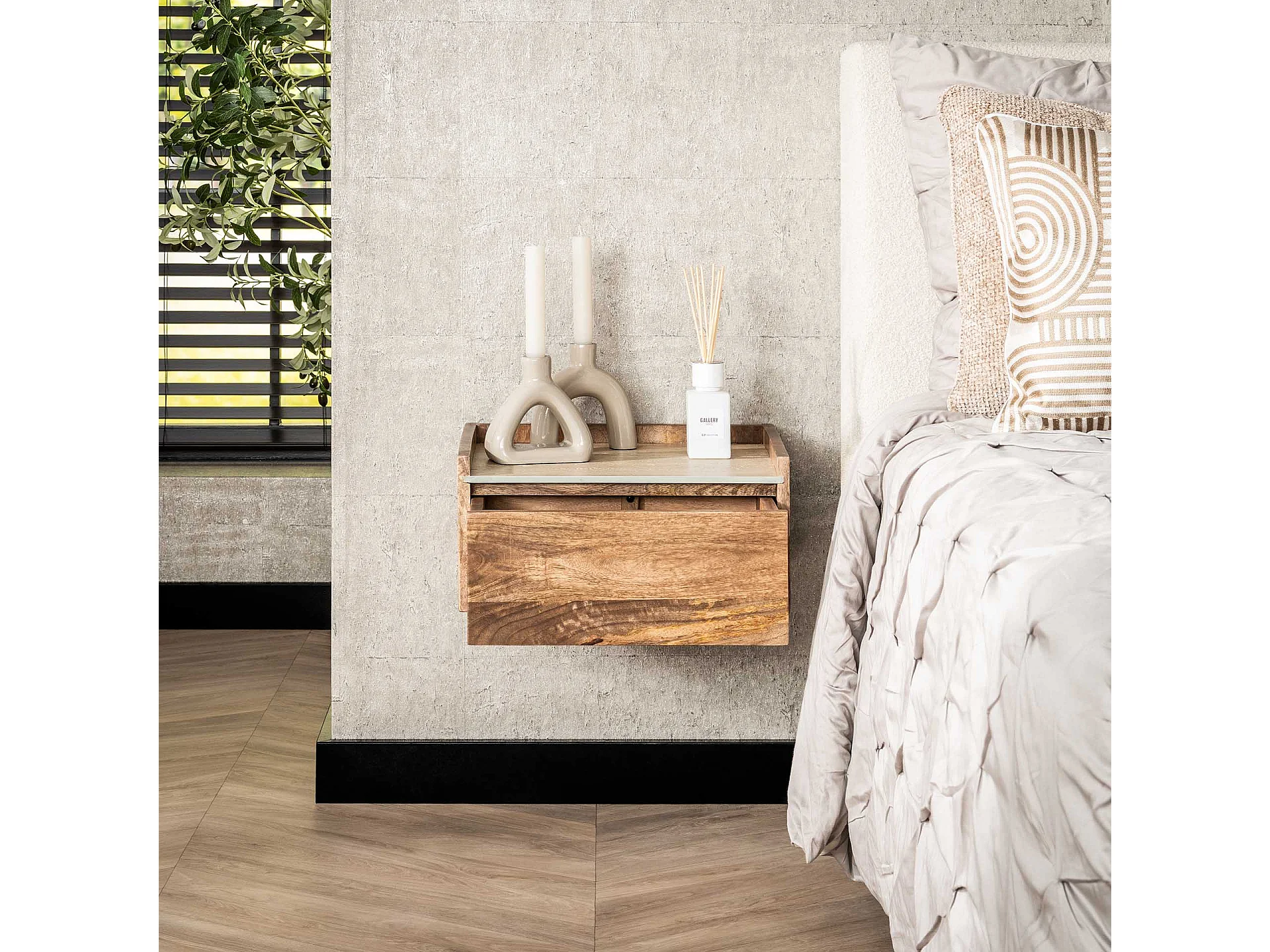 Table de chevet suspendue Nuovo Travertine - Mangue massif couleur sable