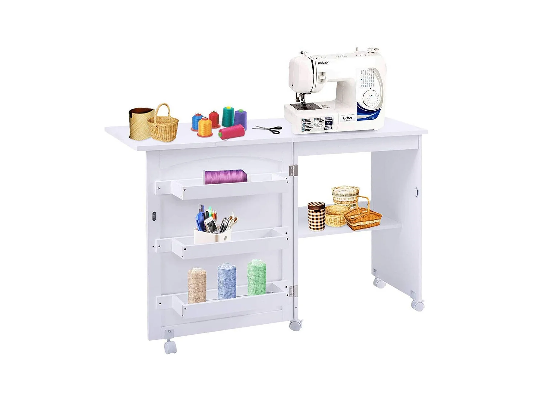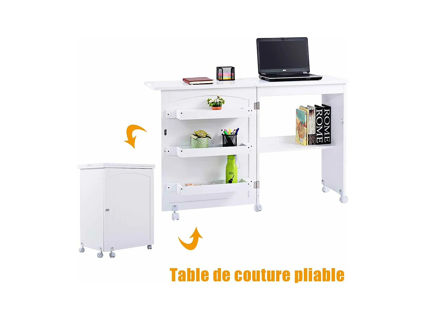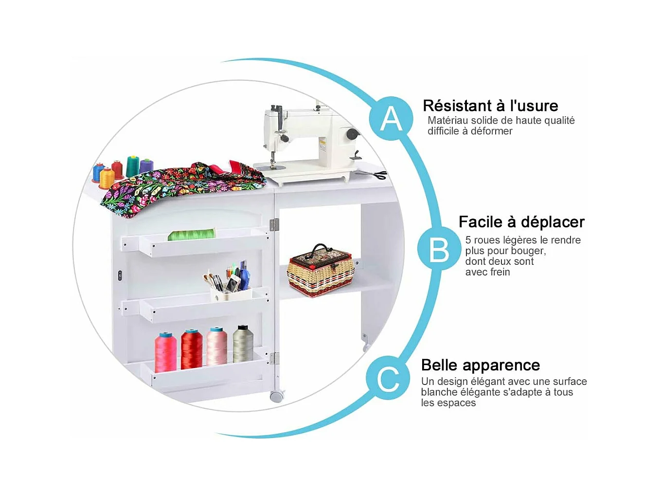 Table de Couture Pliante Meuble pour Machine à Coudre avec 3 Etagères pour Bobines et Roulettes verrouillables en Bois