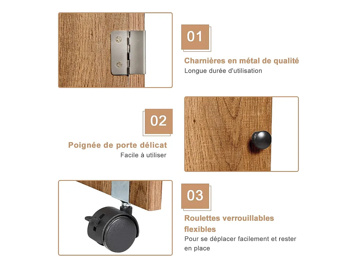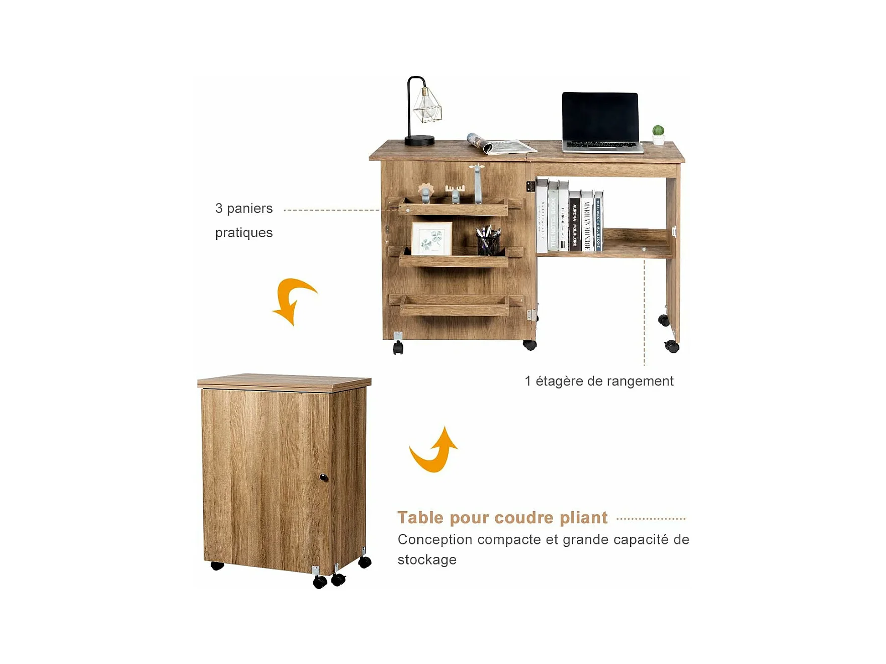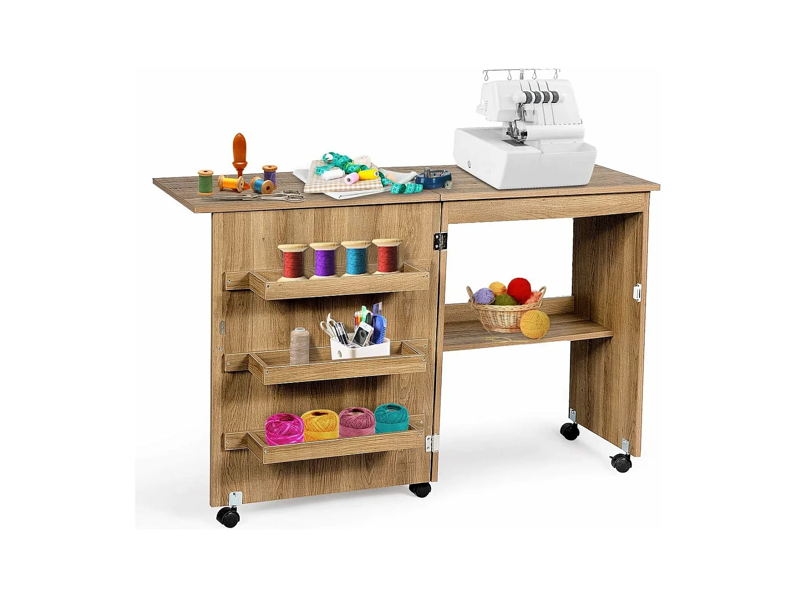 Table de Couture Pliante Meuble pour Machine à Coudre avec 3 Etagères pour Bobines et Roulettes verrouillables en Bois