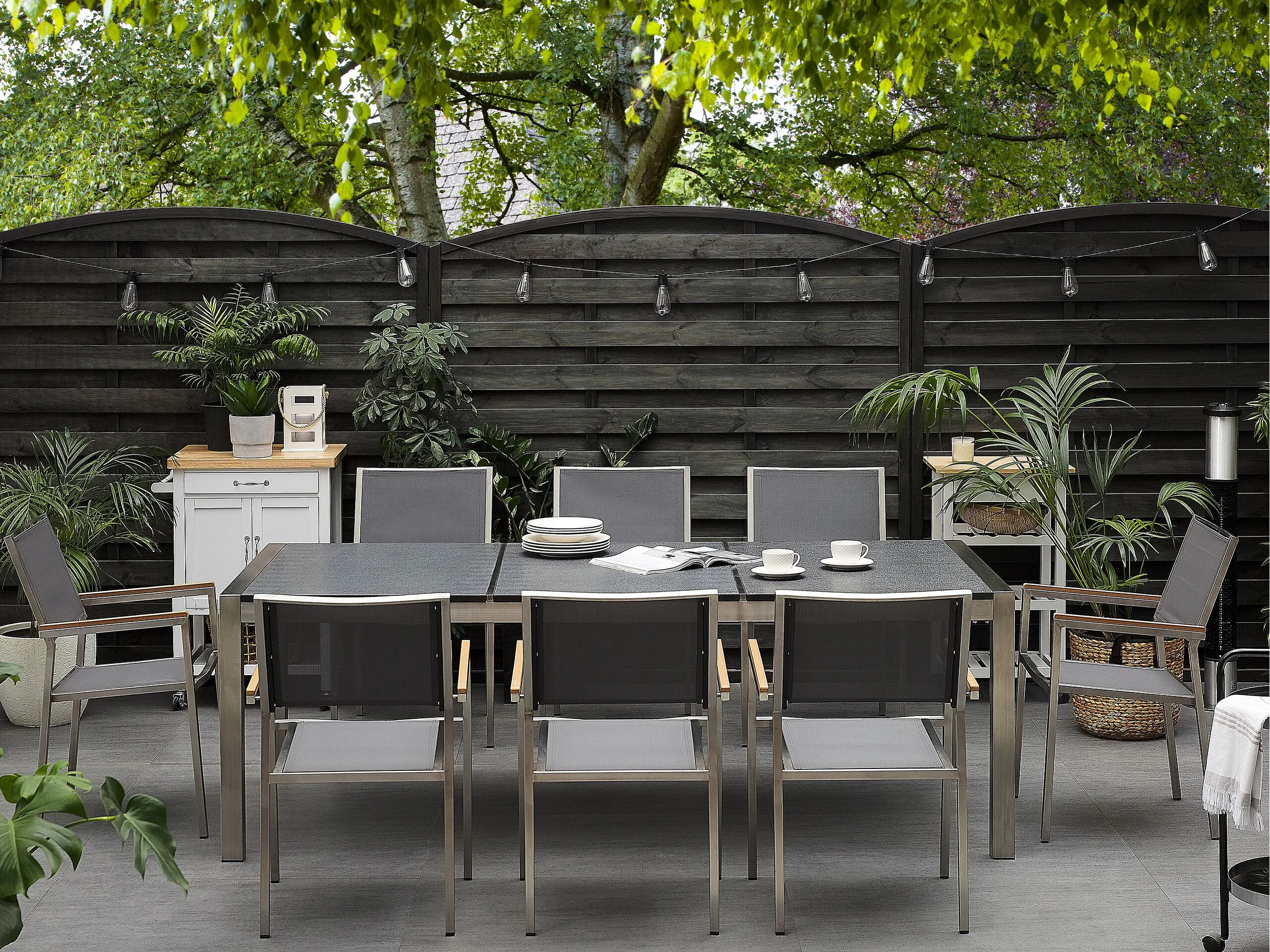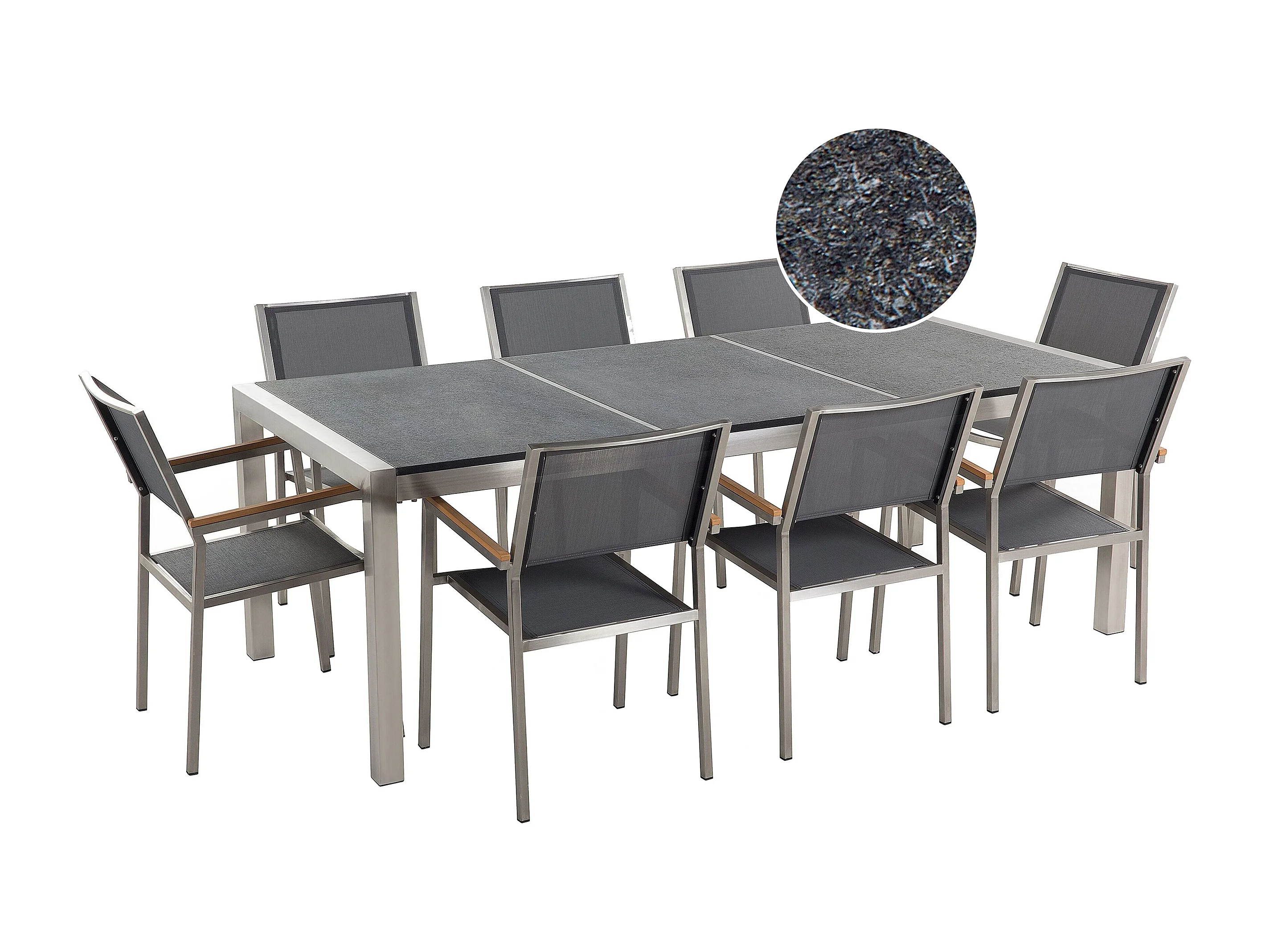 Salle à manger de jardin 8 places GROSSETO Triple plaque Granit Flammé Noir/gris