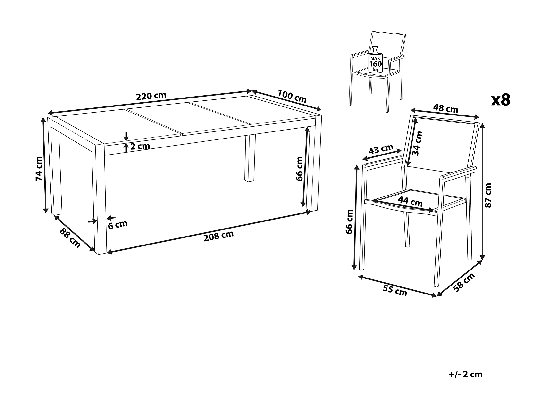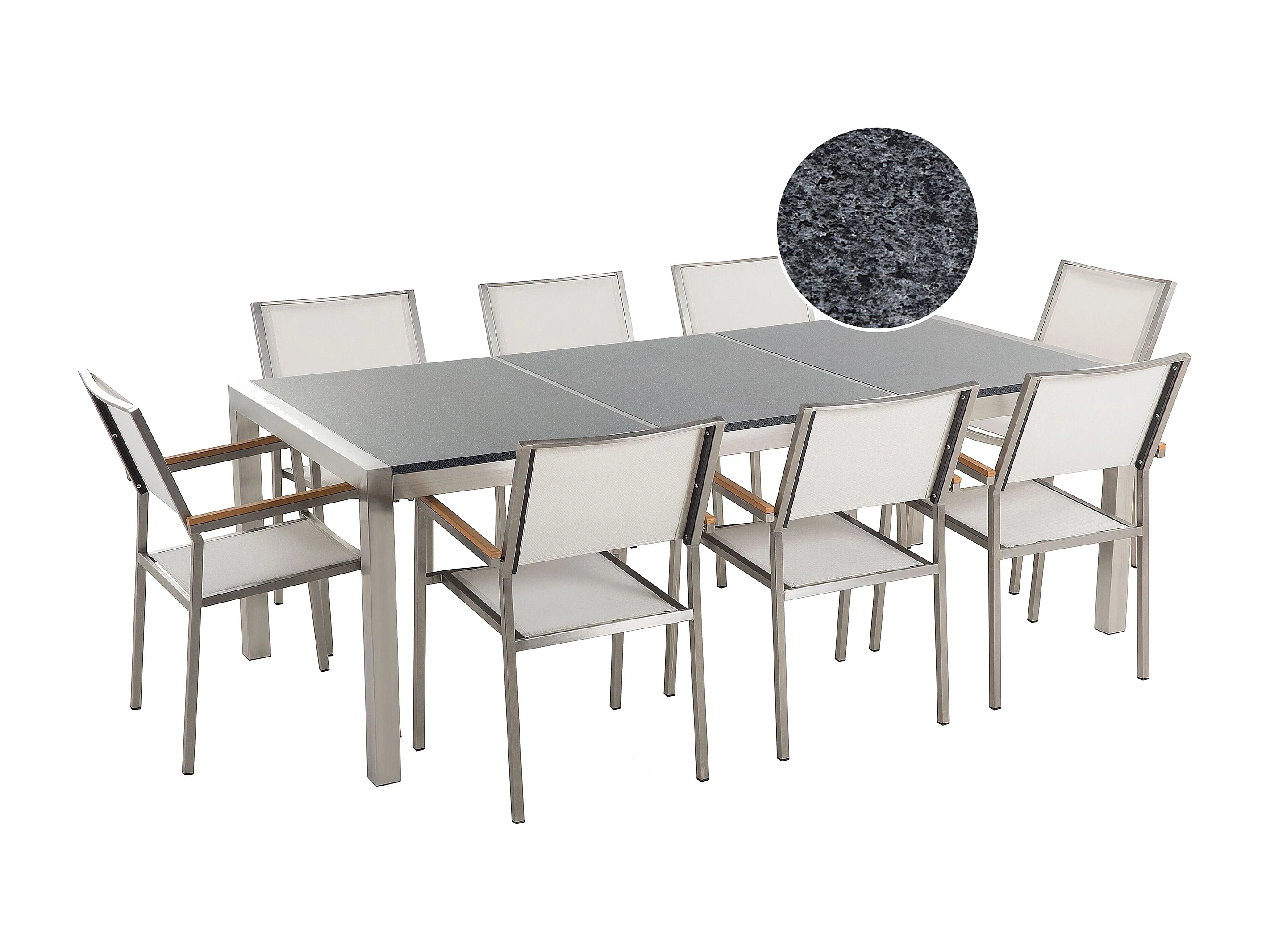Salle à manger de jardin 8 places GROSSETO Triple plaque Granit Poli Gris/blanc